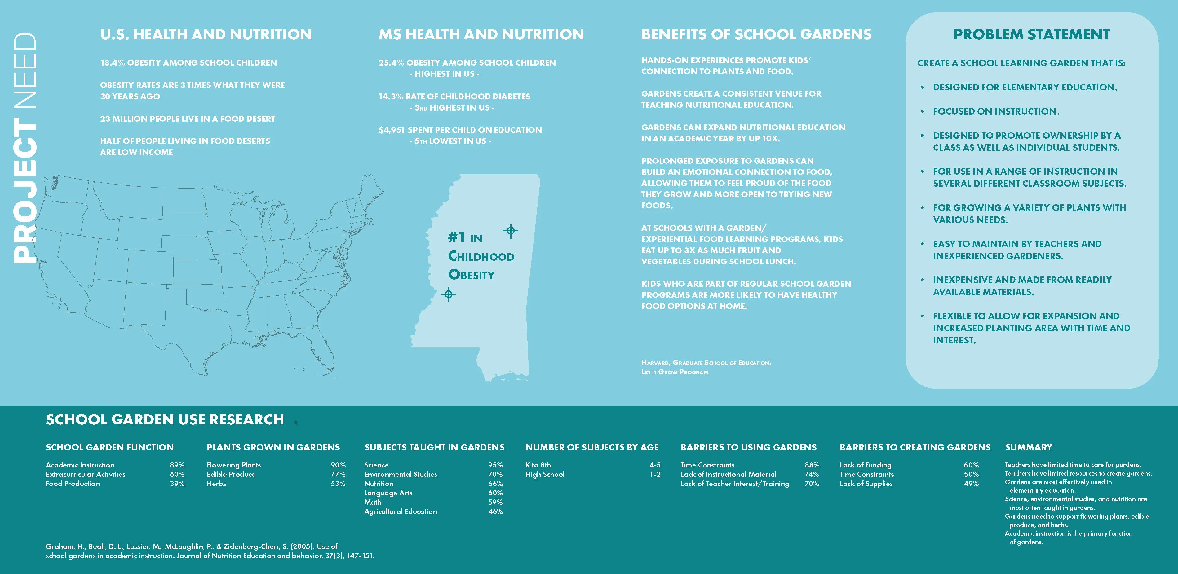 This dynamic, community service, design project began with exploring the potential for a learning garden at an elementary school and evolved into designing a prototype for learning gardens focused on health, food, and nutrition education. Through research into learning gardens’ physical, pedagogical and administrative needs, the team determined that there was a major divide between the way gardens were used and how they were being built. Most applications envision a type of hope garden or miniature farm, designed for production where kids are active “farmers” cultivating the garden throughout the year. While this model has been successfully executed with incredible examples like King Middle School in Berkeley, it is an incredibly resource intense and is beyond the reach of most struggling schools. A study surveying school principals found that funding and maintenance were the two biggest barriers to school learning gardens, and that most of them aren’t used for producing food but learning about it.