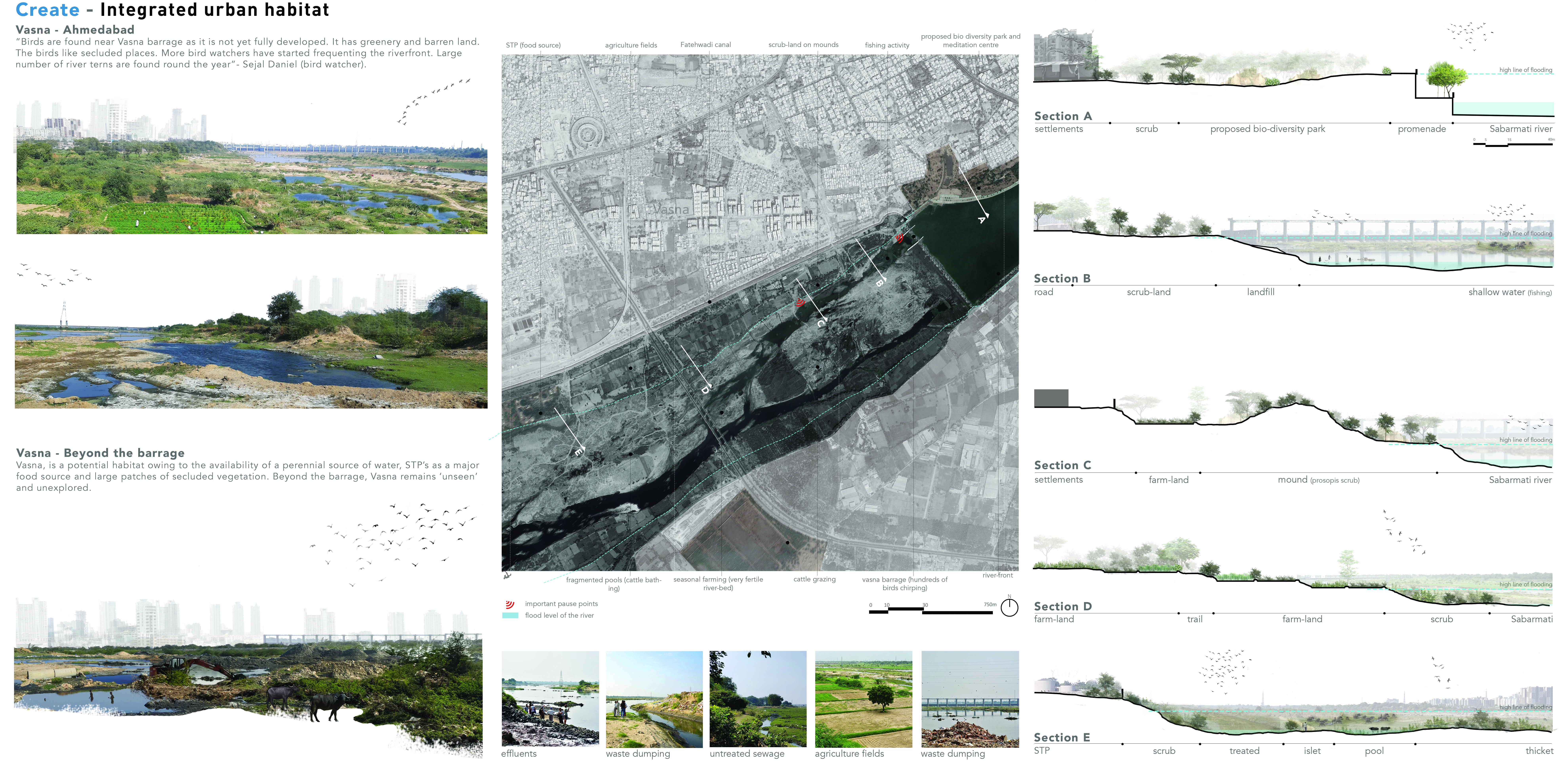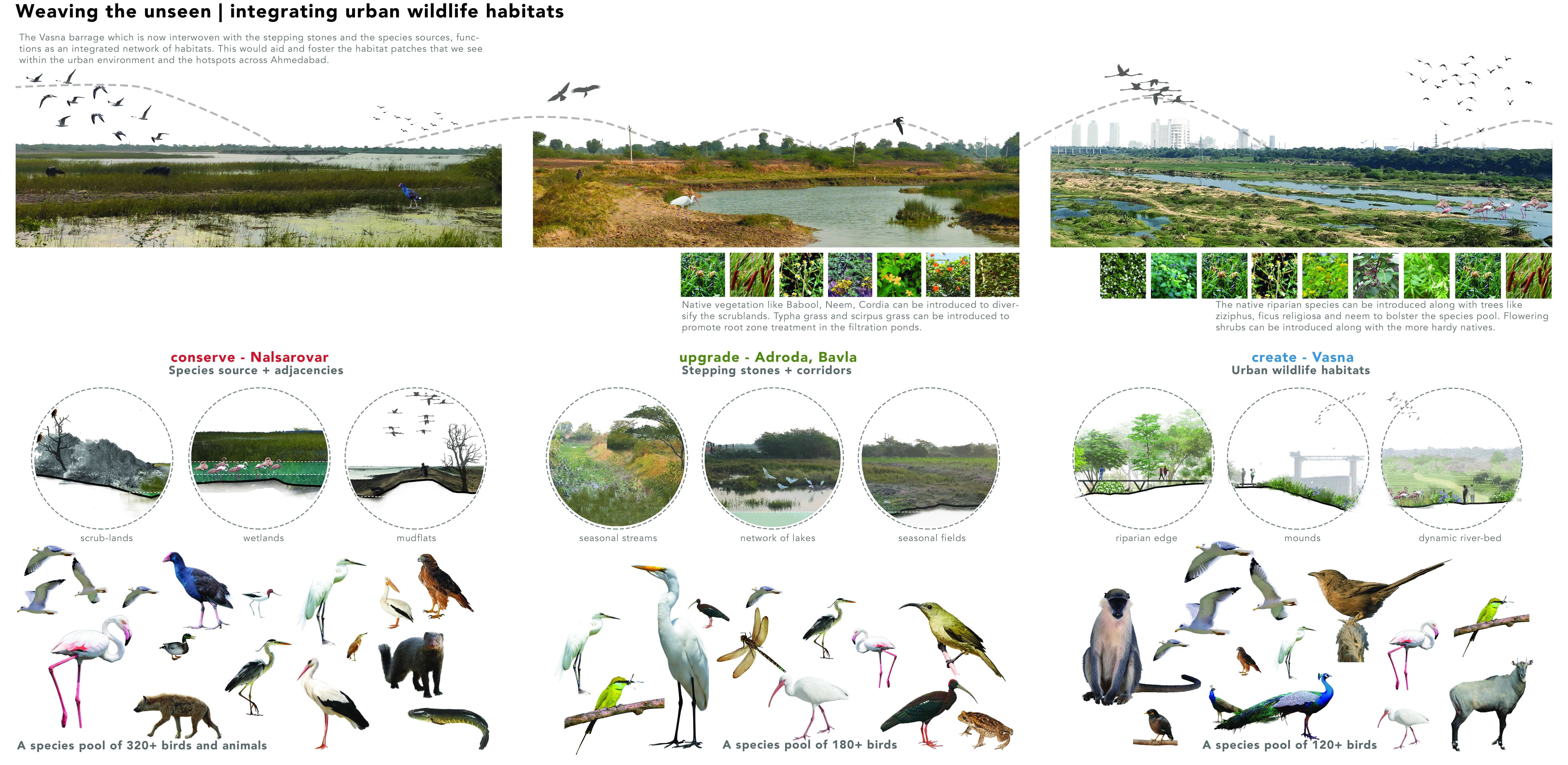 In the midst of rapid urbanization and climate change, wildlife habitats have become indispensable components of the urban fabric and landscape of cities. Ahmedabad, one of the ten largest cities in India by population, experiences a semi-arid dry climate but has a rich resource of fauna and flora. But, the expanding city tends to fragment the remnant habitats, forested patches, and to transform extensive areas into isolated islands within predominant urban environments. Hence, where they remain isolated and small, the chances of maintaining high wildlife diversity are relatively small. In this scenario, movement of urban fauna has to be considered as an essential need for its survival in the longer run. The project investigates the possibility of an interwoven network of habitats (species sources, stepping stones, urban habitats) which would facilitate movement across the urban region and its adjacencies. It envisions to integrate the remnant urban habitats into a system of linked patches that incorporates the ‘unseen’ components of the Eco-system.