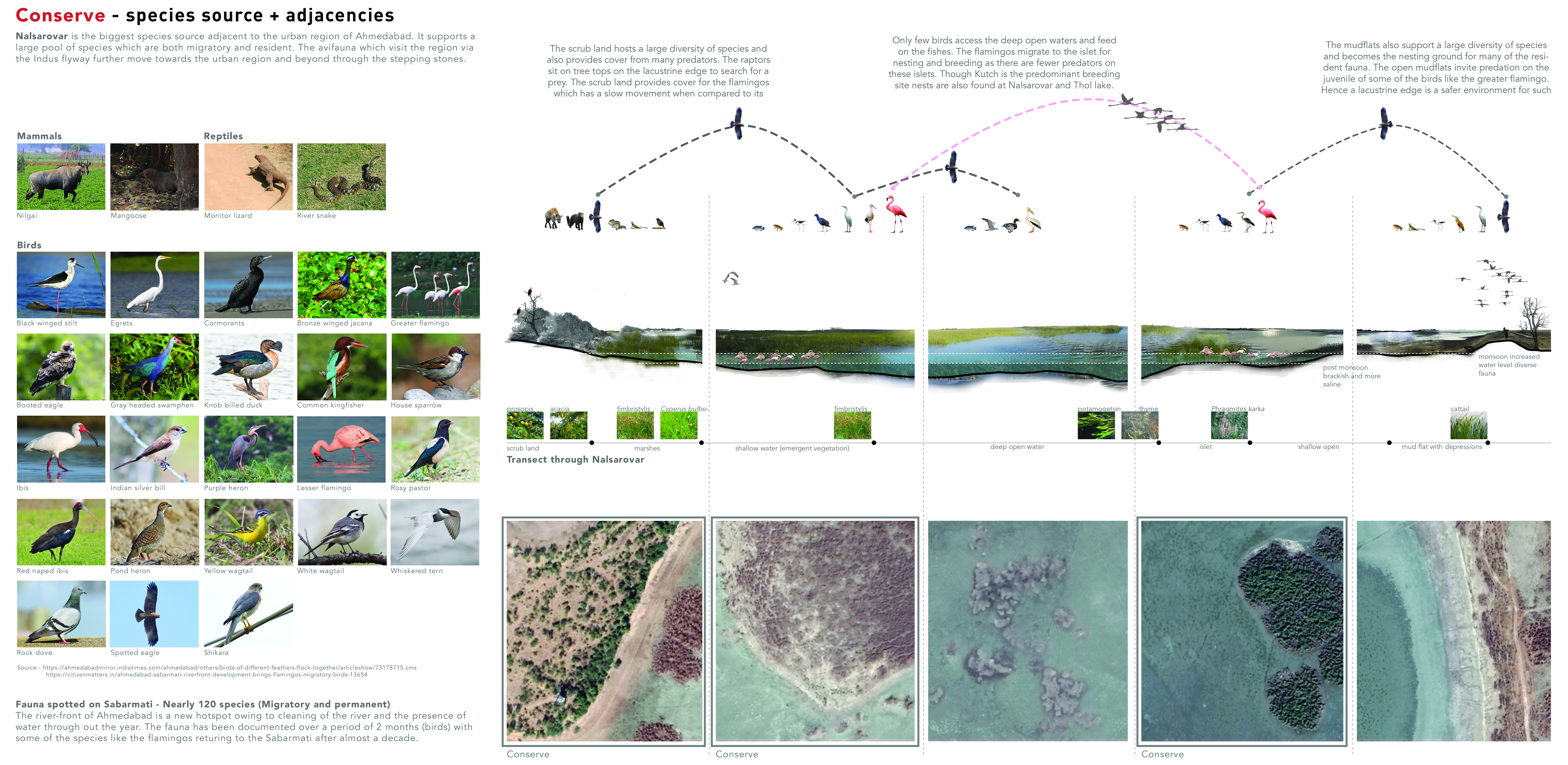 Species reserves/sources are large contiguous natural areas that sustain a large pool of native species that move across to an urban area. Typically, a large natural/semi-natural patch is either within or adjacent to the all built metro area. Nalsarovar is located 60 kilometres to the southwest of the city of Ahmedabad. It is the biggest species reserve/source within the urban region and is a critical destination for migratory birds which travel along the Indus flyway to the Indian subcontinent. Certain patches of landscapes within Nalsarovar are important breeding sites for many resident and migratory birds including the greater flamingos.