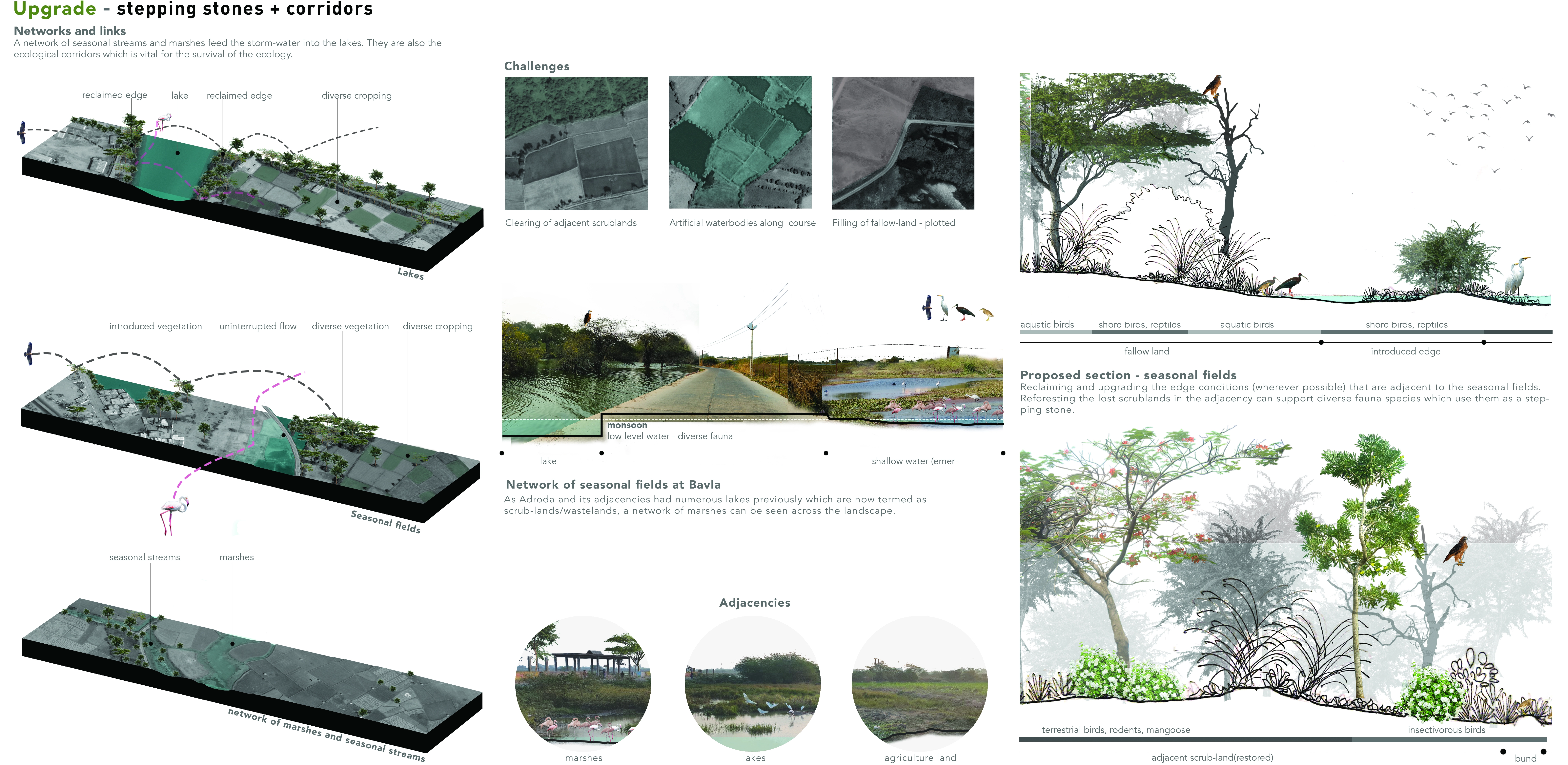 As the city of Ahmedabad, India, continues to grow, its urban wildlife habitats are shrinking; moreover, they are becoming increasingly disconnected from each other, which threatens mobility among the species that inhabit them. Yet Ahmedabad’s surrounding region does boast several oases in the form of rivers and lakes that could be knit together to form a linked network of habitats. By creating stepping stones of hospitable environments between larger reserves, this study proposes implementable interventions that would create corridors to facilitate wildlife movement, while also preserving and restoring pockets of nature within the city.