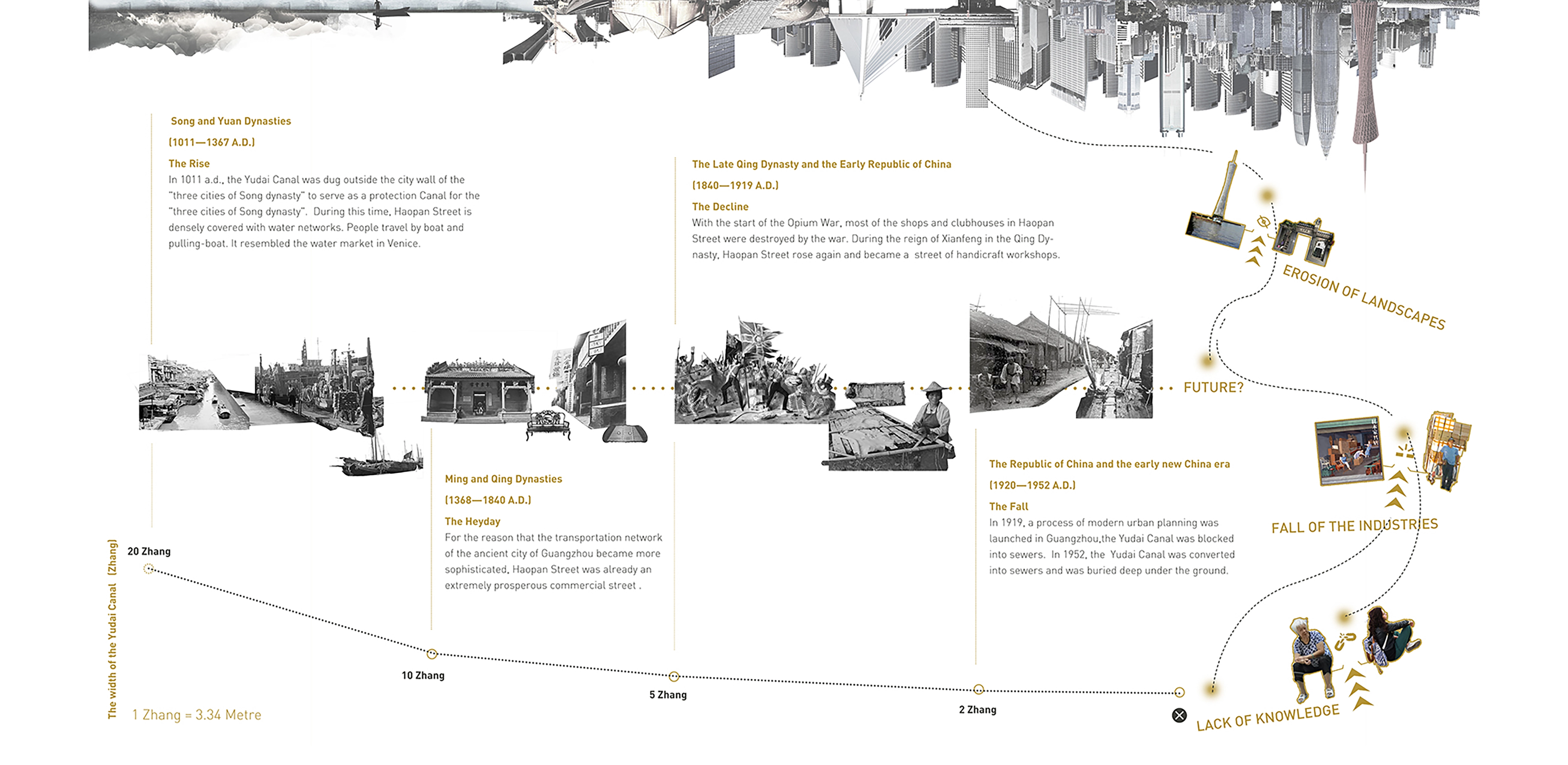 As a moat and typhoon shelter of the south of Guangzhou, Yudai Canal is blessed with great historic value and ecological wisdom that is crucial for dealing with urbanization of the present. Such content is the important part of what this project aims to convey to the audience. From the Song Dynasty to the Qing Dynasty (1010s-1900s) in China, the businesses along the Yudai Canal thrived and gradually, Haopan Street became the commercial and cultural center of Guangzhou. However, due to excessive development, in the 1930s, Yudai Canal had become a gutter, and was converted into a sewer in 1952.