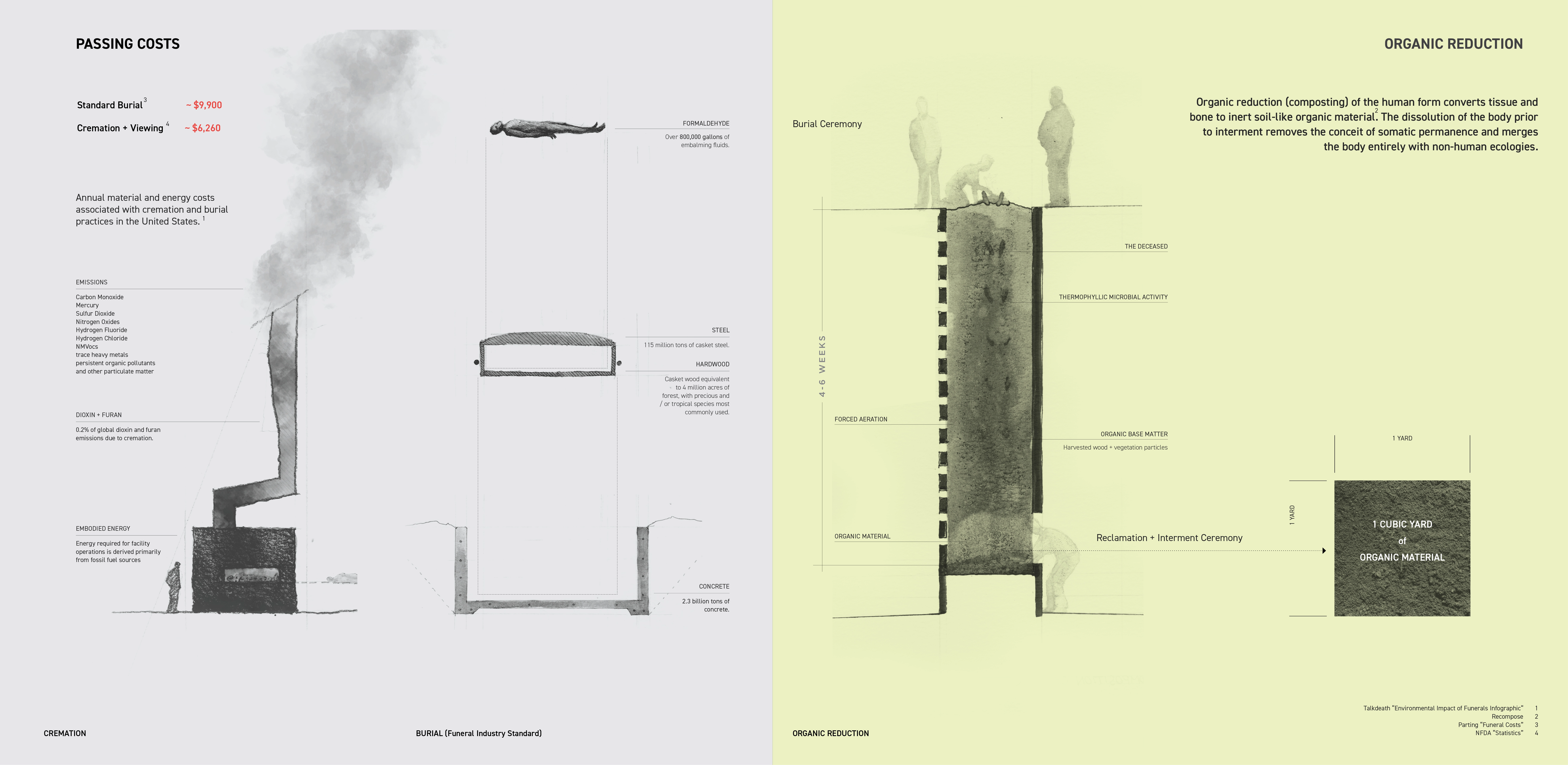 The popularity of ‘green burials’ have steadily increased in the United States over the last two decades. Green burial practices minimize negative environmental impacts through forgoing the use of embalming fluids and requiring that only non-toxic and biodegradable materials accompany the body in the earth. In an additional step towards environmental responsibility, conservation cemeteries have committed burial fees to establish and grow public land trusts that preserve ecosystems and prohibit future development. The recently legalized practice of organic reduction relies on thermophyllic microbial activity to transform human tissue and bone into inert soil-like organic material over the span of 4-6 weeks. This transformation occurs down to a molecular level, and results in the complete dissolution of the human body prior to interment.