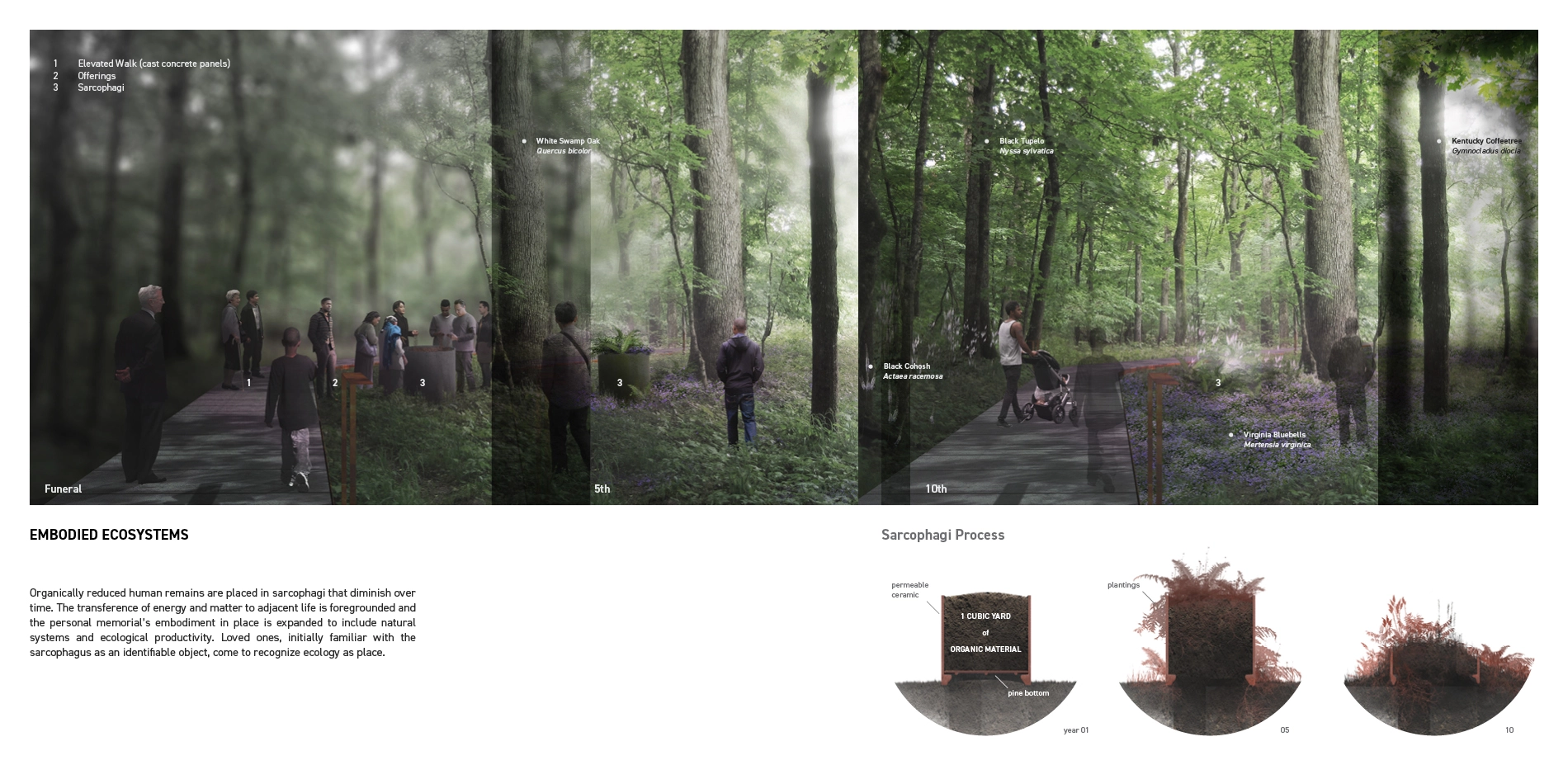 In the context of mass extinction, climate change and global pandemic, an environmentally ethical funeral practice fuses the loss of individual with the diffuse and existential nature of ecological loss. These layered forms of grief operate at multiple temporal scales and suggest a new typology of memorial landscape that engages natural cycles of a duration that exceeds the human life. To address these forms of grief, this funerary landscape offers biodiverse public spaces that meaningfully rejoin bodily death to broader natural cycles of ecological metamorphosis. Rituals of commemoration, management, and activism would alchemize to unexpected results when program of memorial, ecological preserve, and space for collective action merge. -