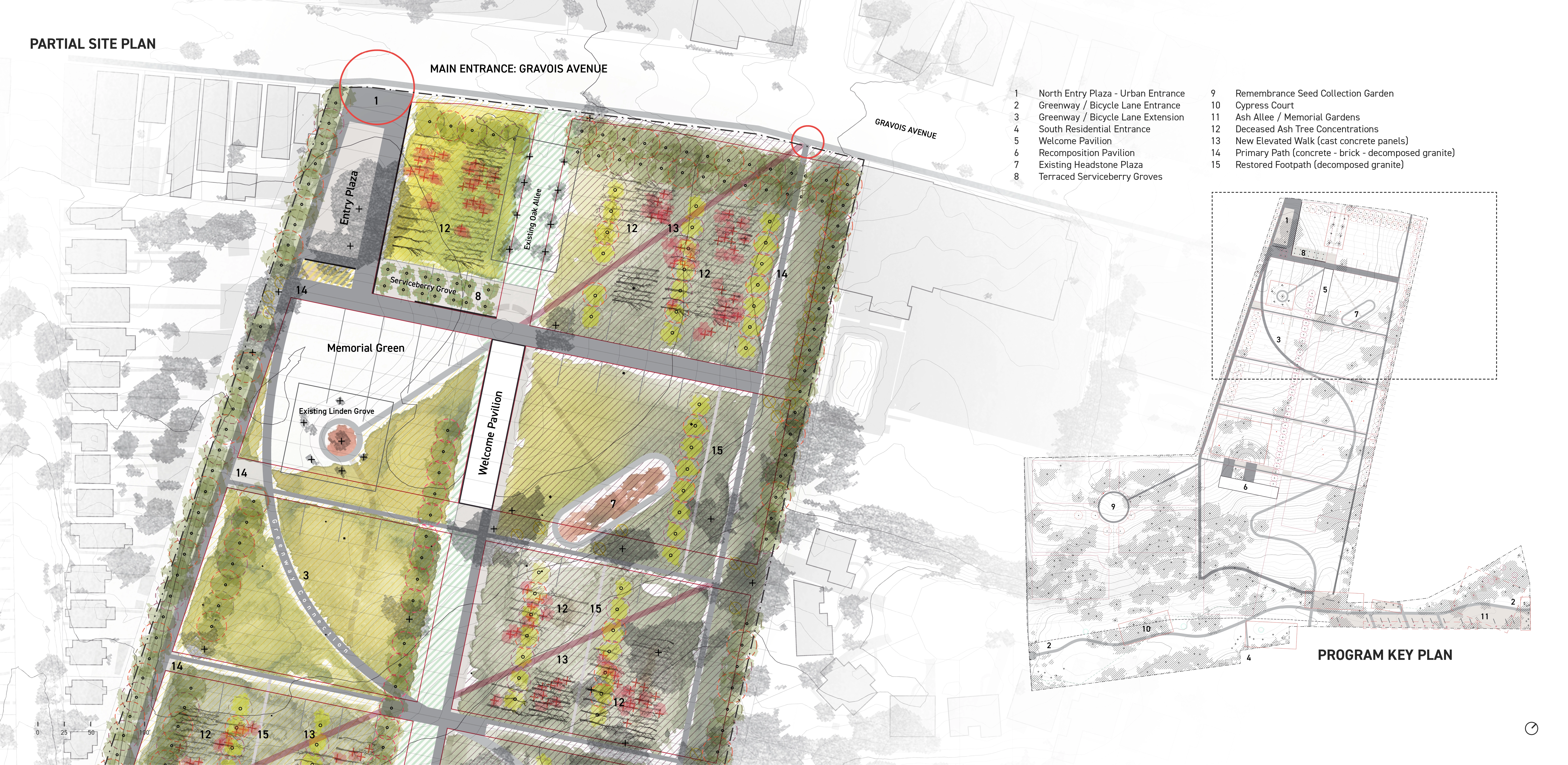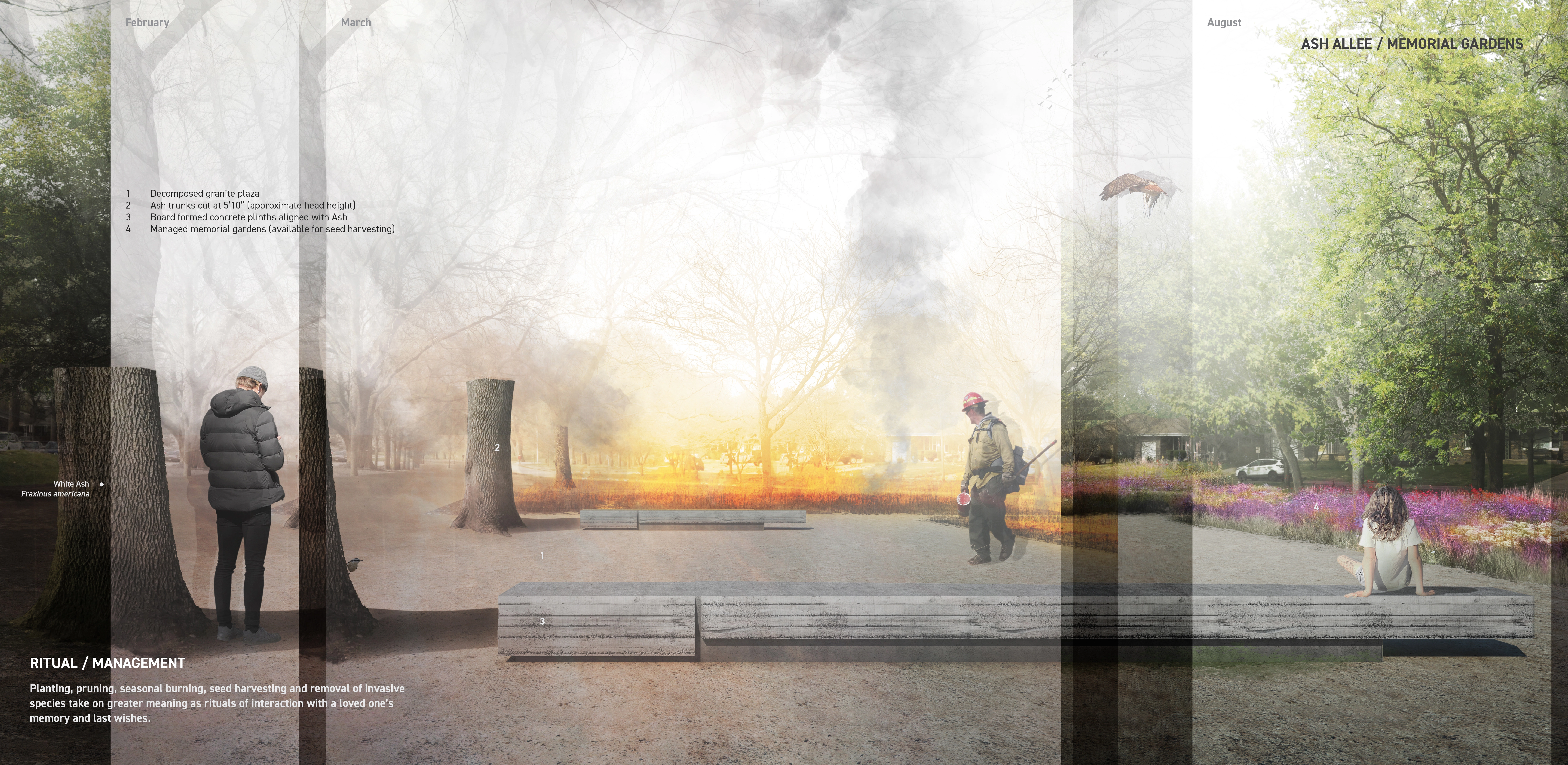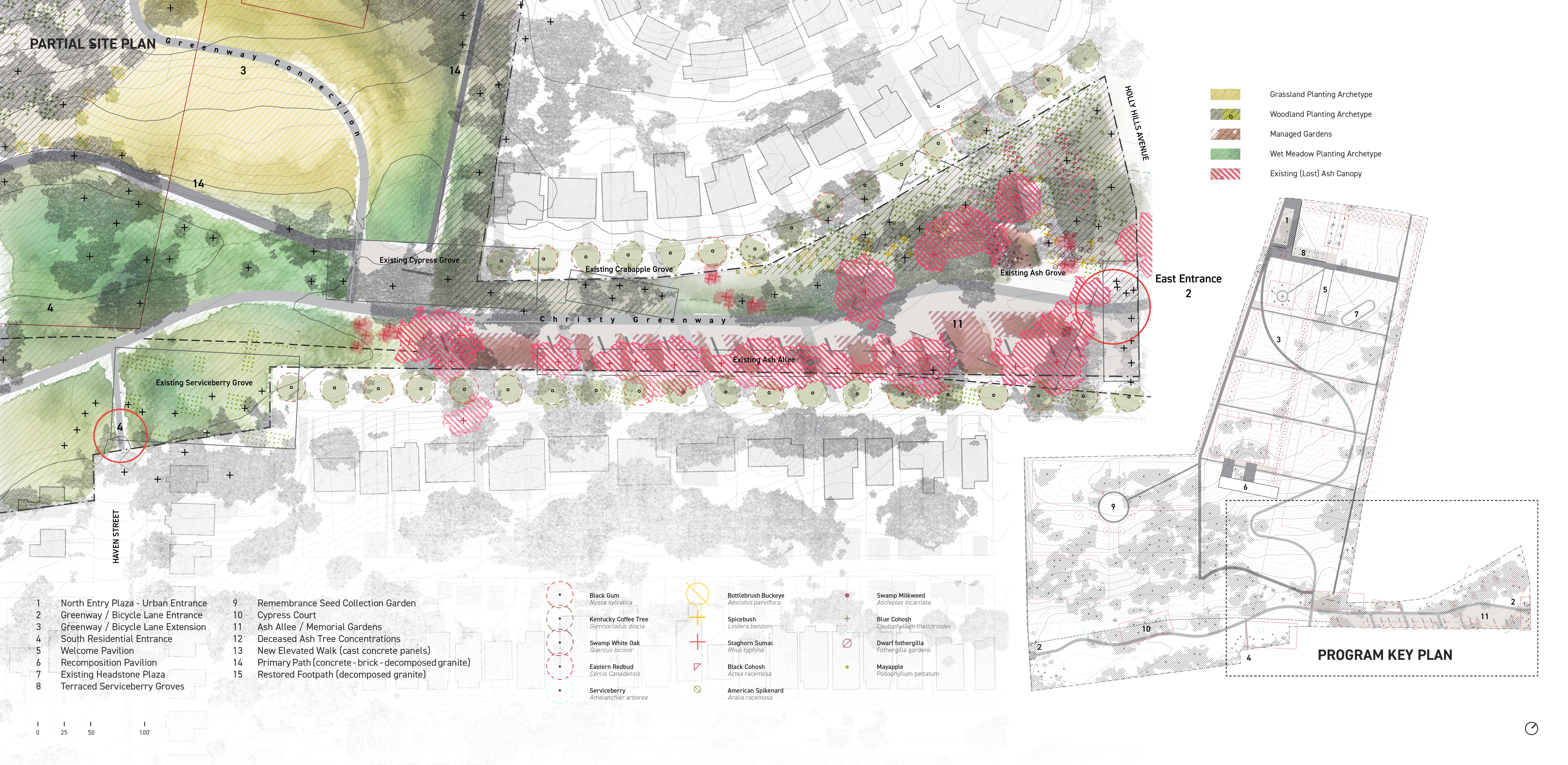 Katrina Simon has written that cemeteries “exist to be read” and that funerary landscapes “reflect as well as shape human experience, in all of its diversity and ambiguity, and what we know or believe about death will shape the landscape of death, as well as how we read or experience it.” The redesigned Saint Marcus Memorial Preserve provides a variety of loosely programmed spaces as settings for families and communities to adapt traditions and practices to designed ecosystems. A variety of ecological and spatial settings provide families the opportunity to choose where and how a loved one’s remains are committed to the earth and the systems that sustain it. The site’s designed plant communities accentuate expressive reproductive morphology. Seeds, pods, and fruit serve as recognizable indicators to natural cycles of birth, death, decay, and metamorphosis. Idiomatic rituals of interacting with landscape through planting, pruning, seasonal burning, seed collection and removal of invasive species take on greater meaning as acknowledgments of a loved one’s memory and last wishes. These unplanned ‘cultural overlays’ will deepen the experience of place and contribute to fostering biodiversity. -
