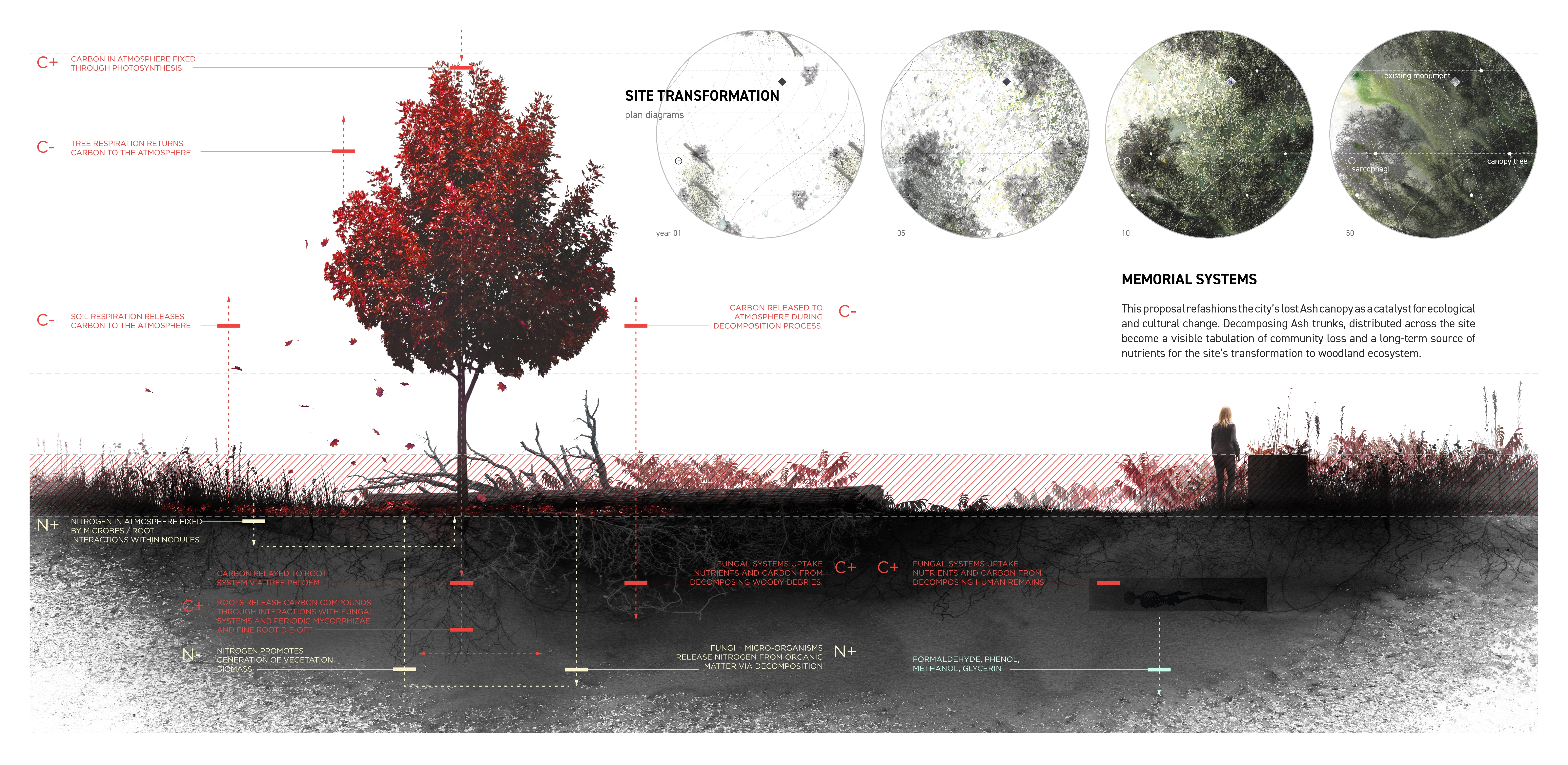Dark Matter investigates organic reduction as a means of promoting biological and cultural diversity in urban cemeteries. Dissolution of the body prior to interment foregrounds the transference of matter to adjacent life; the memorials embodiment of place is expanded to include natural systems and ecological productivity. The funerary landscape is decentralized from static site of memorial to evolving memorial system that invites engagement with the living.