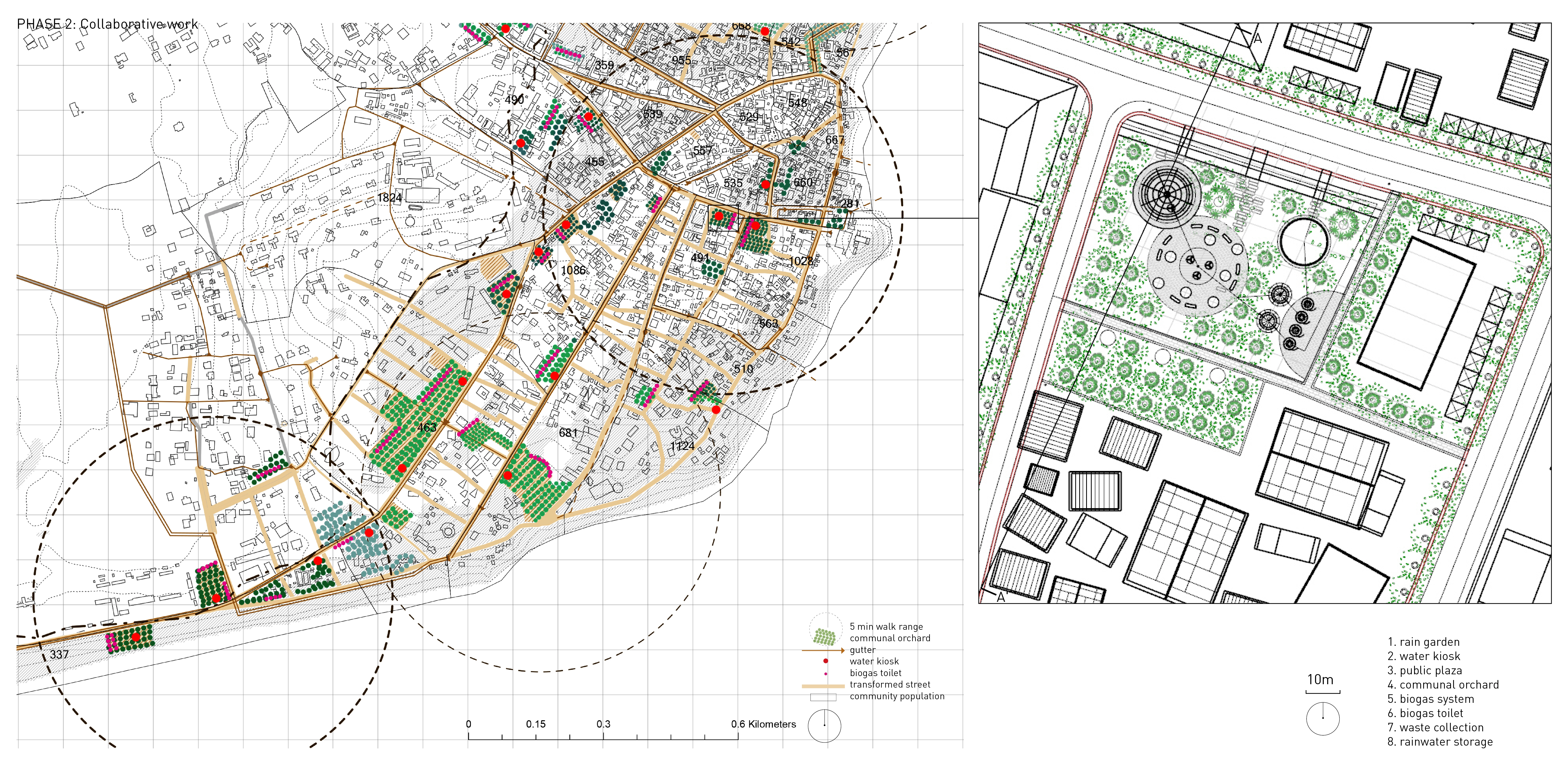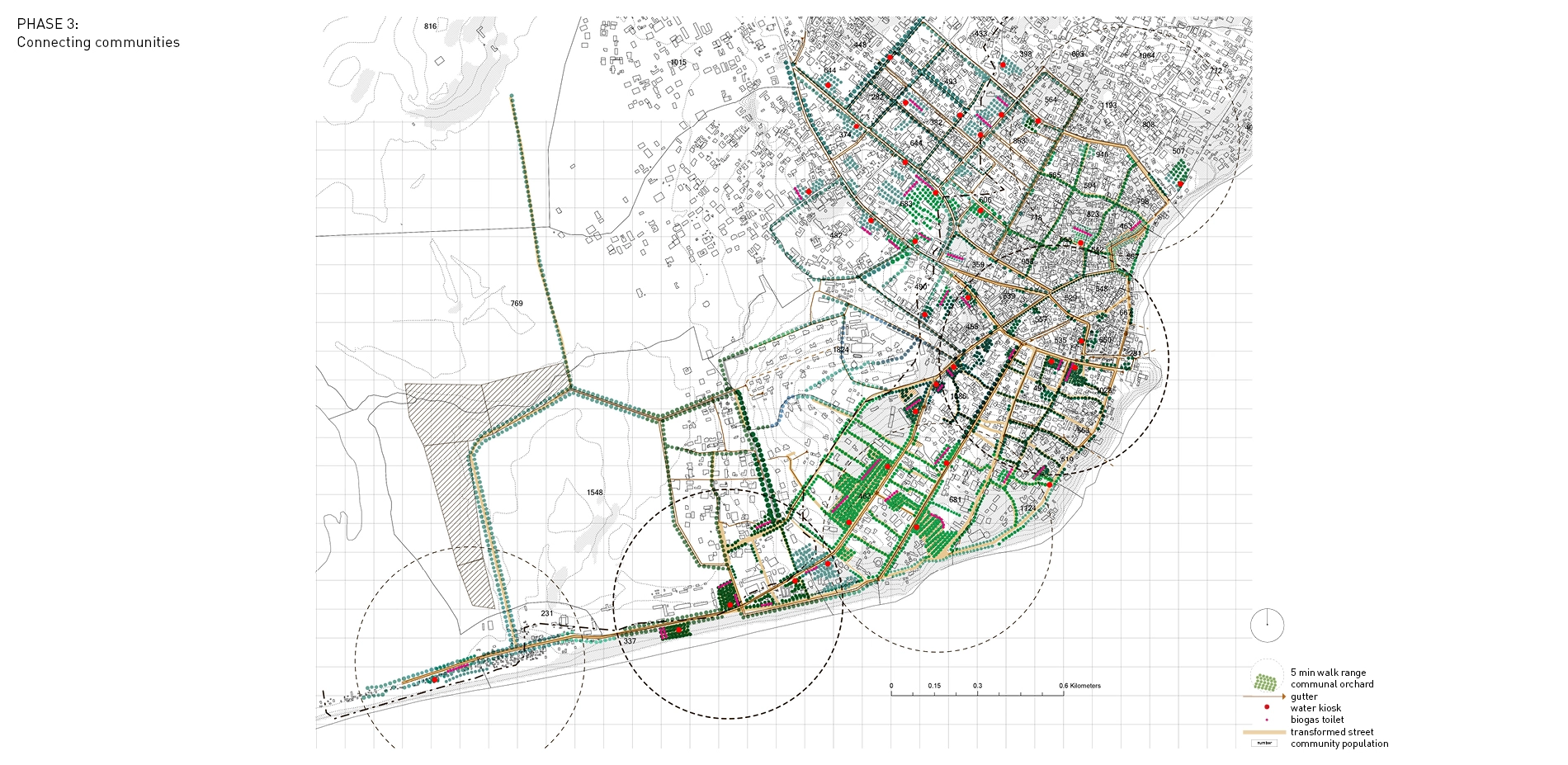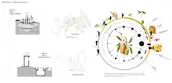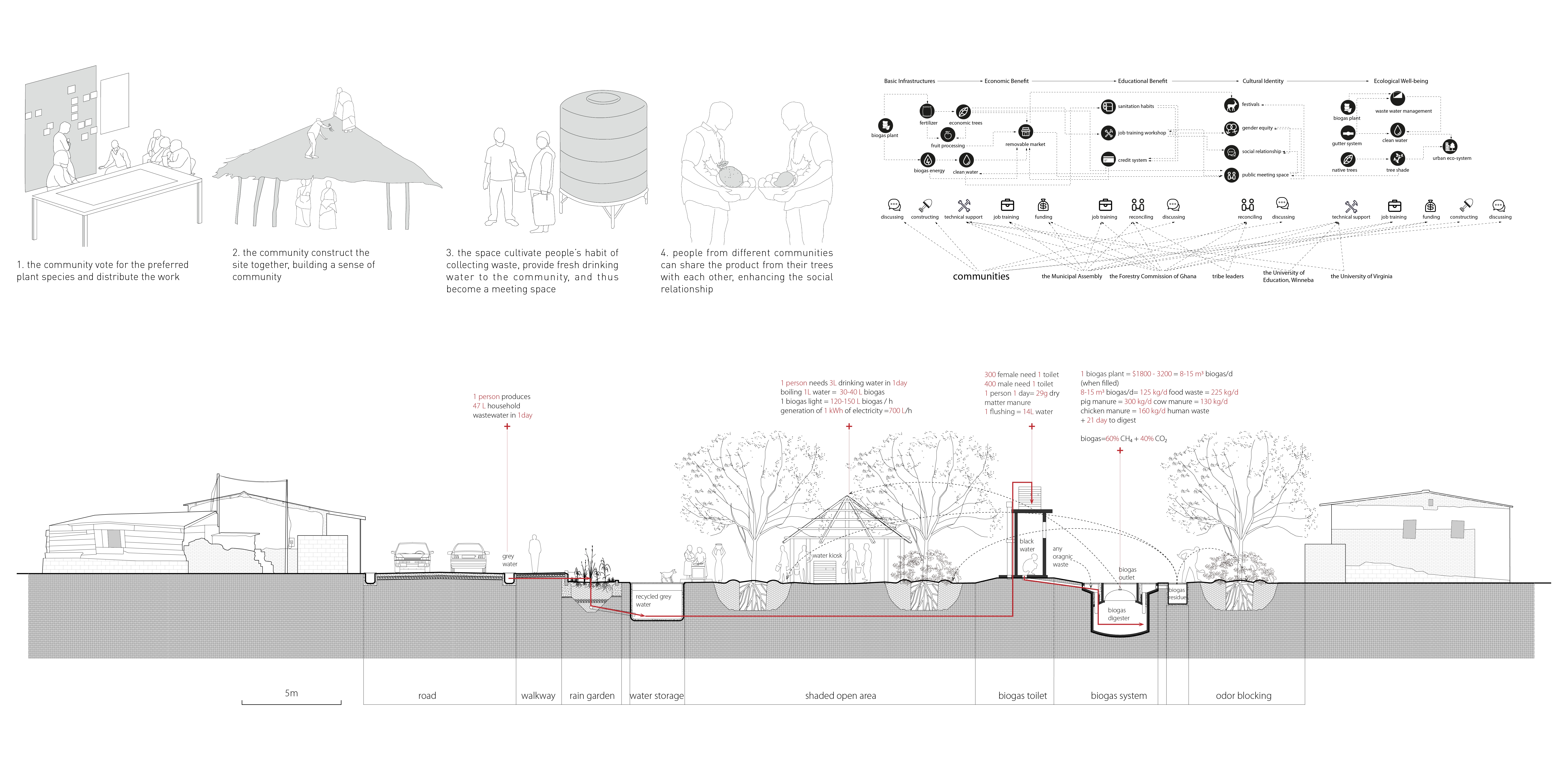 As an alternative to top-down government-led projects, this project calls for residents to build sanitation infrastructures for their own communities. The proposal integrates a gutter system, rain garden, water kiosks, orchard, communal biogas toilets, and waste collection system into its landscape design.