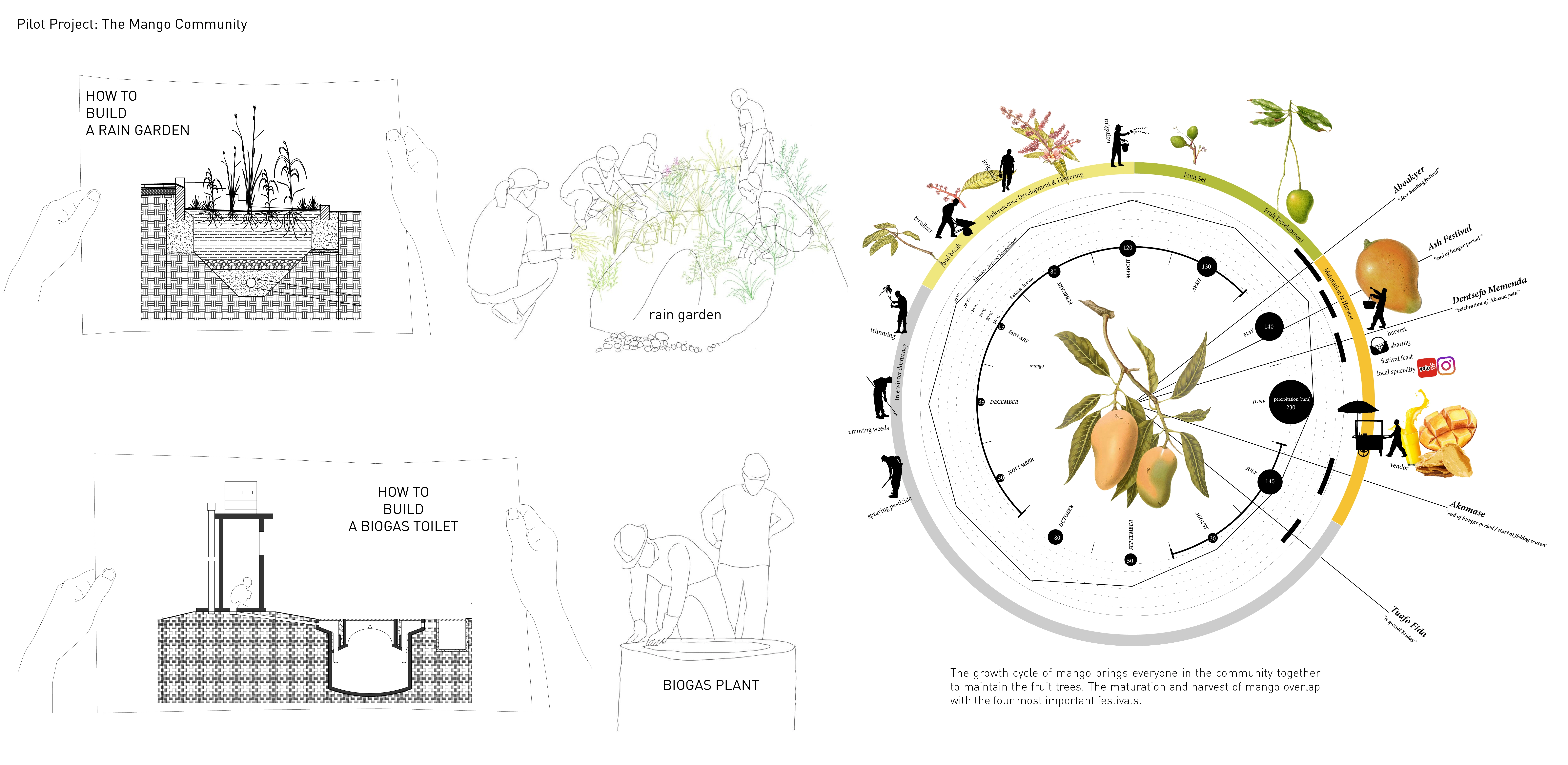 In the pilot project, promotion of organic waste collection and biogas toilet systems cultivates people’s sanitation habits. The water kiosk with biogas light will be the first lighted public space at night around the neighborhoods. Mango trees are fully grown in 3-6 years. Maturation and harvest of mango overlap with the four most important festivals in Winneba. People may collectively harvest the mango fruit, enjoy the fruit and sell them along the street.