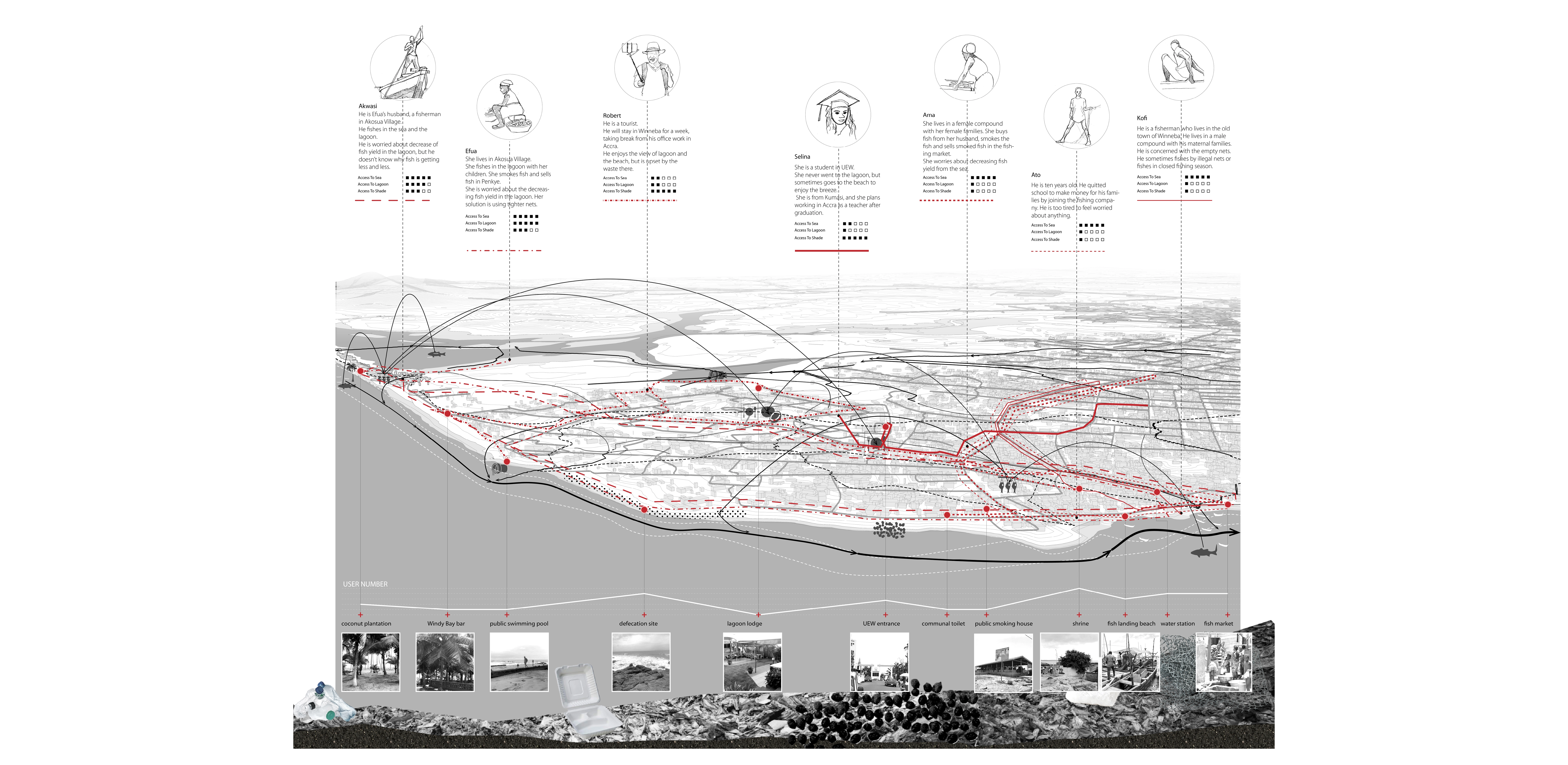 Winneba, just like other coastal cities in West Africa, is suffering from enormous social and ecological challenges, such as inadequate infrastructure, water sanitation, food insecurity, environmental degradation, and social conflicts. This project initiates from understanding the socio-ecological role of Ghanaian public space. Research into community power in conservation, in particular, that of sacred groves, reveals its unique role in legitimizing social arrangements, addressing a sense of belonging, and reconcile differences. The success in maintaining these small eco-systems through local efforts can inform better policy-making.