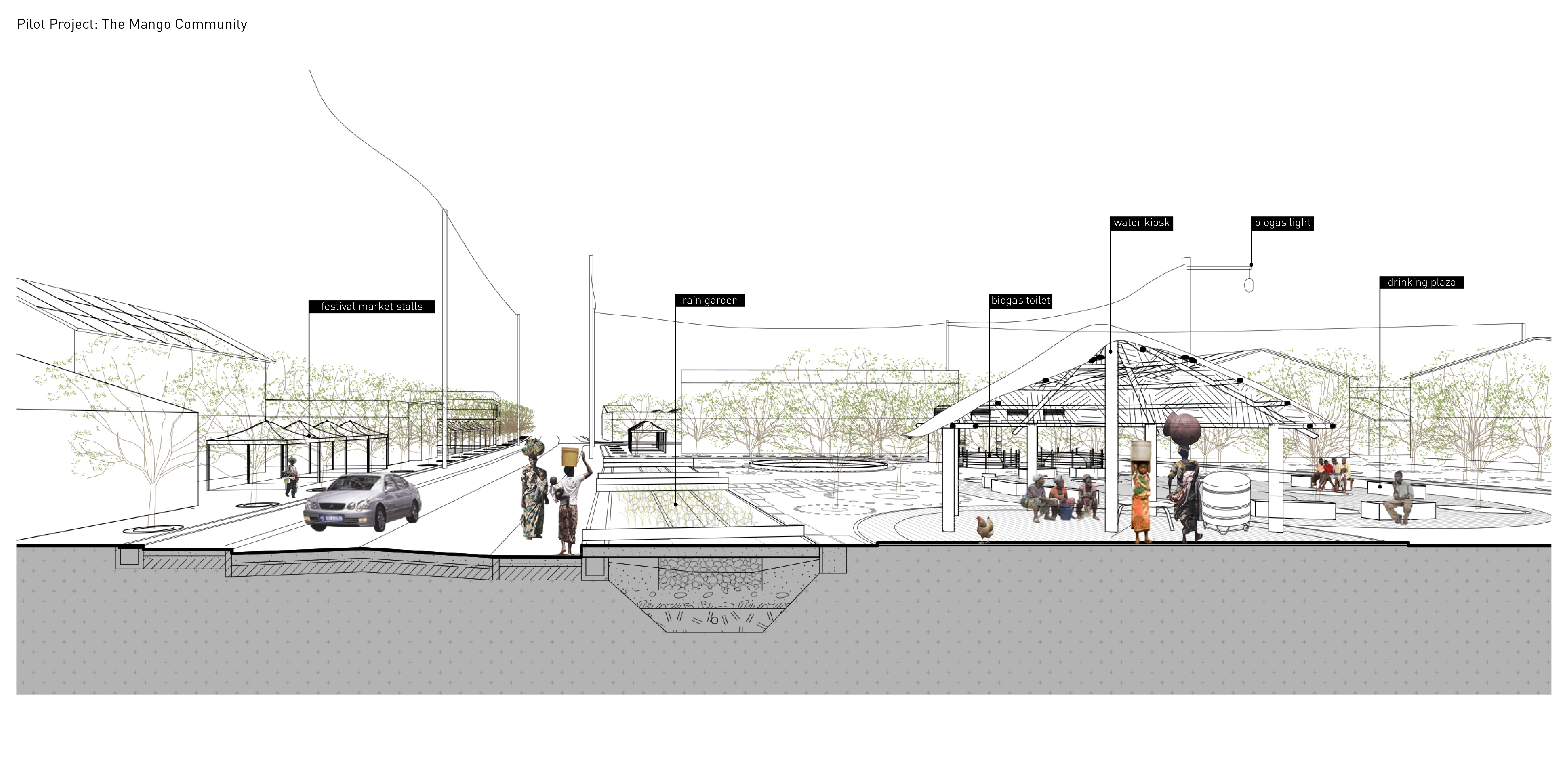 Complex social structures and inadequate infrastructure meet in Winneba, Ghana, where this group proposes a shade-giving, water-producing, waste-treating piece of sanitation infrastructure loosely based on local sacred groves. A pilot project initiates a biogas toilet system that converts waste to energy, allowing for on-site water purification and distribution; and fertilizer, feeding communal mango trees that provide both fruit and shade. Freeing women in the community from the burden of gathering water from farther afield, the project—built by residents, and expandable to adjacent neighborhoods over time—melds ecological benefit with social equity.