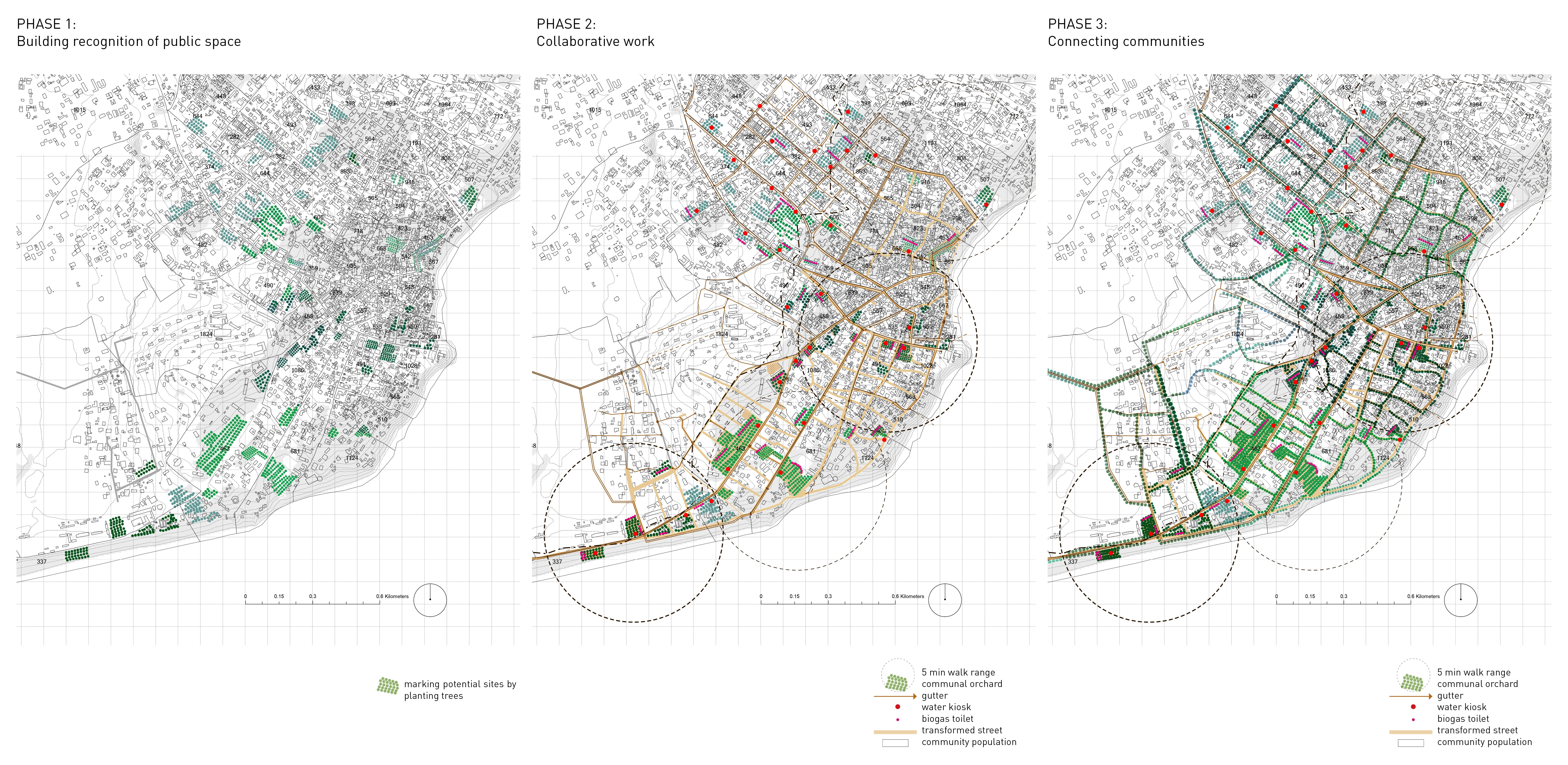 Drawing inspiration from social research and local traditions, this project proposes a network of vegetated public spaces that function as a catalyst to initiate ecological and social transformation. It encourages bottom-up community participation in each of the three phases. In addition to amenities that enable access to tree shade, clean water, public toilets, bio-energy, and food, these spaces provide a connection among residents regardless of their origin and social status. Through collaborative efforts, people of different social groups are brought together to improve social, economic, and environmental well-being. -