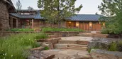 From the outset, the landscape architect emphasized restraint in material selection, color, and massing of any built structures. Regionally-sourced native materials, including reclaimed timber and lichen-covered stone, create a cohesive palette for architectural and landscape elements able to withstand the harsh mountain climate. During construction, the landscape architect developed subtle masonry details with the stone masons to communicate an authentic spirit of permanence including blending materials to achieve a graduated and organic appearance, and varying thicknesses on stair transitions. The result is a series of hand-built stone walls — a familiar element in Western ranch compounds — stairways, and outdoor gathering spaces that appear to disappear into the subtle tones and textures of the existing landscape. Tucked in a sheltered cove and bound by a trio of sandstone beams, a soaking tub rests beneath the branches of a twisted pine.