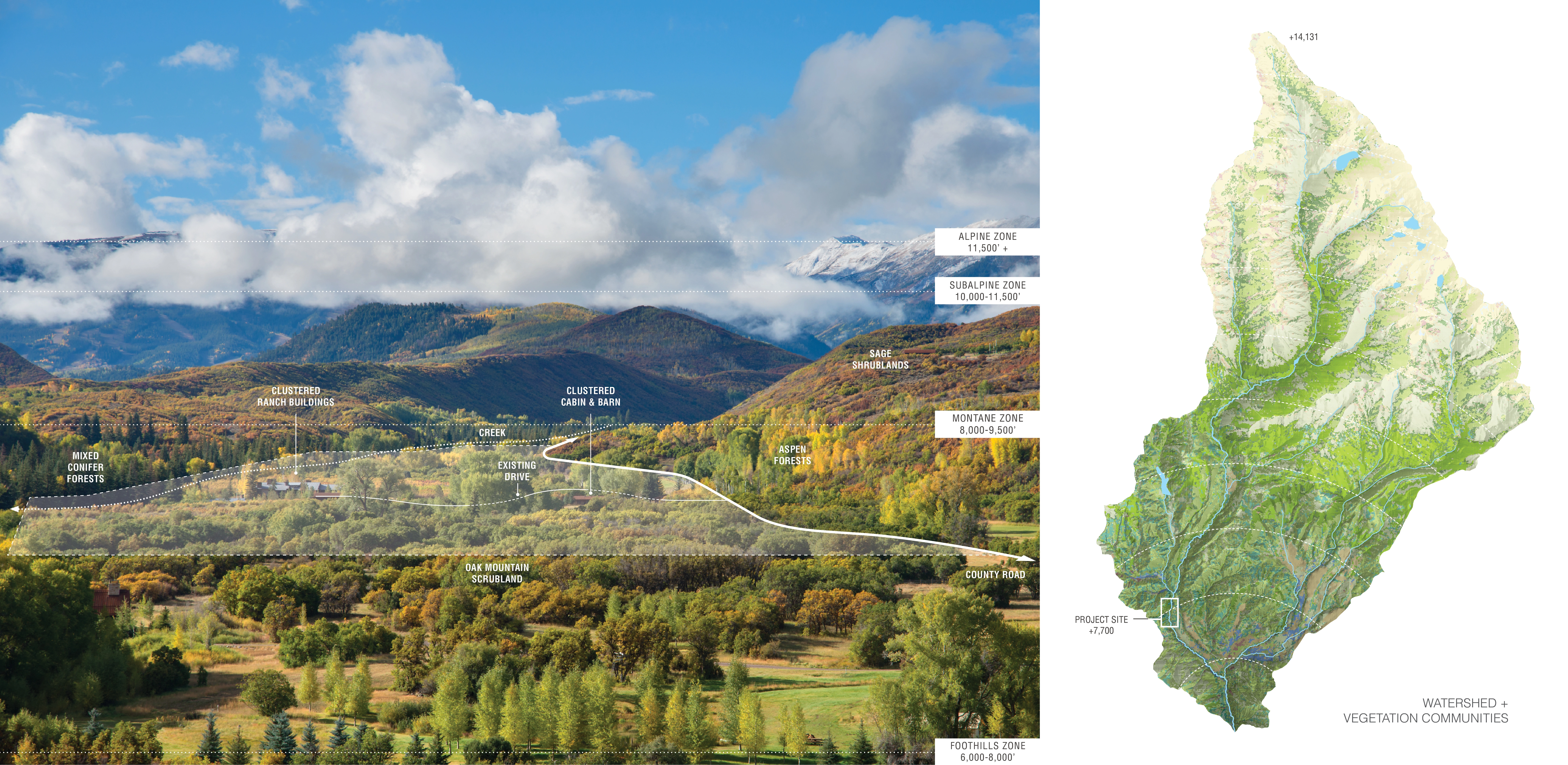 One the earliest homesteads in the Capitol Creek Valley, Charlie Mountain Ranch was redeveloped from its prolonged state of neglect into a family compound that reflects the owners desire to preserve a diverse and ecologically-rich landscape. Because the scenic, cultural, and ecological values of the ranch are integral to the rural nature of the surrounding community, the landscape architect’s work with the neighborhood caucus was imperative to ensure that the proposed design responded to regional development patterns, wildlife habitat, wildfire prevention, creek and water conservation, and responsible land management and stewardship. Site-specific environmental and viewshed analysis identified six distinct native plant communities around which low-profile structures are clustered, their subtly-crafted vernacular blending imperceptibly with the agrarian setting. -