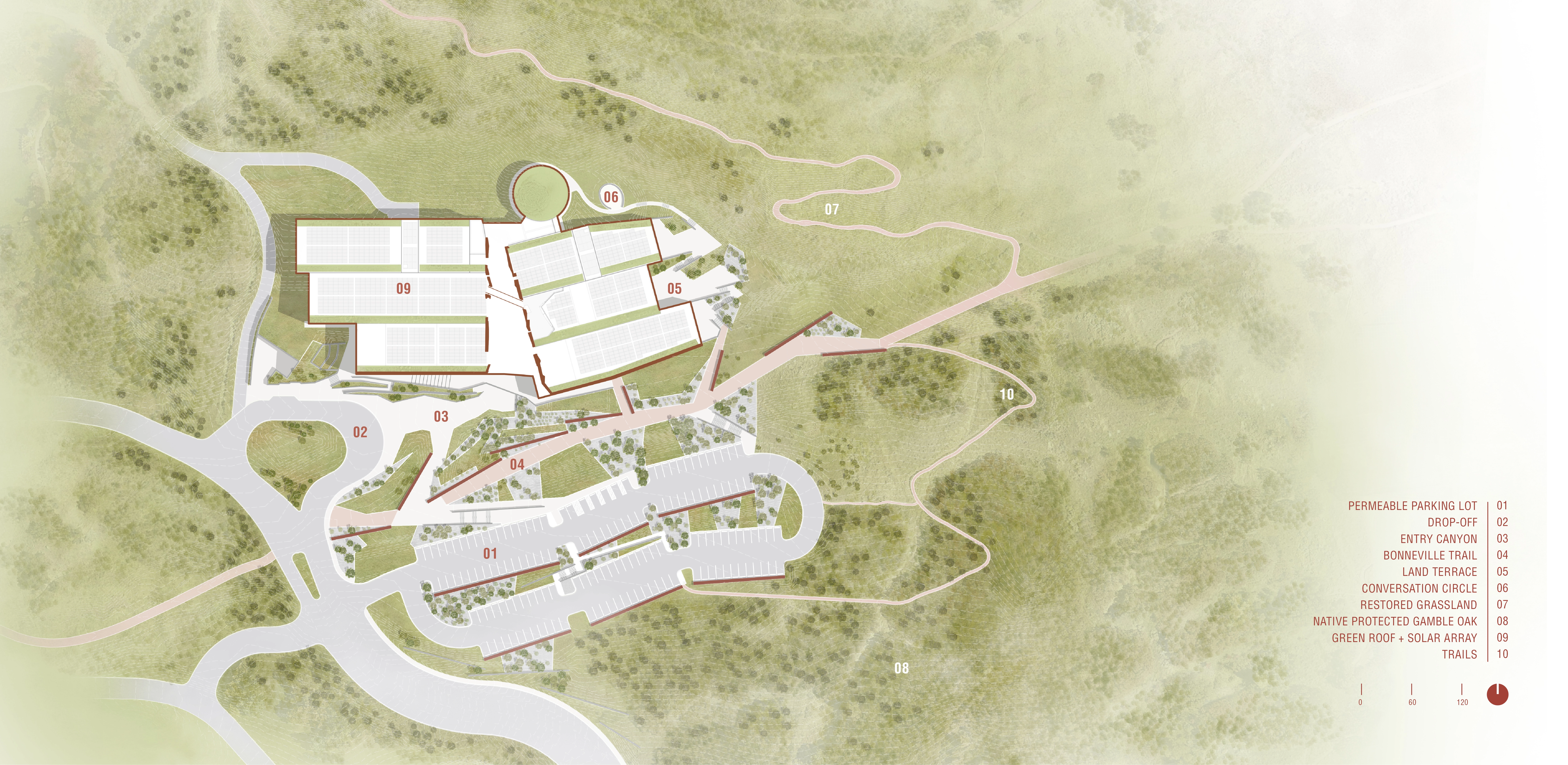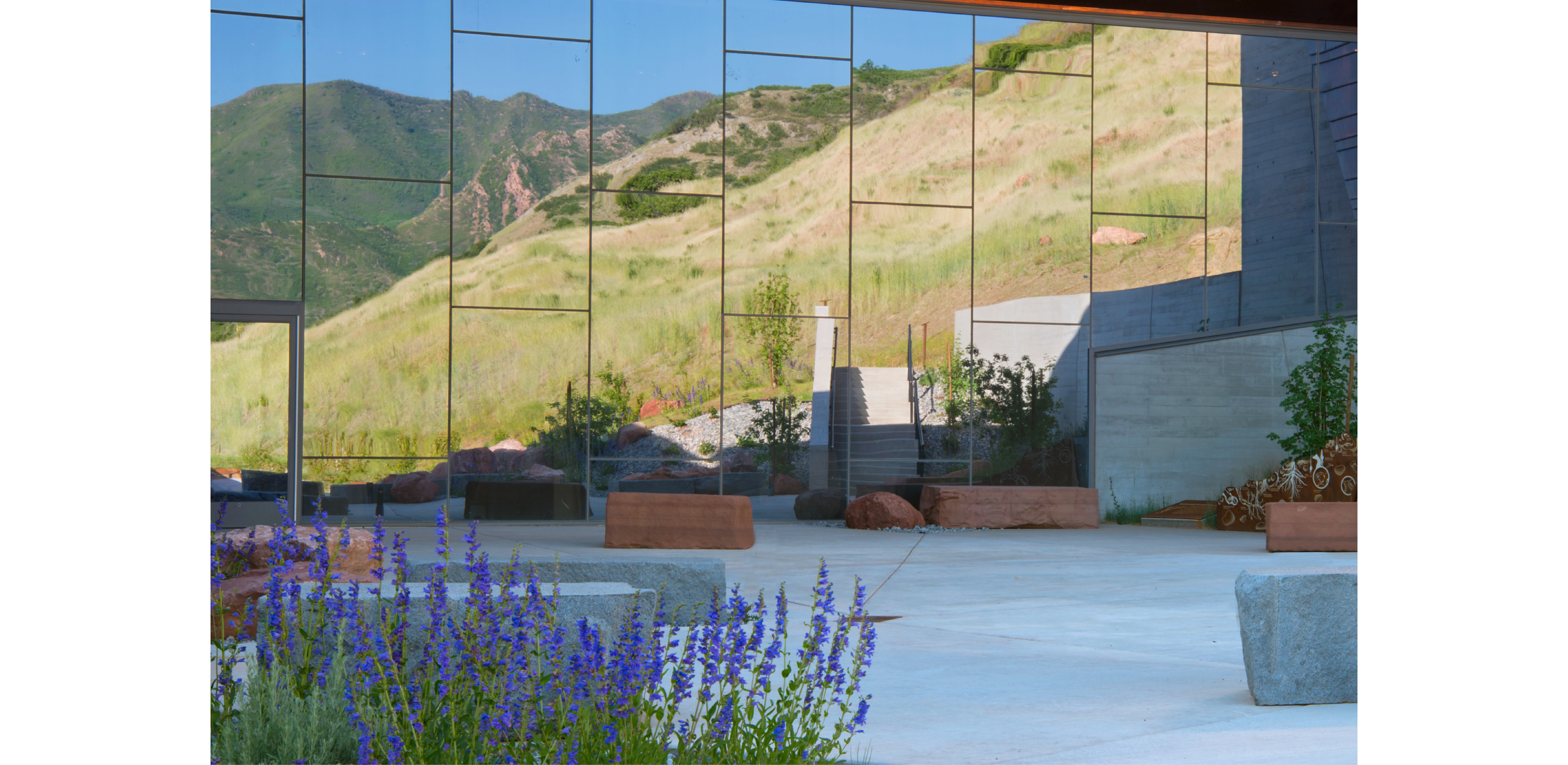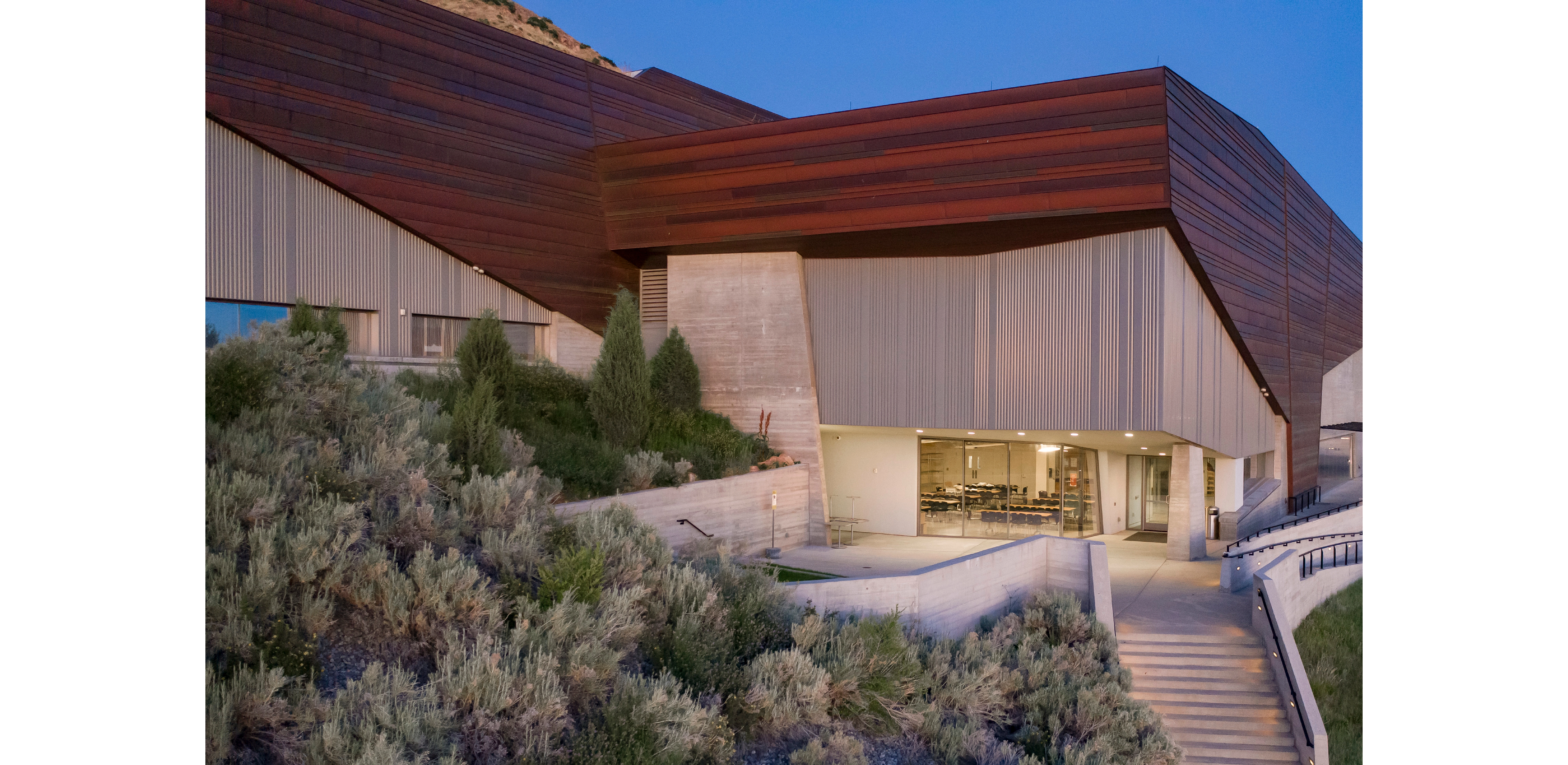 Successfully siting the building and its programs into an existing landscape with minimal disturbance required a heightened knowledge of local ecologies and a desire to distinguish the built and natural environment in a manner that artfully and scientifically interprets and celebrates Utah’s distinct beauty. Remnant “patches” of Gambel oak, revealed in land cover patterns were preserved in a series of extended planting designs that highlight the critical ecological function of native plant communities and showcase the interface between cultivated and natural landscapes. Of significance, 90% of the site’s disturbed area was restored to a natural state through grading and revegetation. -
