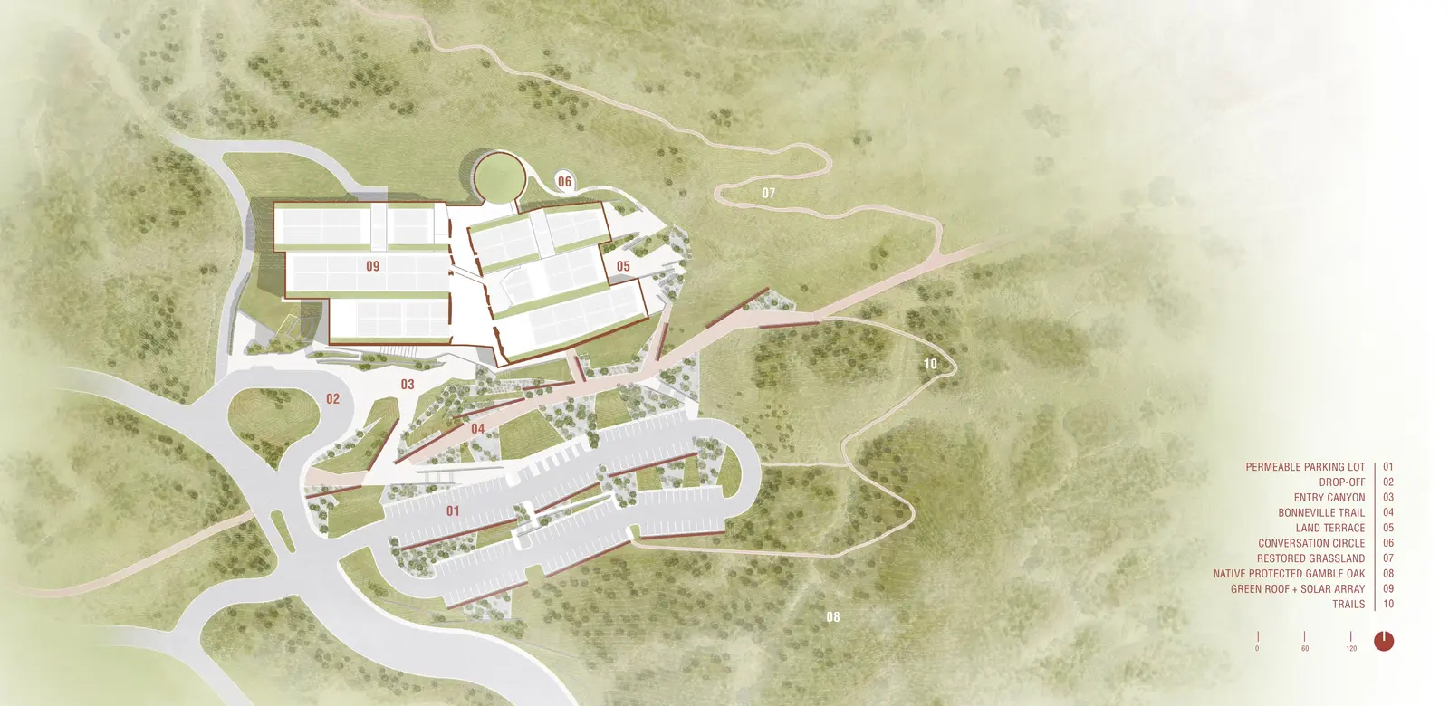 The landscape architect chose to celebrate the confluence of the site’s natural and cultural landscape in a layered and seamless application whereby zones of influence extend outward from the building footprint. An Enhancement Zone focuses on the creation of a desirable microclimate around the building; a Rehabilitation Zone restores ecological function and preserves open space connections for humans and wildlife; and a Conservation Zone manages the conservation of plants, animals, and natural habitats.