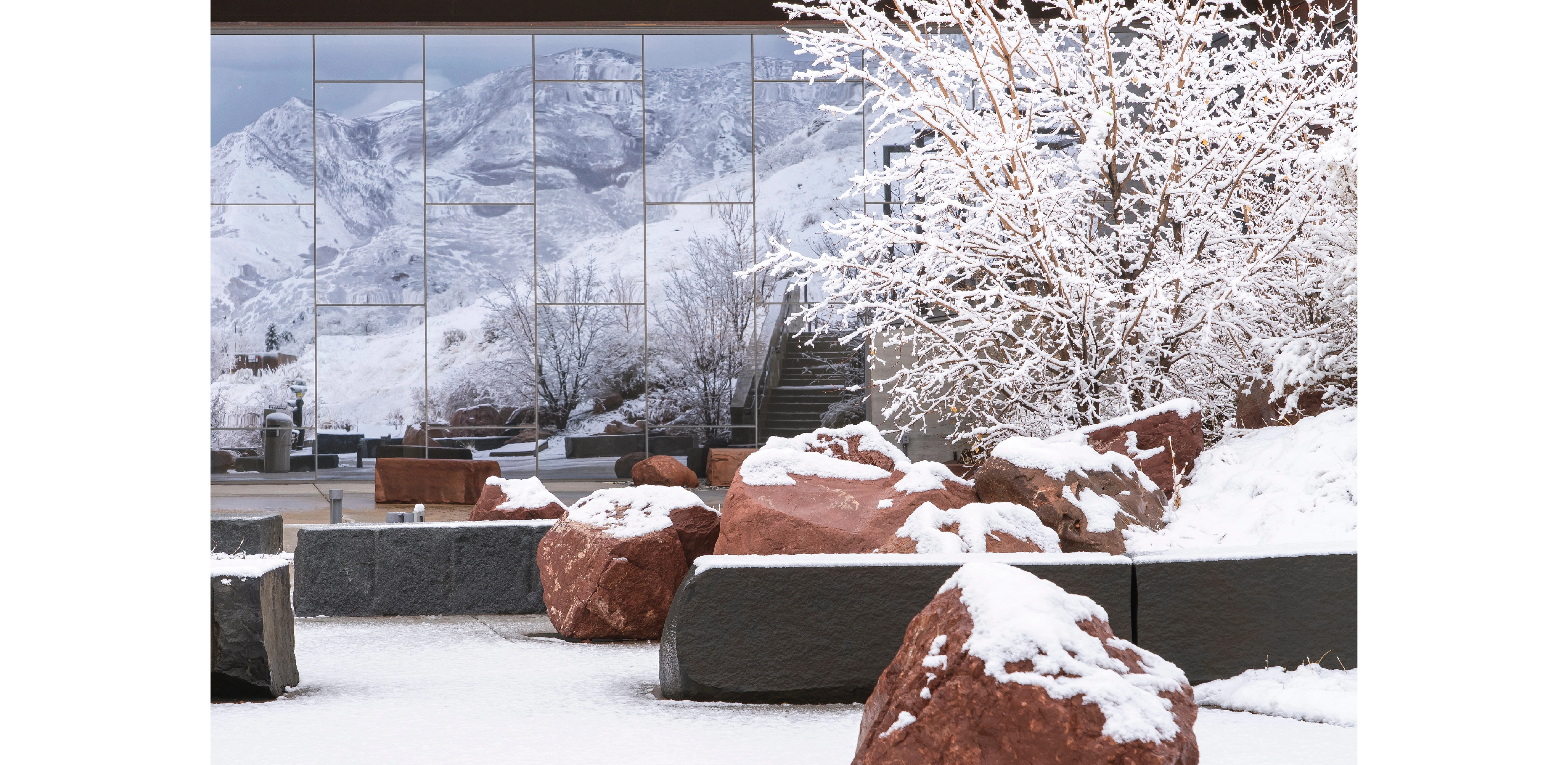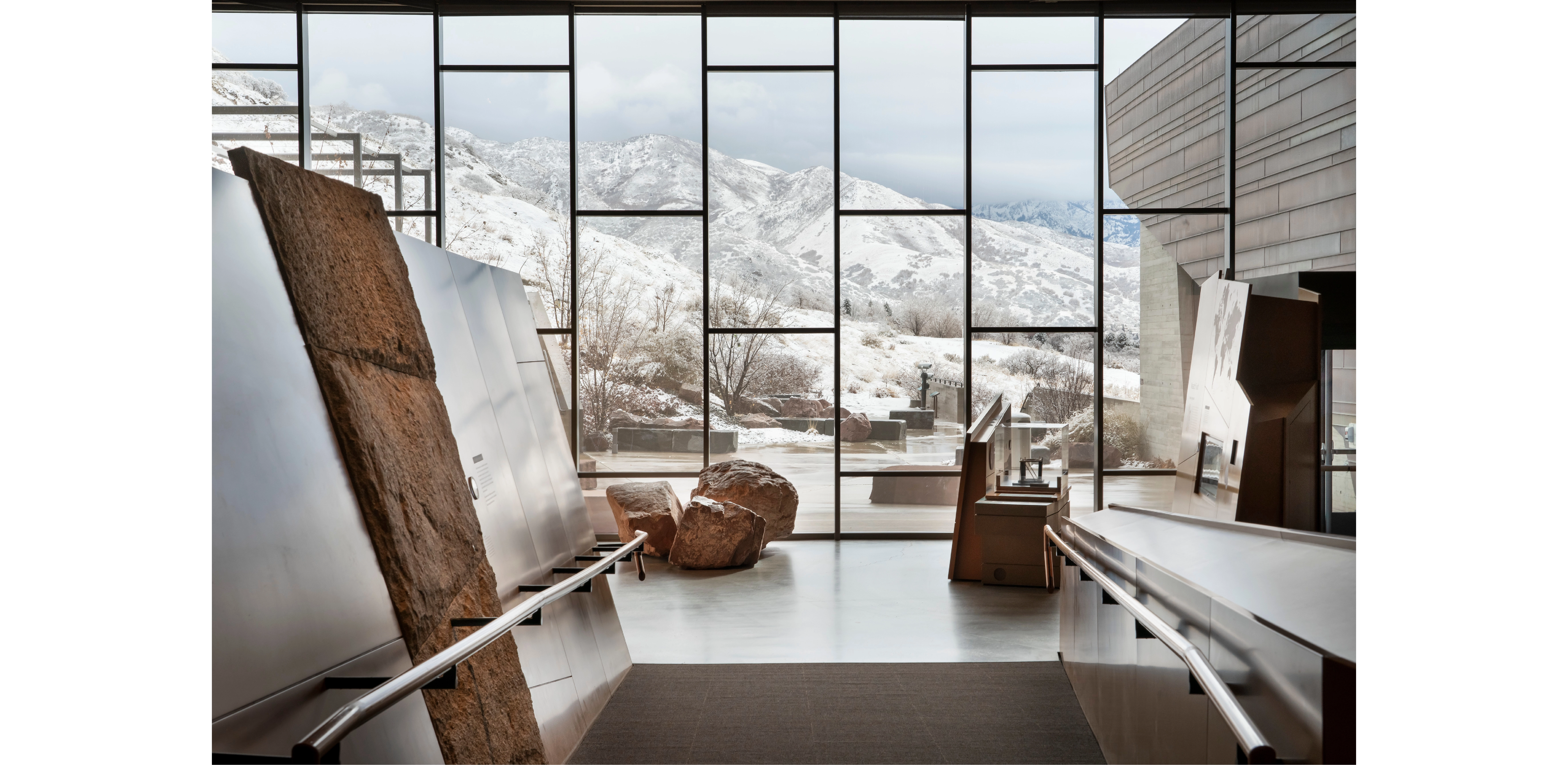 Extending from an interior gallery, the Land Terrace serves as an outdoor classroom that literally and figuratively reflects its setting. Behind the terrace, distant mountains are visible in the architecture’s glass facade, while an array of indigenous monolithic boulders artfully represent igneous, sedimentary, and metamorphic rock found throughout Utah’s varied landscape. Additional terraced exhibit spaces, informal performance amphitheaters, and interpretive panels introduce Utah’s native peoples and cultures. Respectful of the community’s desire to access the vast amounts of adjacent open space, a redesigned trail system creatively aligns along an existing pipeline easement, connecting Museum visitors with miles of interpretive exploration and recreational opportunities.