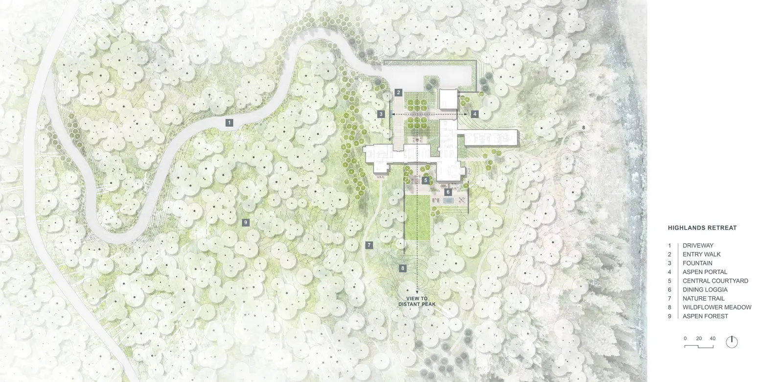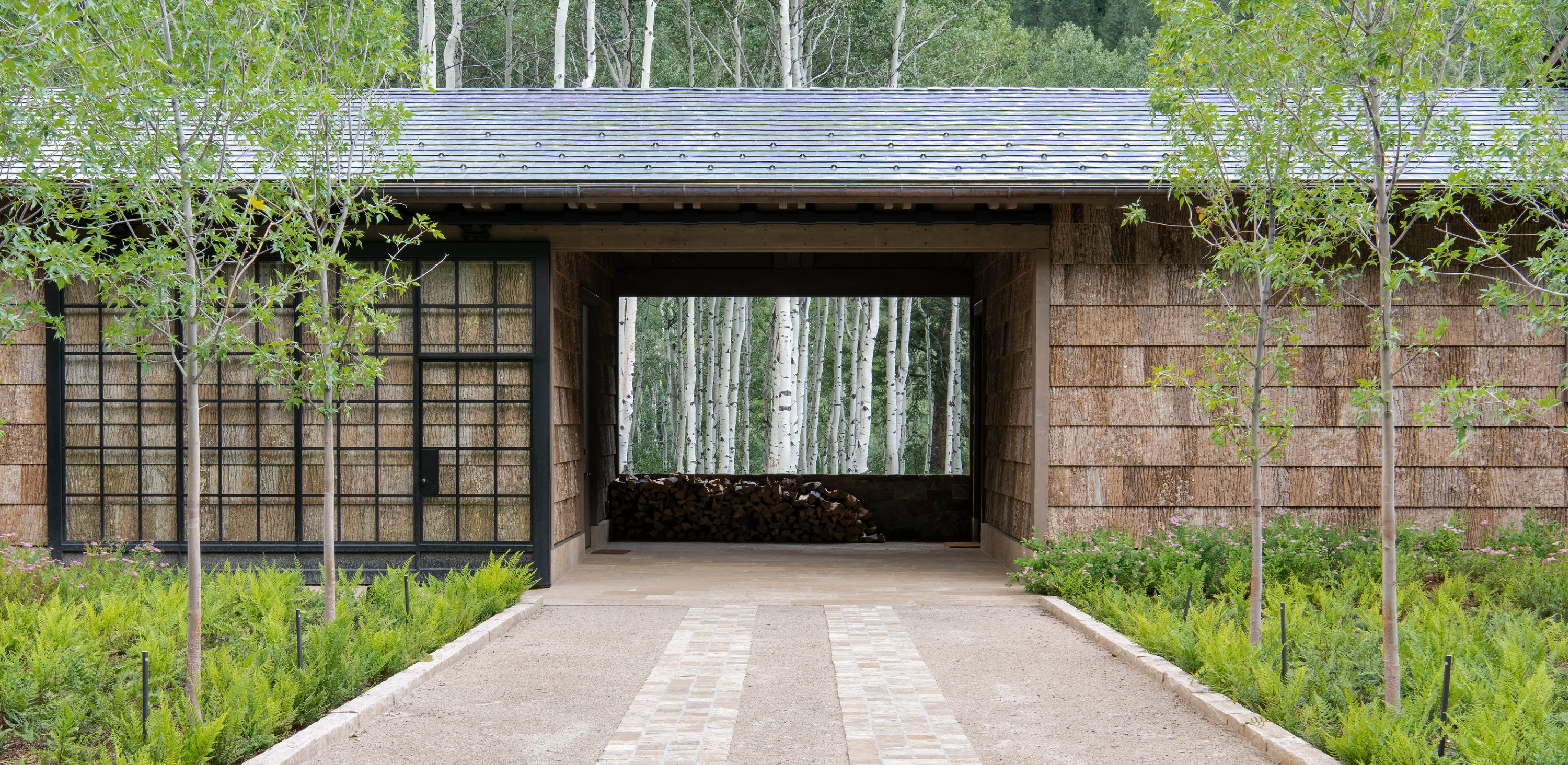 Nestled within an aspen forest, Highlands Retreat is the culmination of a fruitful collaboration between architect and landscape architect to stitch together the boundaries between natural and built environments. An open-air breezeway provides direct encounters with nature, while expansive glazing throughout the residence affords outward views through cultivated landscape into the surrounding woods, with gridded plantings at the building edges giving way to existing natural vegetation. Careful consideration of siting, approach, and understory management yield a mountain homestead deferential to its setting, yet this project seems to have a delineation of its immediate surrounds and then a release to nature where the feeling becomes one of total immersion.
