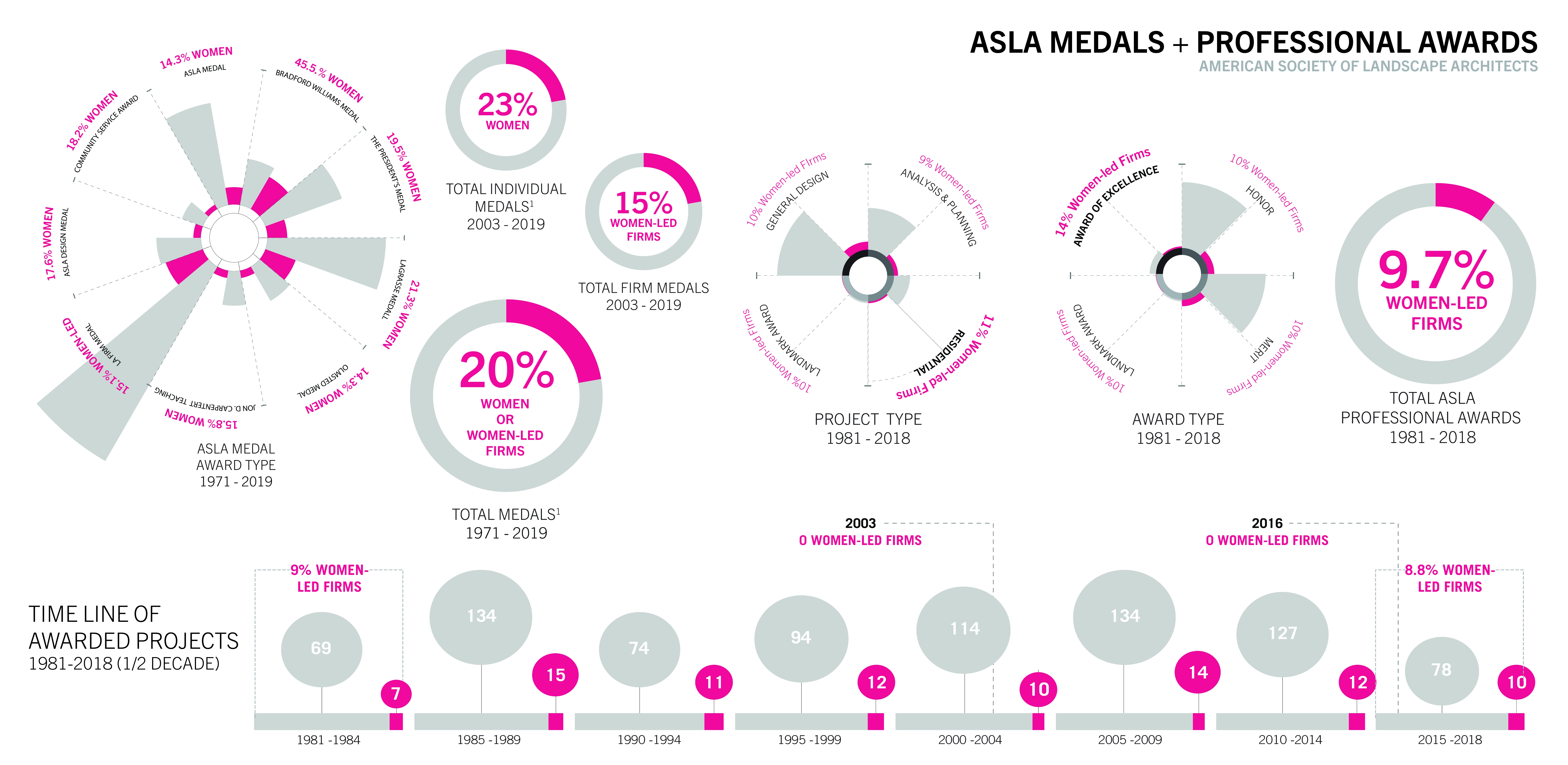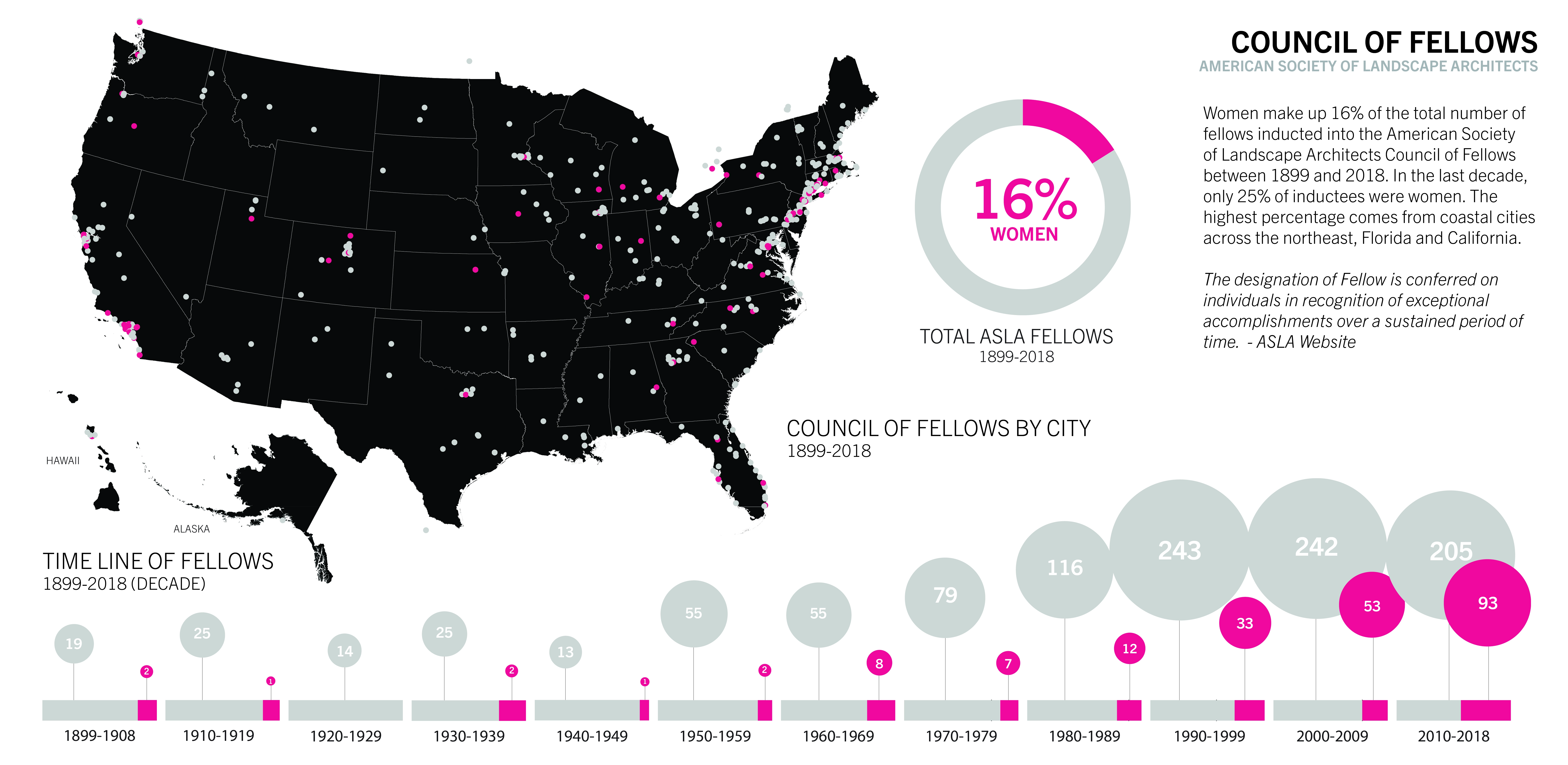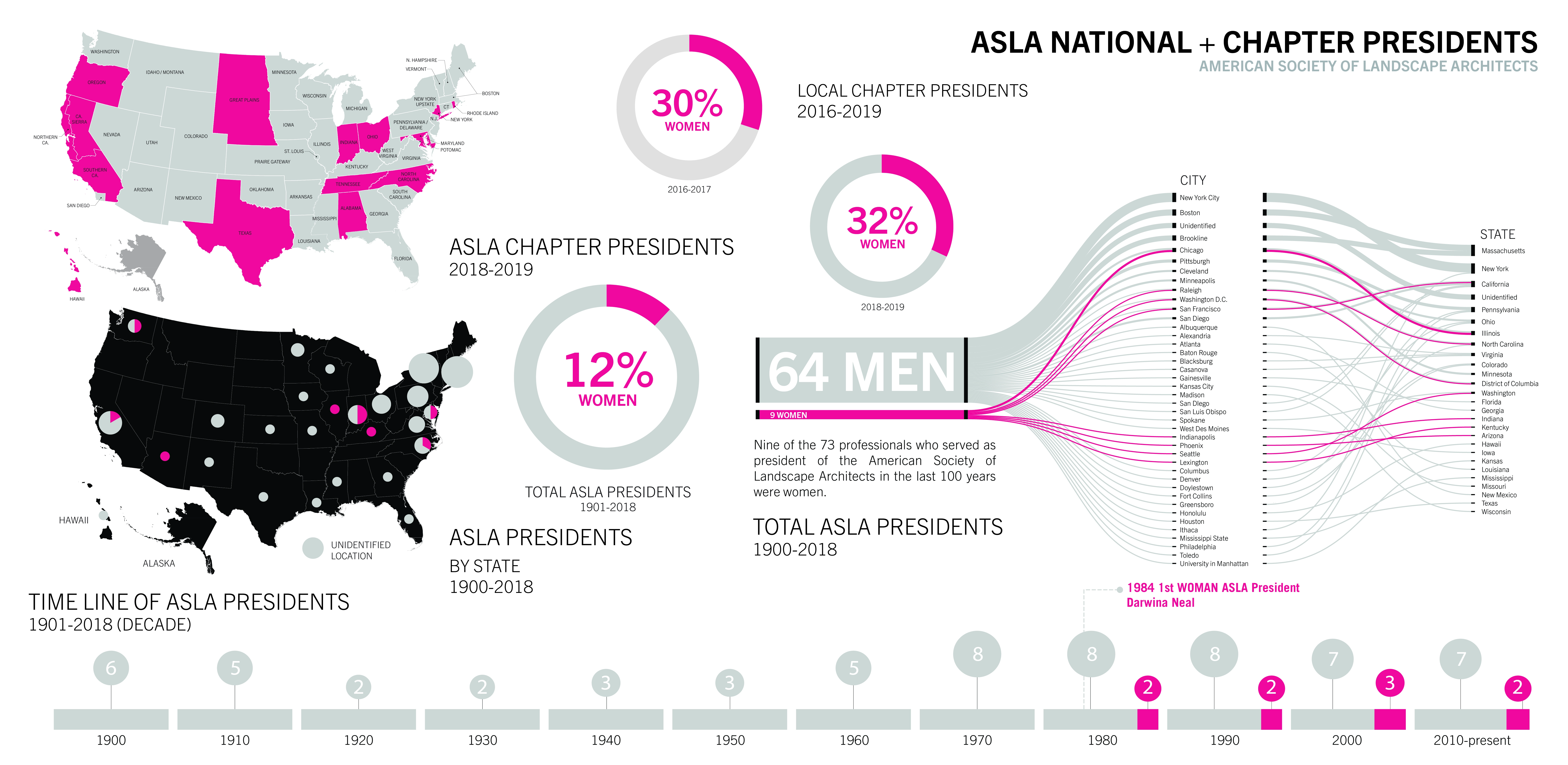 Since 1981, less than 10% of ASLA Professional Awards in the General, Residential, and Analysis and Planning categories have been awarded to women-led/owned firms. On an individual level, 23% of the ASLA Medals have been awarded to women, with the highest representation (45%) in the Bradford Williams Medal and the lowest in the Community Service (10%) and ASLA Medal (12.5%) categories. The Council of Fellows, which has been inducting members since 1899, has a membership base of 16% women. Thirty-two percent of the ASLA chapter presidents in the 2018-2019 leadership cycle were women, and from 1901-2018, only 9 out of 73 (12%) ASLA presidents have been women.