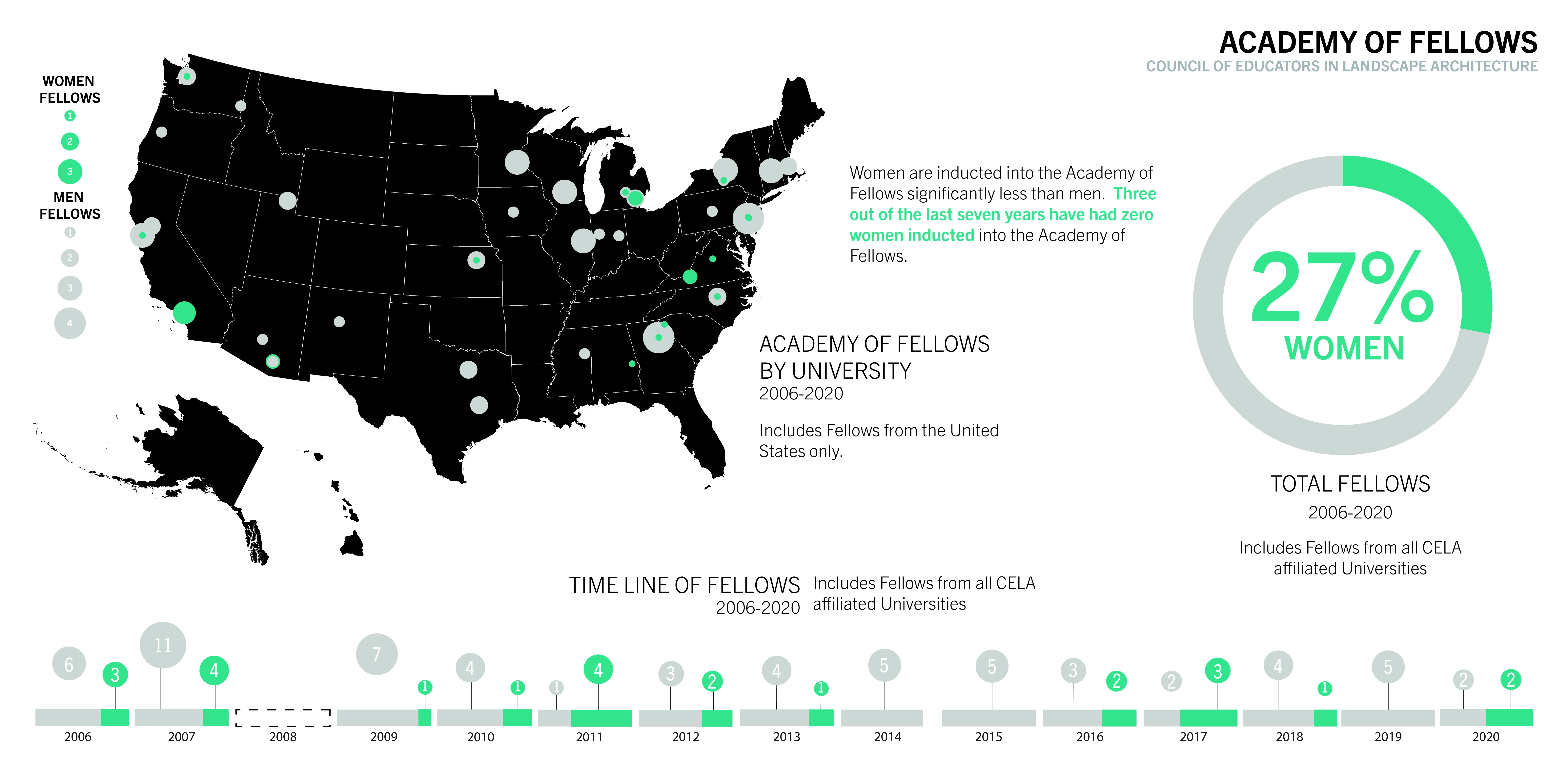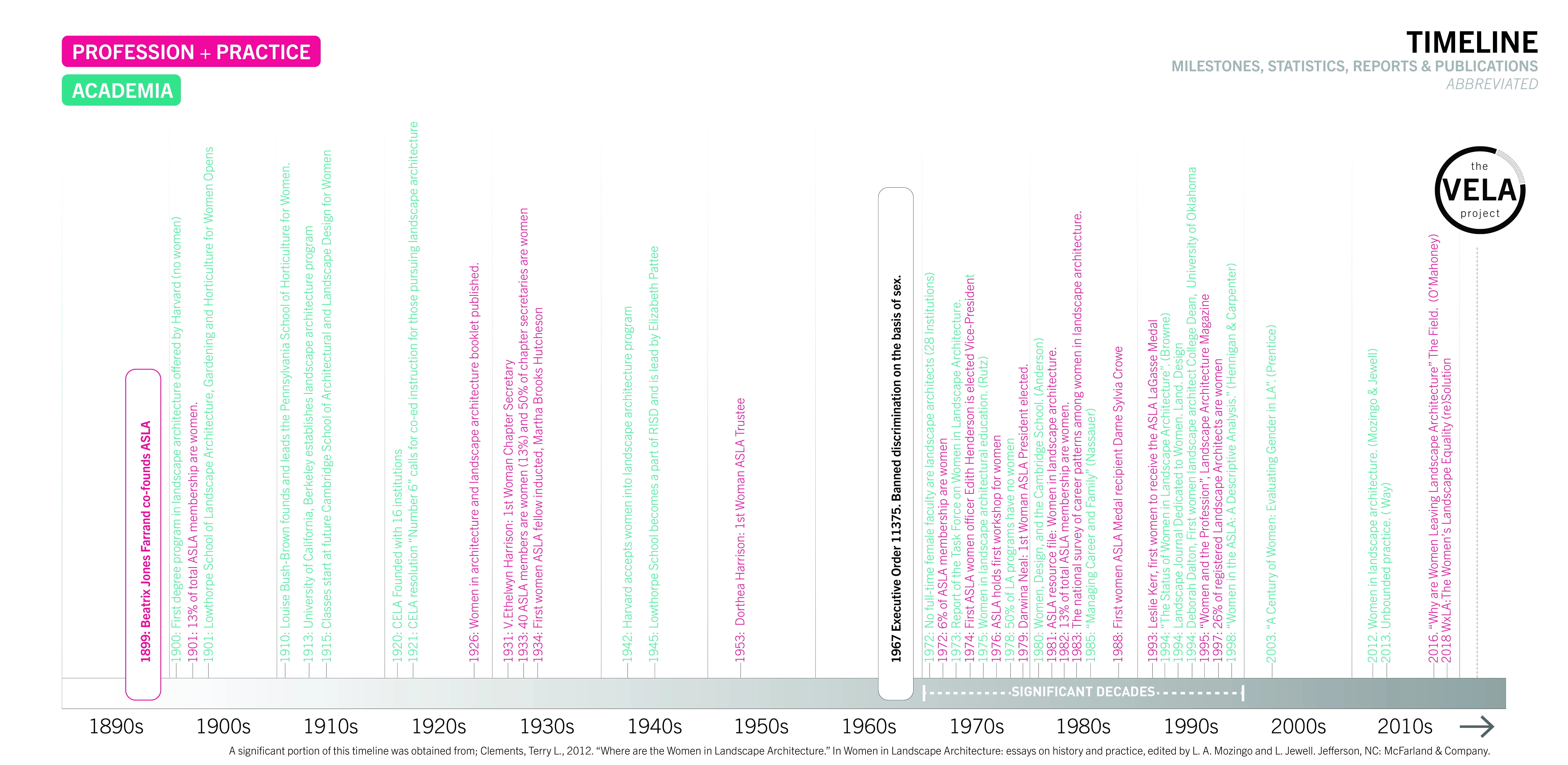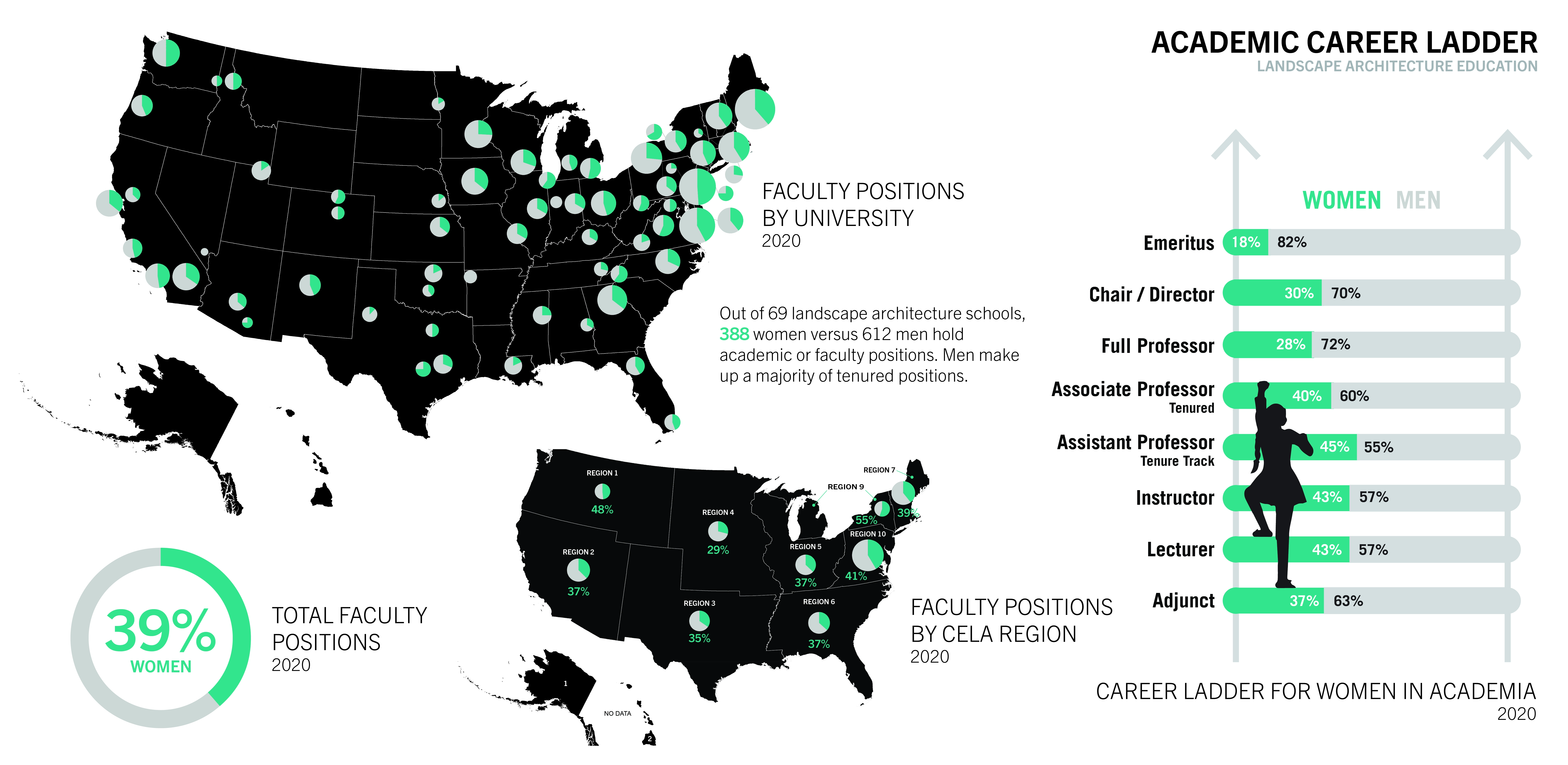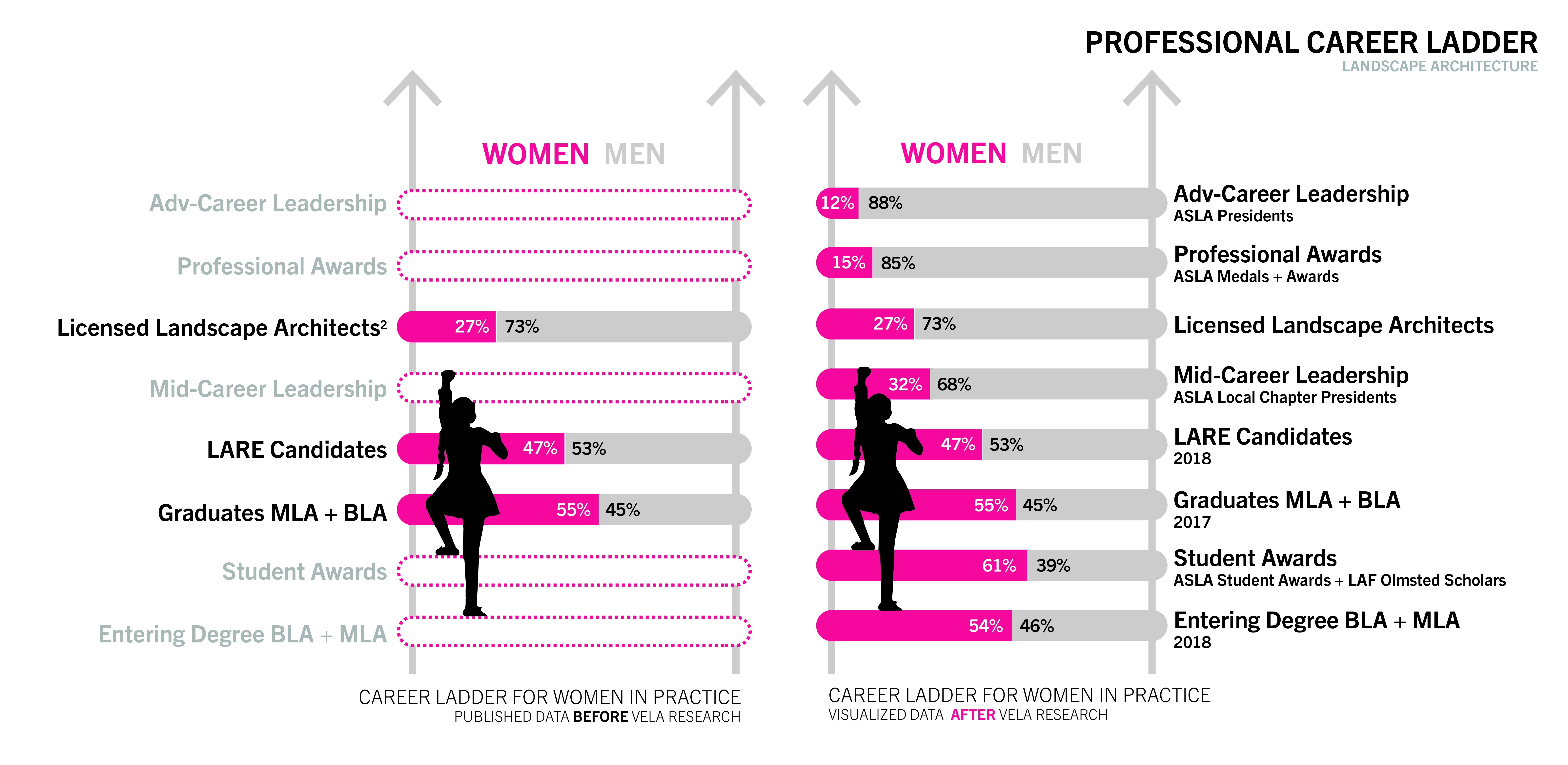 The Visualizing Equity in Landscape Architecture (VELA) Project is a research initiative that reveals, spatializes, and acknowledges the status of gender equity throughout landscape architecture. Over twenty years have passed since the last report documenting women's careers in landscape architecture. The issues raised then are similar to many problems women face now. To understand why these disparities still exist and the gaps associated with them, the VELA project offers a current review of women's status in both academia and the profession. The research collected over 17,000 unique data points from multiple public sources. The analysis organizes the data into a series of robust visualizations that catalog current trends and highlight opportunities to improve gender equity in the profession. The purpose of this research is a question of value—to recognize where "we" as a profession fall short and where critical re-alignments must occur. The project is a provocative and timely exploration that serves to inform, instigate, and empower the landscape architecture community to rally together and transform the future of practice, now!