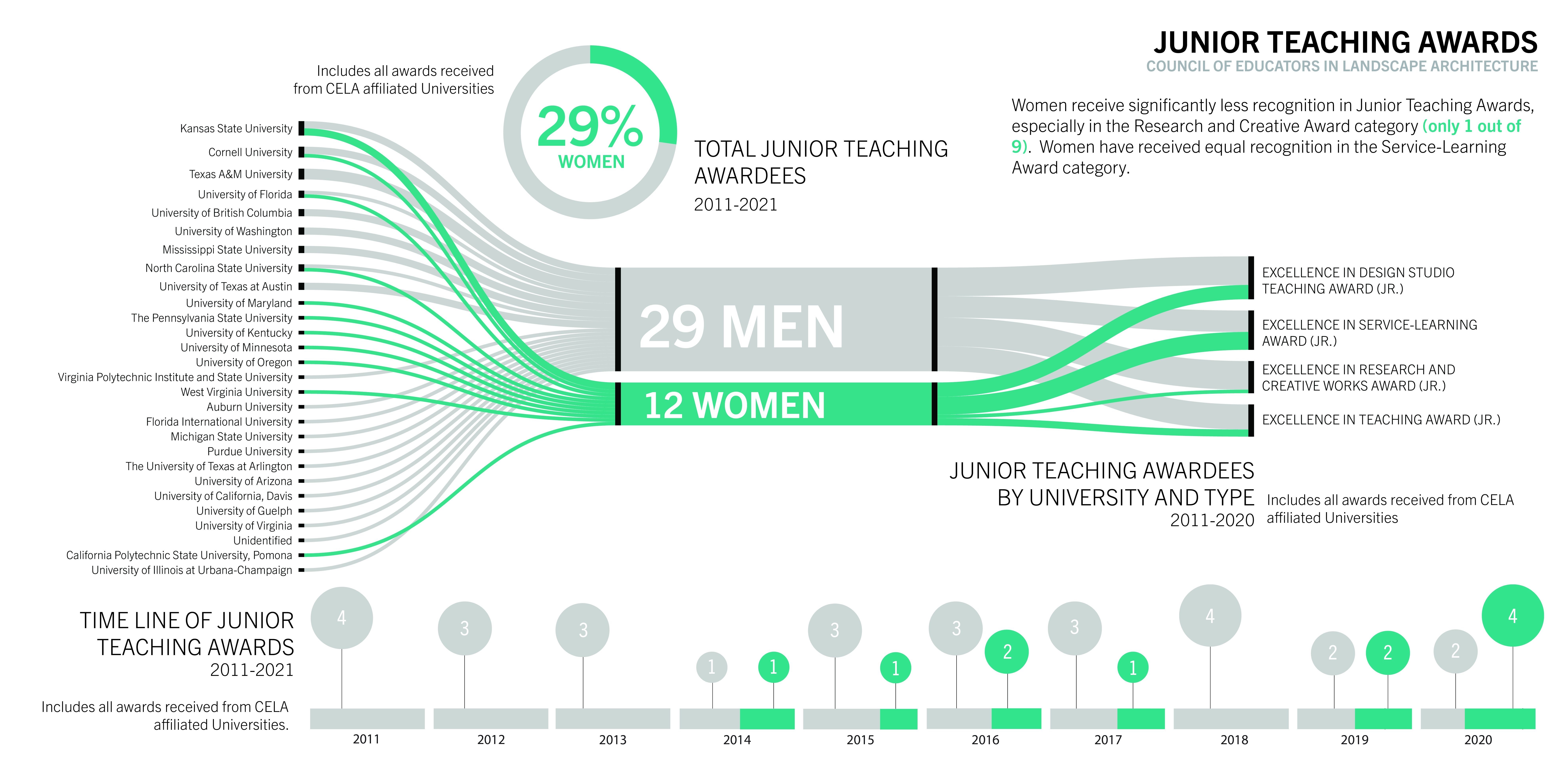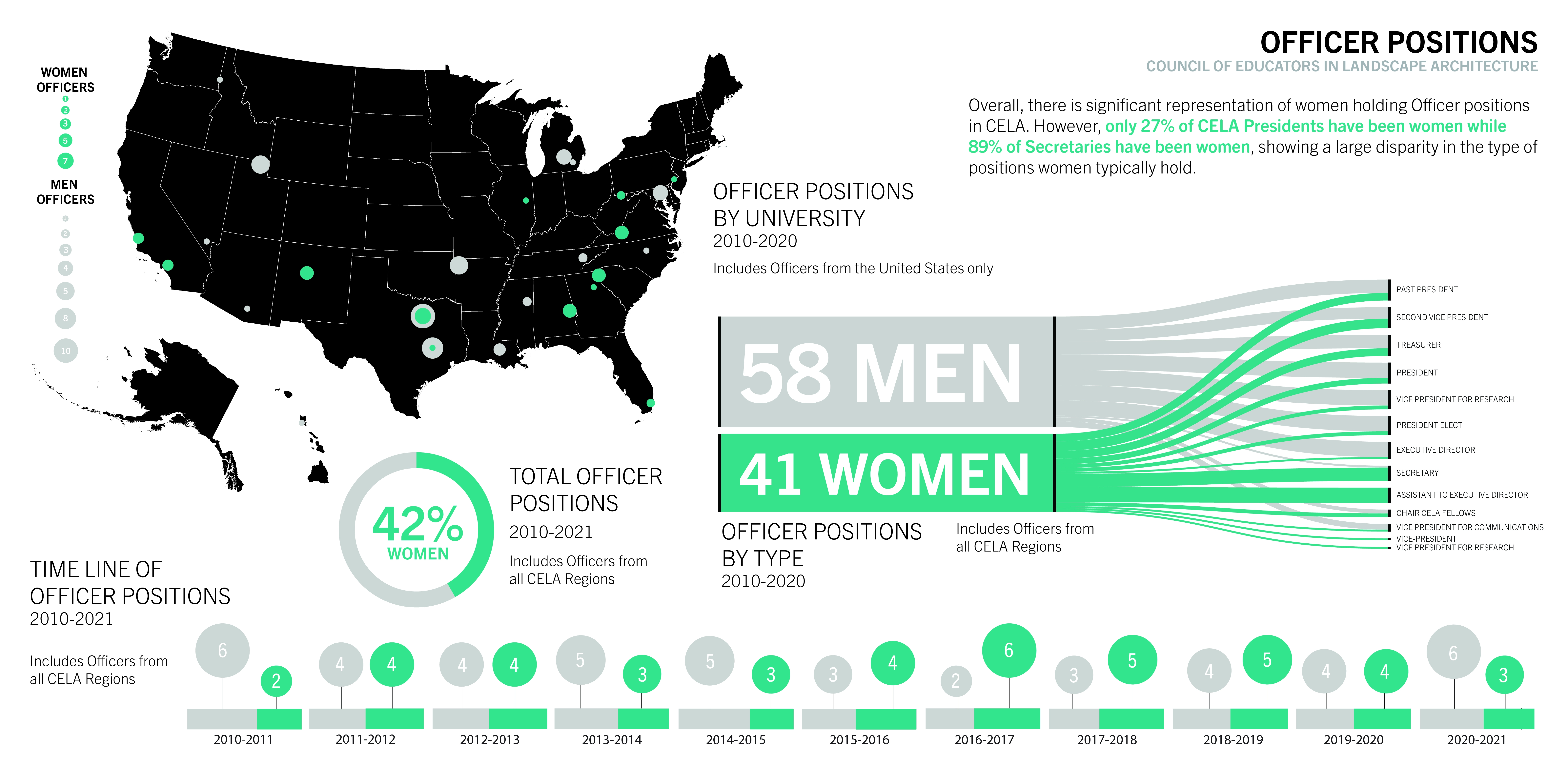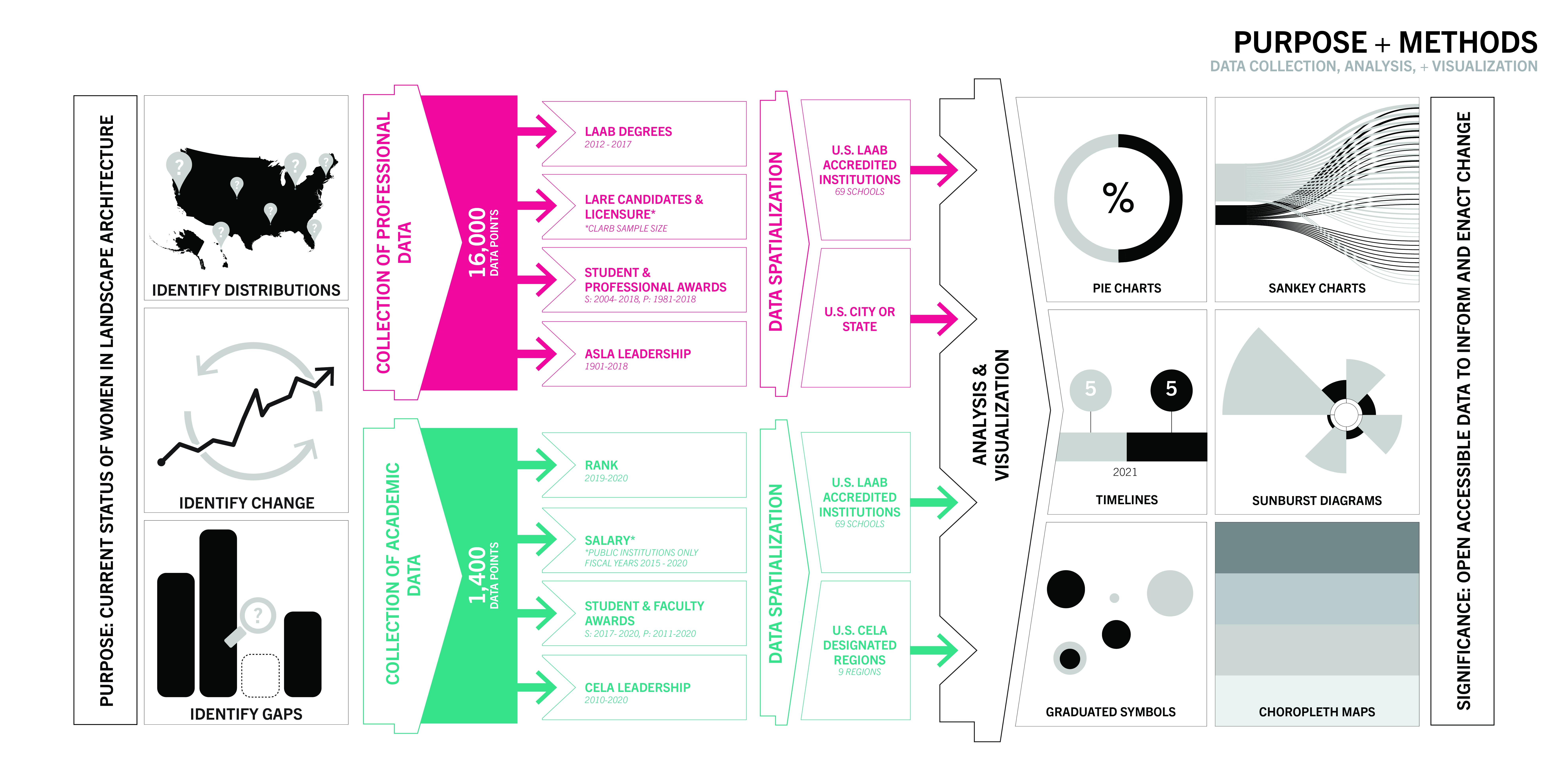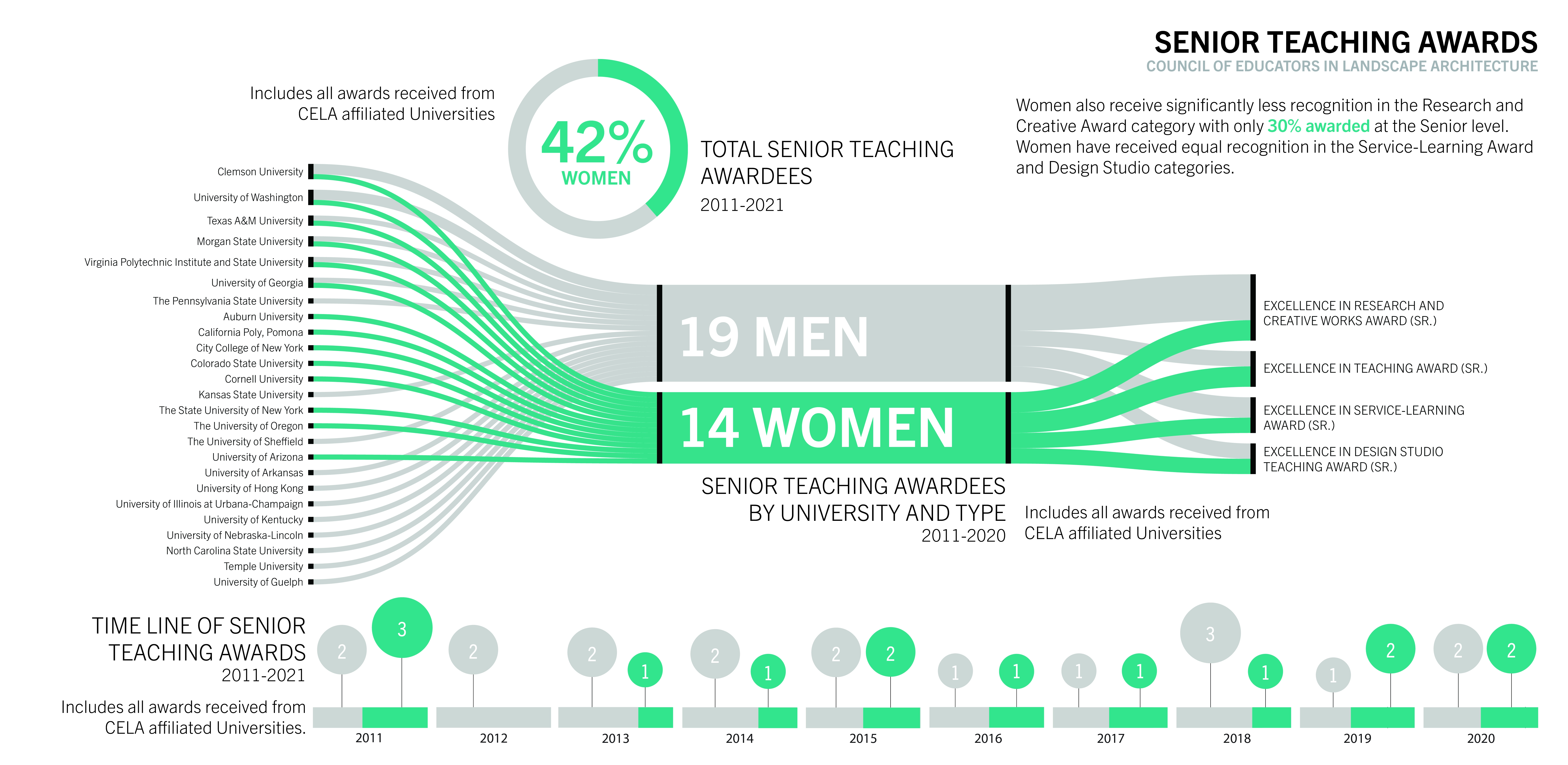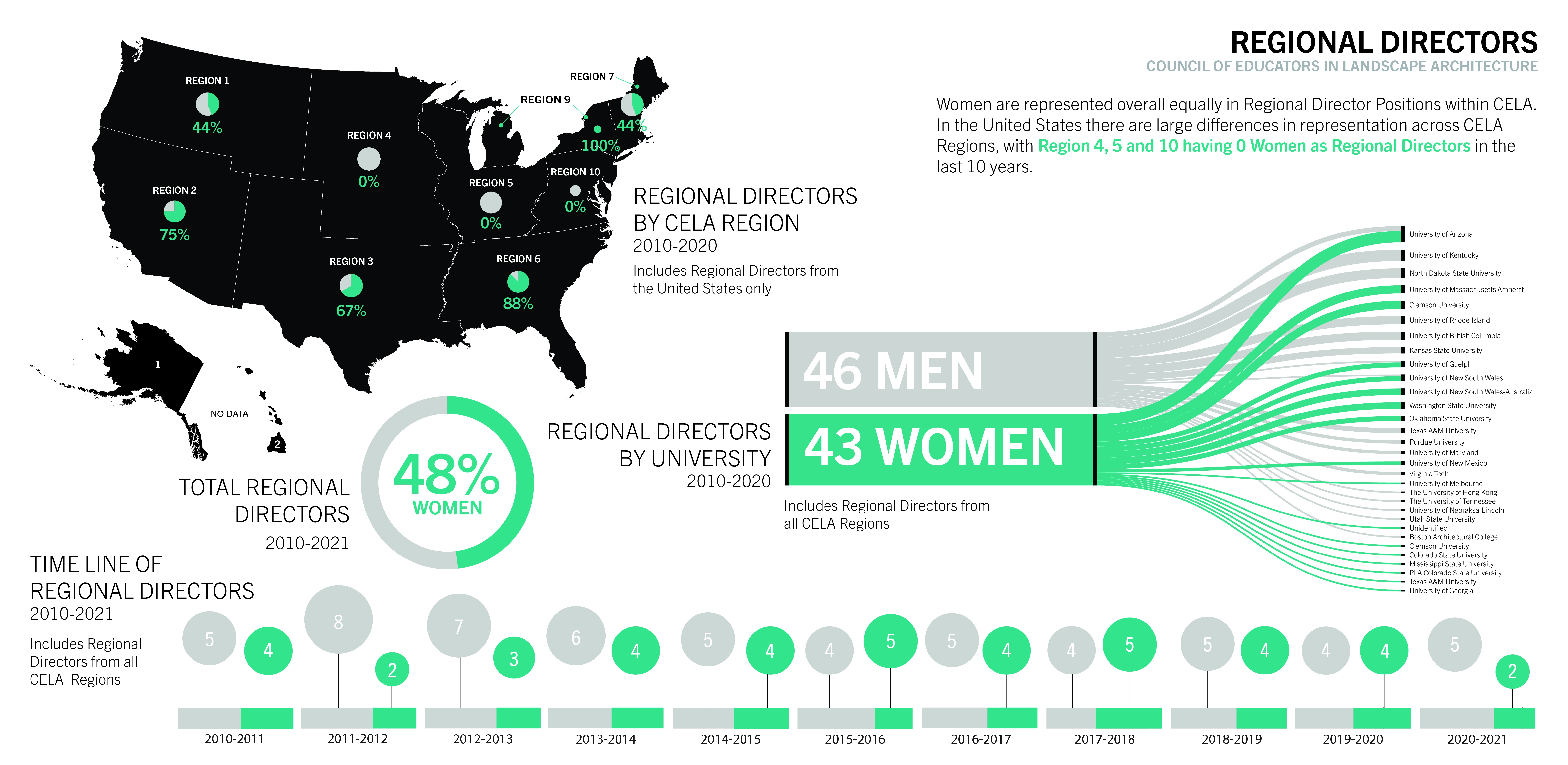 The Visualizing Equity in Landscape Architecture (VELA) Project is a research initiative that reveals, spatializes, and acknowledges the status of gender equity throughout landscape architecture. Over twenty years have passed since the last report documenting women's careers in landscape architecture. The issues raised then are similar to many problems women face now. To understand why these disparities still exist and the gaps associated with them, the VELA project offers a current review of women's status in both academia and the profession. The research collected over 17,000 unique data points from multiple public sources. The analysis organizes the data into a series of robust visualizations that catalog current trends and highlight opportunities to improve gender equity in the profession. The purpose of this research is a question of value—to recognize where "we" as a profession fall short and where critical re-alignments must occur. The project is a provocative and timely exploration that serves to inform, instigate, and empower the landscape architecture community to rally together and transform the future of practice, now!