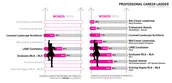 The overall data shows that women dominate in pre-professional narratives. More women enroll in and graduate (55%) with landscape architecture degrees, showing a nearly 10% gain from 2013 to 2017. In the ASLA student awards, women receive more recognition in the Communications, Collaboration, and Community Service categories while the General Design and Analysis and Planning categories have almost equal representation of both men and women. And 65% of the Landscape Architecture Foundation Olmsted Scholars are women. This momentum and representation drastically dissipate as women enter the workforce and navigate through their professional careers. After graduation, the amount of women actively pursuing licensure through CLARB drops almost 10%. And within CLARB's 2018 active, licensed landscape architects database, only 27% identify as women. As the pool of mid-level and senior-level women practitioners decrease, so do the residual effects in leadership and recognition.