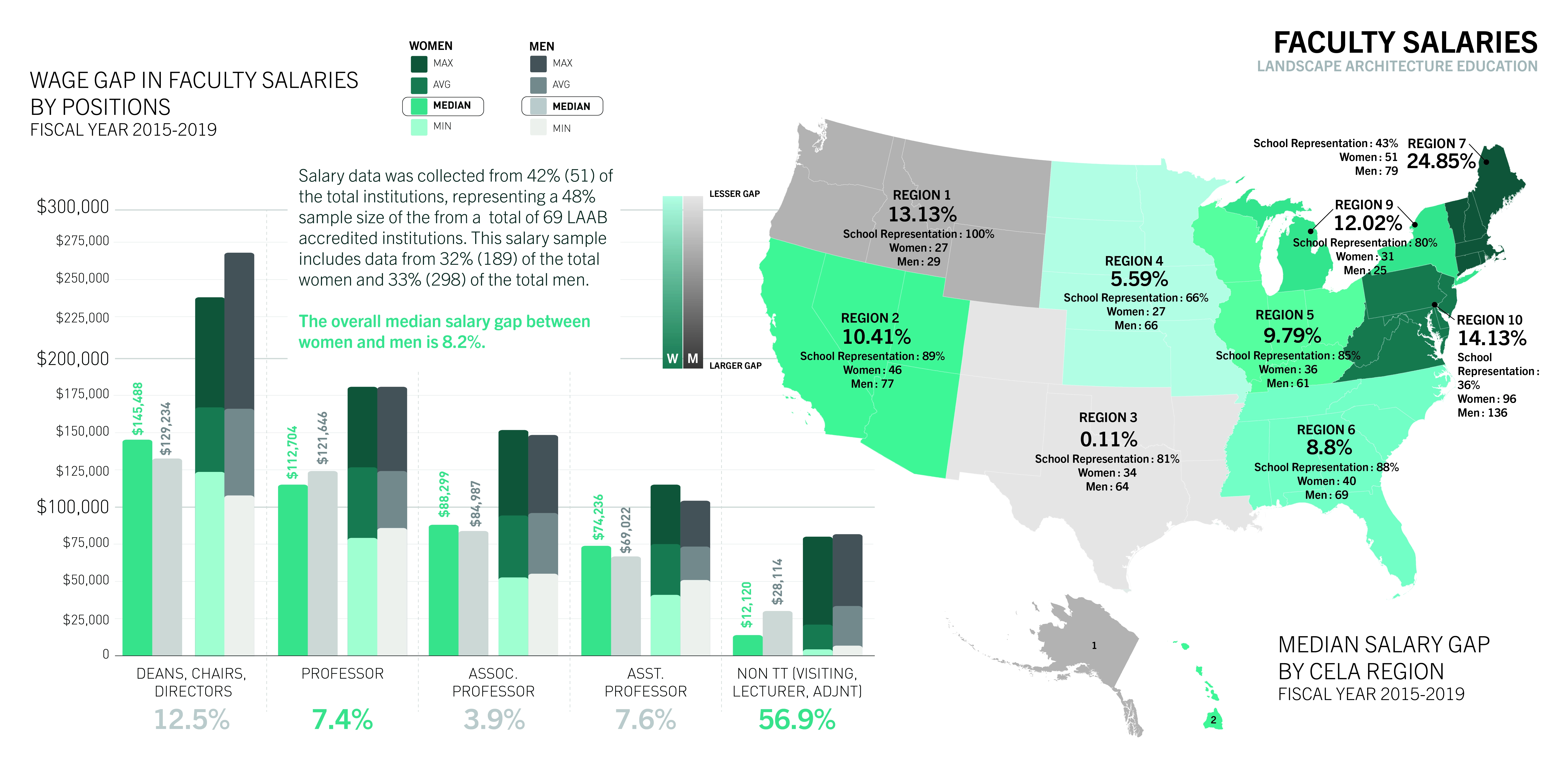 In a 1975 task force report by Miriam Rutz, only six women were identified holding tenure track positions in landscape architecture across the United States. Today, there are approximately 388 women throughout the U.S. faculties of landscape architecture. The VELA Project collected about 1,400 unique data points extracted from available public data found on sixty-nine LAAB accredited programs in the United States. The results looked at the relationship between women and men across rank, salary, organizational leadership, and awards.