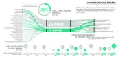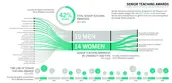 Of the total tenured positions, only 35% are women—where 70% are associate professors, and 30% are full professors. Men outnumber women in administrative leadership roles by 2:1, and second, to non-tenure-track positions, leadership roles regionally experience some of the highest percentages of wage disparities. Nationally, women are represented equally in Regional Director Positions within CELA, but in regions 4, 5, and 10, there have been no women serving as Regional Directors in the last ten years. Only 27% of CELA Presidents have been women, while 89% of the total Secretaries have been women, showing a disparity in the type of positions women hold. Overall, there is a significant representation of women receiving teaching awards through CELA. However, women receive significantly less recognition in Junior Teaching Awards, especially in the Research and Creative Award category (only 1 out of 9). Women are inducted into the CELA Academy of Fellows significantly less than men. Three out of the last seven years have had zero women inducted into the Academy of Fellows. Over the 20 years of ASLA's Jot. D. Carpenter Teaching Medal, only four women have received recognition.