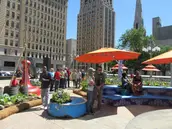Project materials were an interpretation of those used in community gardens and selected for the ability to have a second life in new homes. Everything was built and inspected off-site and carried up to the plaza by hand. All of the pieces and parts of the garden were recycled and relocated into gardens across the city after garden disassembly. Garden beds were made from coir logs and wooden planters. Container Gardens were made in metal troughs, recycled plastic barrels and wooden produce boxes with stenciled client contact graphics. Flags were printed with community designed graphics to announce the farm to street-level passersby. The amphitheater used the same graphics and provided a vibrant centerpiece. Tables and chairs were carefully selected from the client’s warehoused stockpile. Umbrellas from the same stockpile provided vital shade. The soil was a split mix of compost, topsoil, and composted pine bark. The pine bark assisted with drainage and to prevent root rot. Designers minded strict weight and wind load requirements as the plaza floor is also the roof of city offices located below.