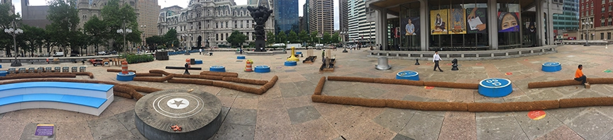 The plaza sits directly across from City Hall in the heart of Philadelphia. The barren foreboding granite square forms the podium of the 18-story Municipal Services Building. It is raised above the adjacent sidewalk to about eye level. From June through September the Farm for the City injected life into the plaza showing a way in which public space can be quickly transformed from lifeless to community asset.