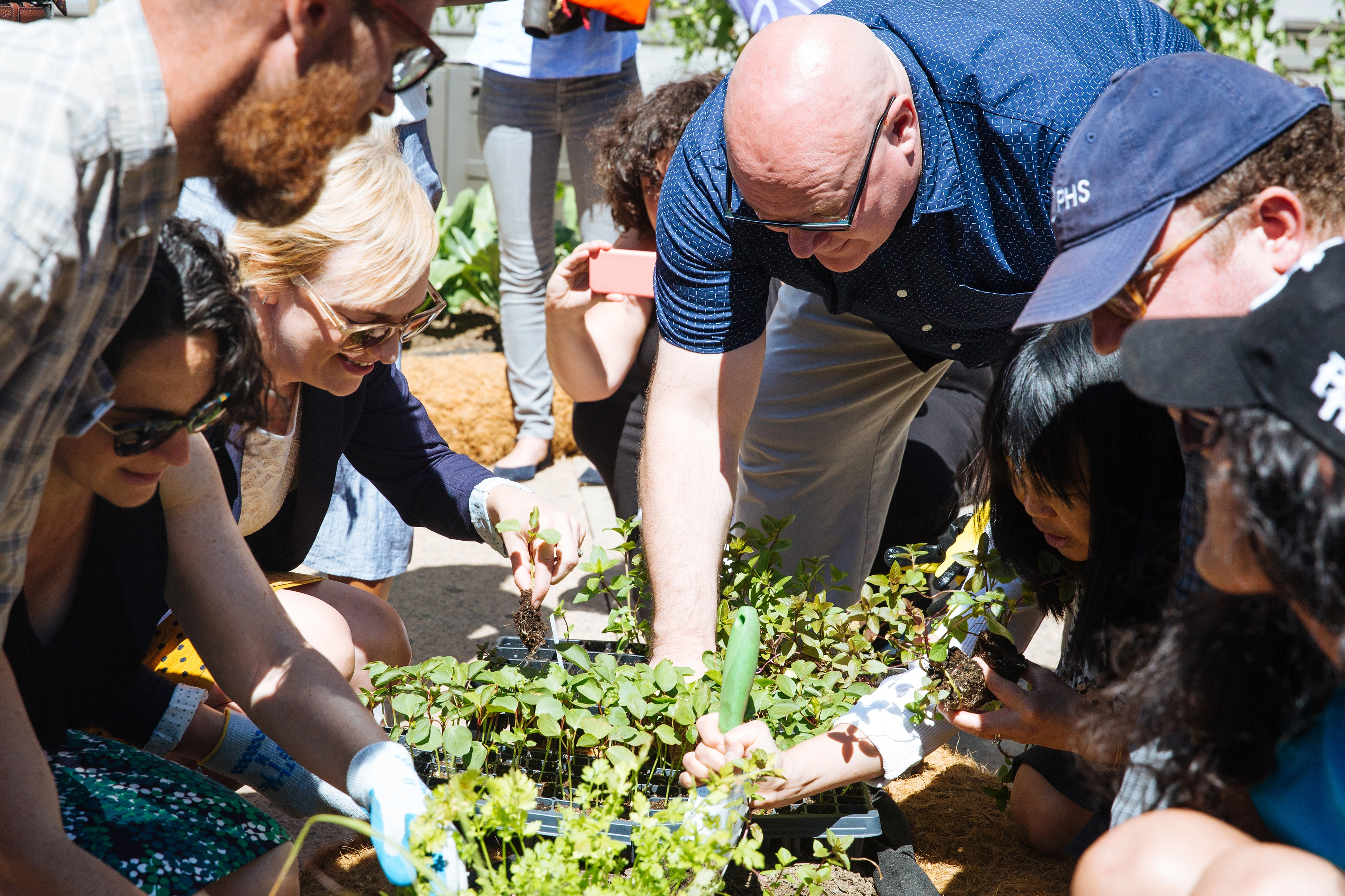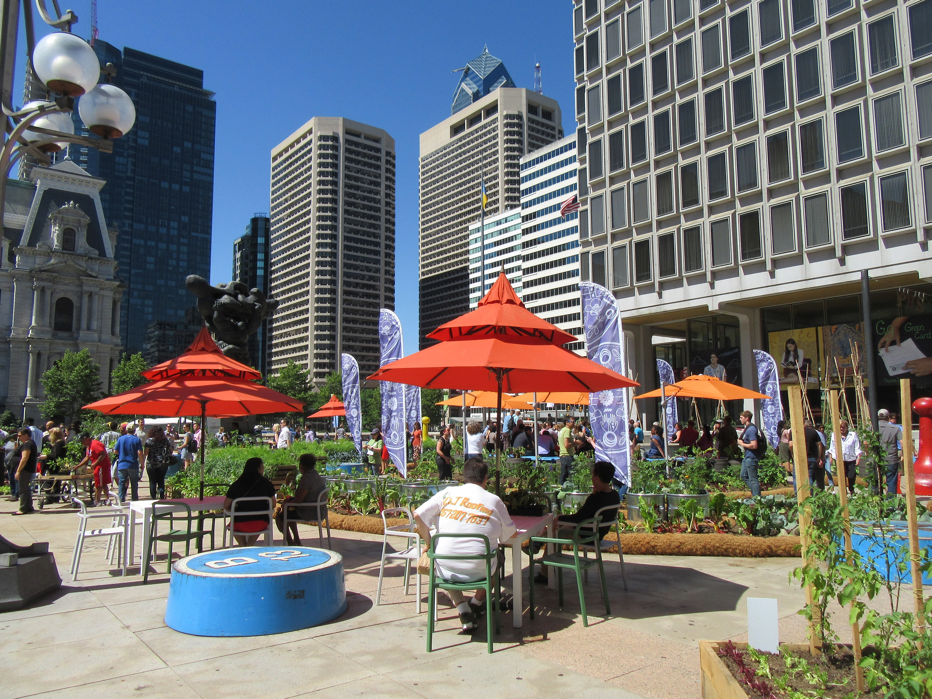 The farm produced over 1200 pounds of produce. The produce was delivered to a meal center, located just five blocks south, where it was prepared by professional chefs providing food for 8600 men and women who are homeless, at risk of being homeless, or of low-income. Two community dinners – featuring food grown on the farm – brought 150 people from different backgrounds together at the farm to dine and discuss food security and healthy community building. The designers and farmers were careful to respect the community of people who were already spending time on the plaza. “I think, too, as a lot of areas in Center City have been developed, a lot of housing-insecure folks have been pushed out, and pushed, and pushed, and all those spaces are disappearing. And as all that money is being poured into those projects, I don’t think there’s an equally large enough amount of money being poured into providing services for folks,” one of the farmers said.