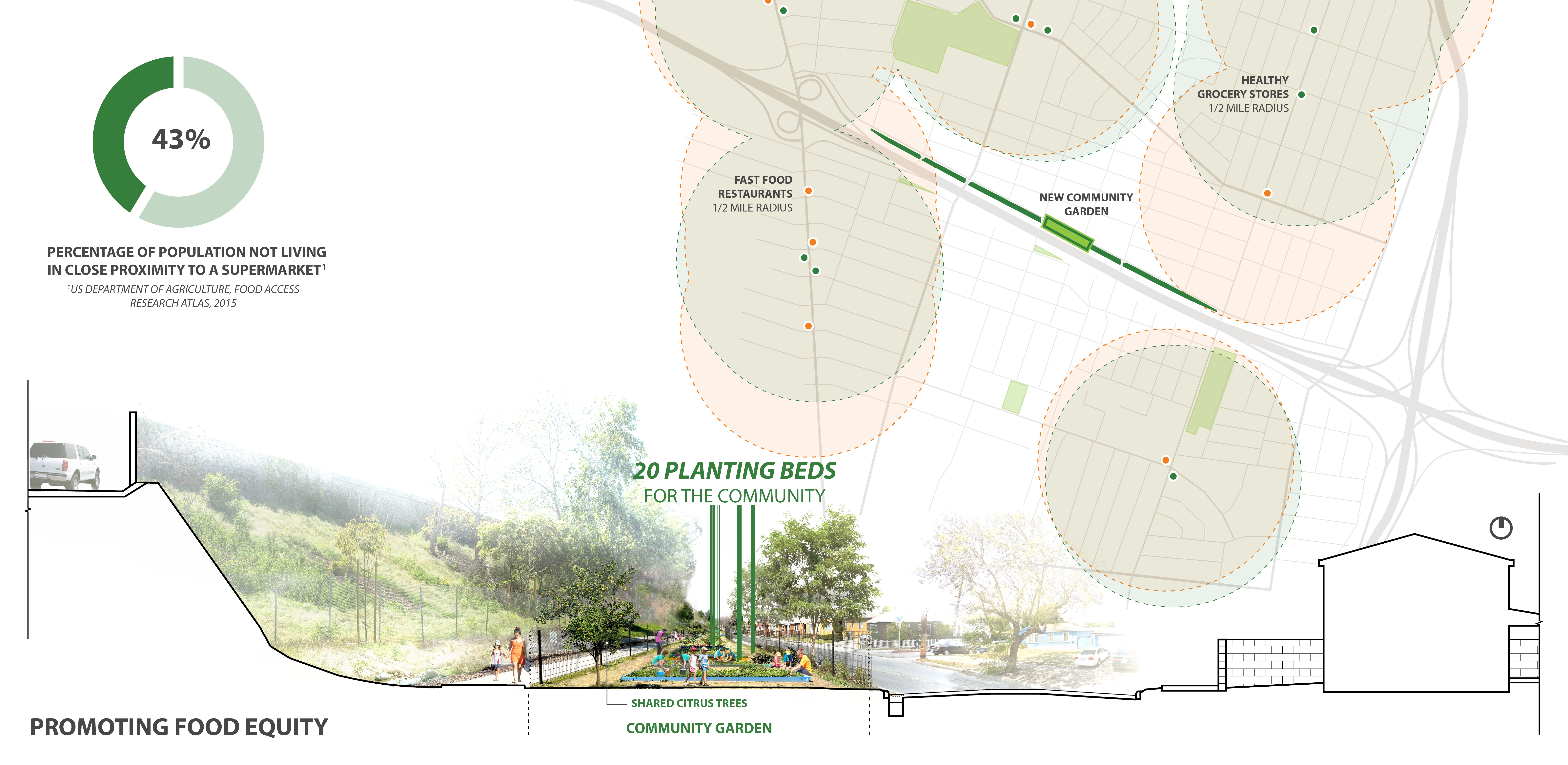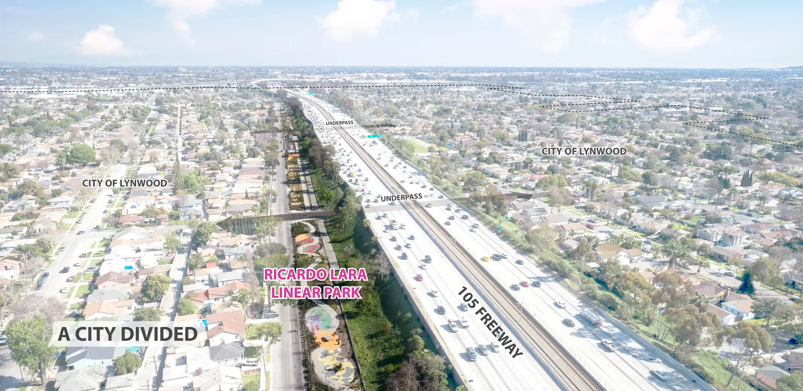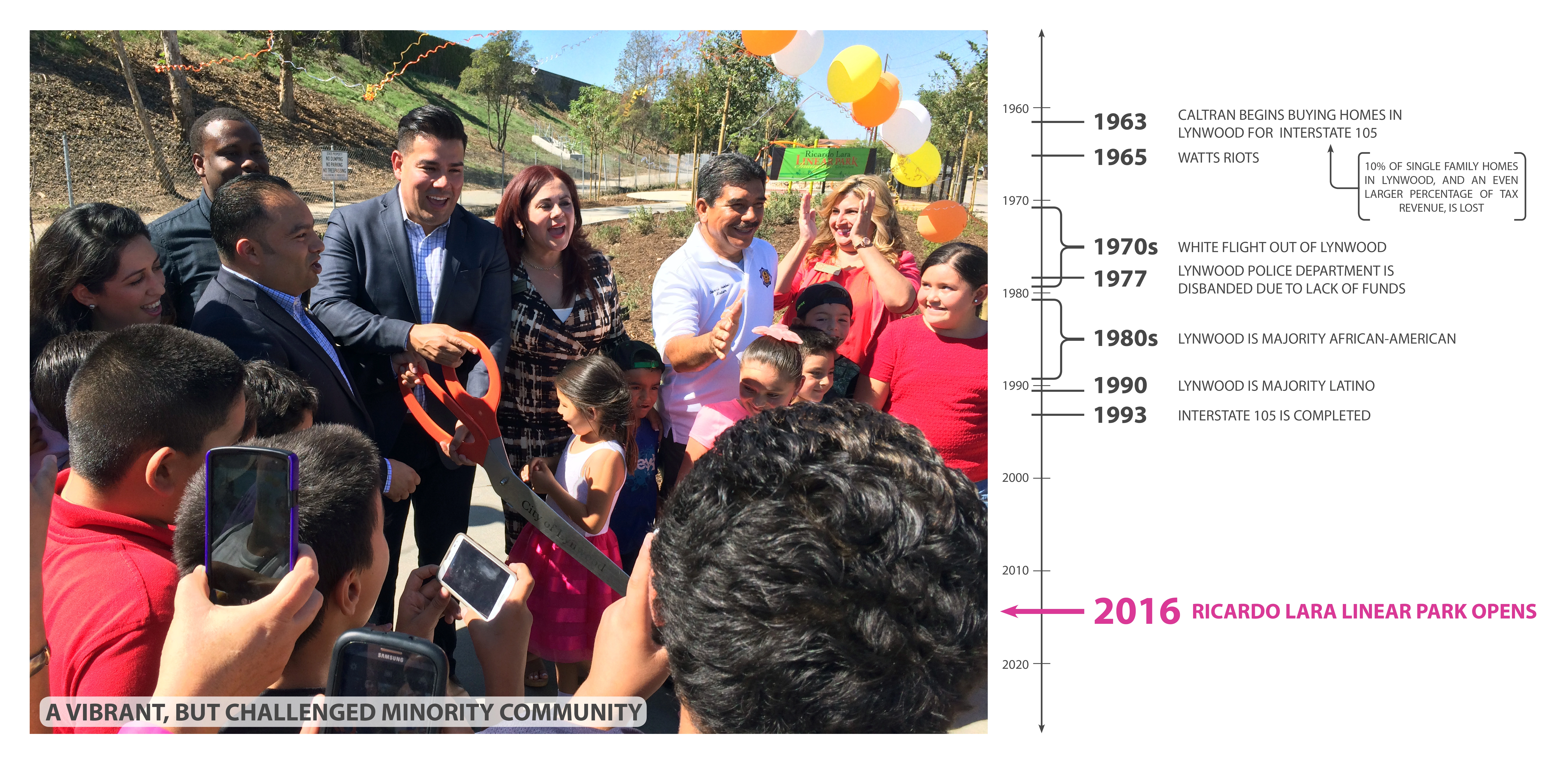 Throughout the past few decades, Lynwood has exemplified the struggles of many urban communities in similar straits. Its more affluent residents, and many businesses, gradually fled the community as the freeway rendered it a less desirable place to live, and its populace shifted, becoming younger, with a middle-class Black and Latino-majority demographic. In 2014, the City of Lynwood moved to reclaim a one-mile section of unutilized freeway-adjacent right of way as a much-needed gathering place and community resource.