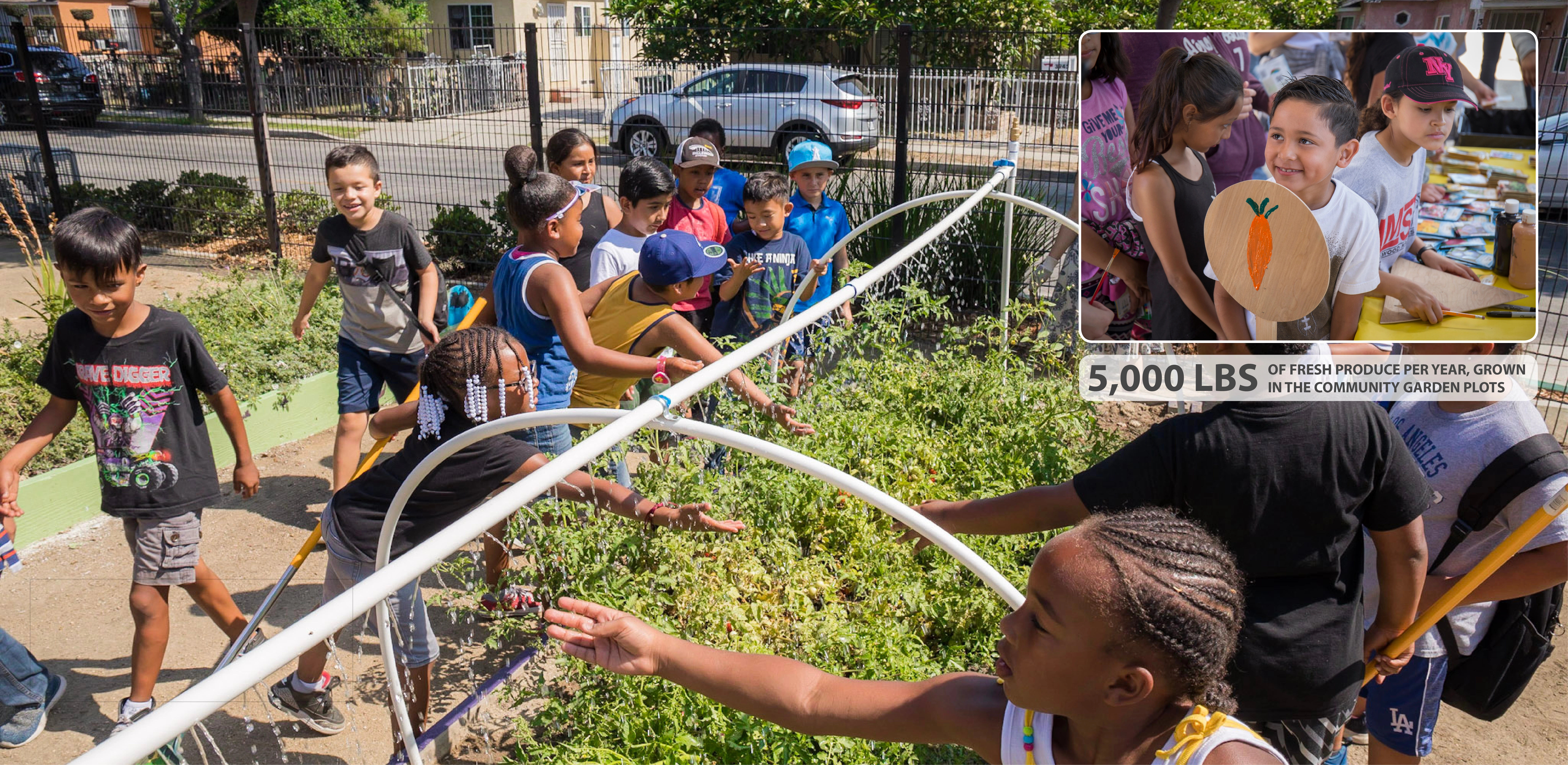 The urban scar left by the freeway has had both subtle and profound impacts on public well-being. Green space has historically been limited, and many residents (43 percent) must leave their neighborhoods to buy groceries – rendering Lynwood among the United States’ notorious “food deserts” due to its dearth of healthy eating choices. To ameliorate this disadvantage, one block of the park is fully devoted to a community garden, with 20 raised beds available for rent and 2 associated shared toolsheds. The garden promotes hands-on learning as well as heathy eating, and brings the community together in shared efforts to plant, cultivate, and harvest its own produce.