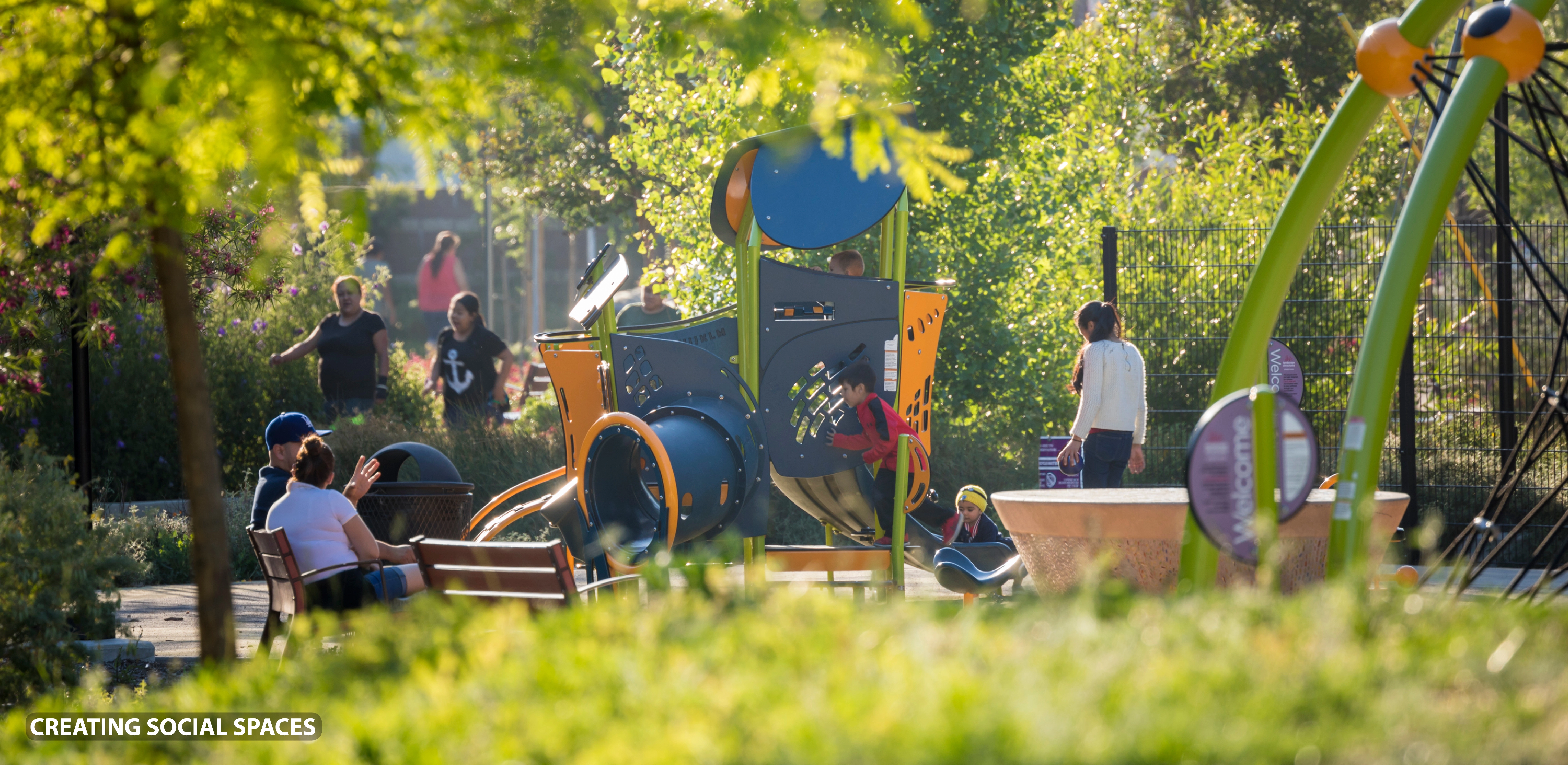In addition to the beautification of an abandoned lot, and the fortification of local food equity, the park is a critical artery for exercise and recreation. Fitness stations that support more intensive exercise programs in the neighborhood, along with a series of play structures, public artworks, and other amenities promote healthy lifestyles and establish a place for residents to gather, socialize, learn, and explore. Taking advantage of its geographic proximity to the LA River bike path, the linear park serves as a local gateway to regional recreational networks. Critically, the park also reconnects neighborhoods on either side of the freeway, offering a continuous path for walking and jogging as well as safe, accessible underpass linkages at each of its five block intersections.