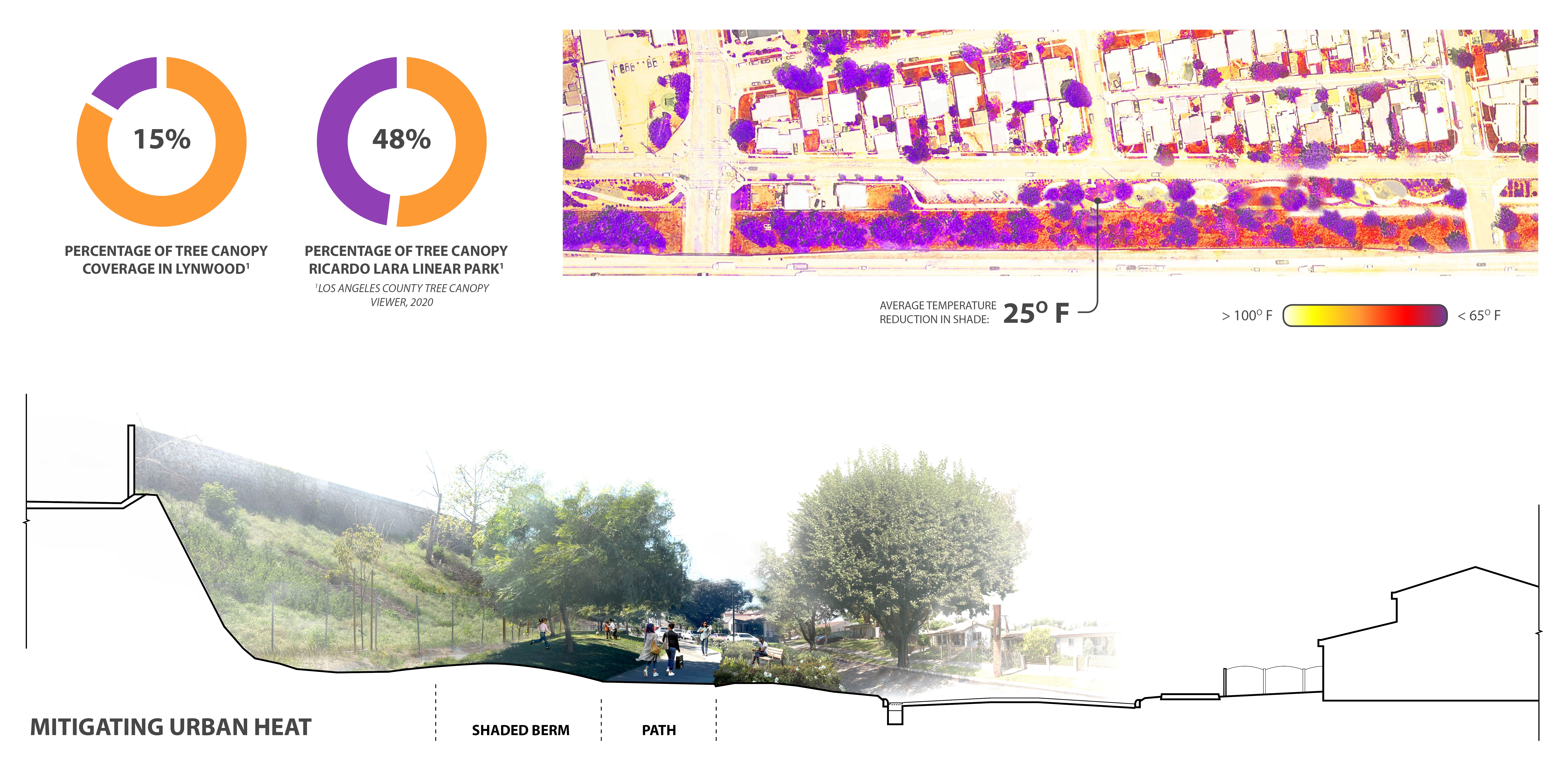 The United States is still recovering from urban renewal decisions to prioritize highways over communities, resulting in neighborhoods—primarily occupied by residents of color—that have been bifurcated by massive infrastructural barriers. Decades later, some of those disruptive decisions are beginning to be ameliorated, as are the communities impacted by them. One such community is Lynwood, California, where the five-block Ricardo Lara Linear Park replaces a barren, freeway-adjacent right-of-way with a shaded green space that affords park access to more than 26,000 neighbors. Rainwater capture and retention systems reduce runoff and address previous flooding issues, while also providing a dynamic and cooling feature that promotes exercise, agriculture, and togetherness.