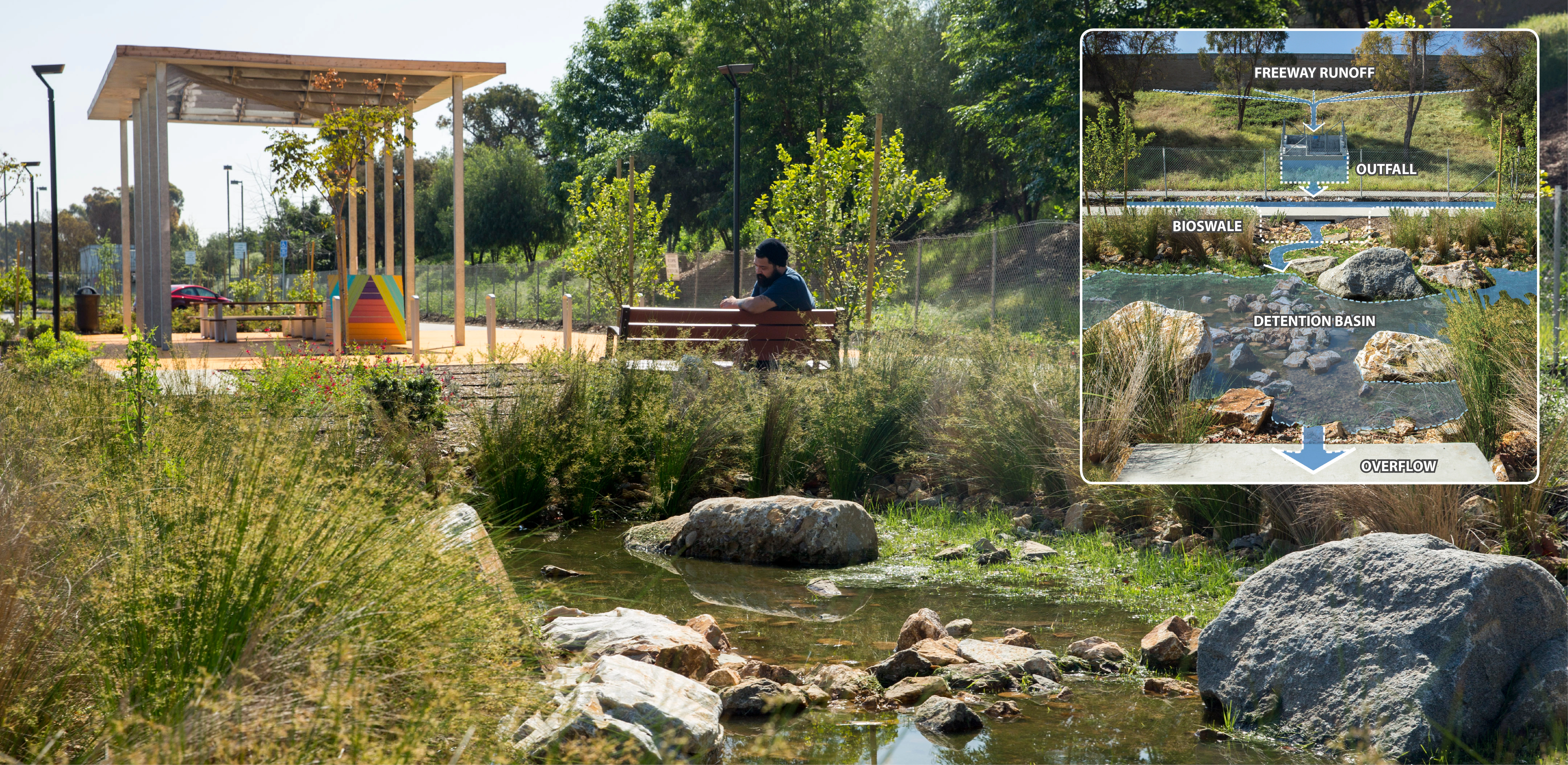 In one of the park’s crowning achievements, a series of strategically placed basins and bioswales now treat the equivalent of six swimming pools’ worth of runoff from the adjacent Caltrans embankment. This intervention doubles as a flood prevention strategy, addressing a problem that the neighborhood used to experience frequently. Over 200,000 square feet of pervious surface, bioswales, and detention ponds were added in total. Due to the topography of the surrounding site, the park encompasses a catchment area of 24 acres and collects 82,700 cubic feet of stormwater per year. The added bioswale in the park also filters polluted freeway runoff before it reaches the water table.