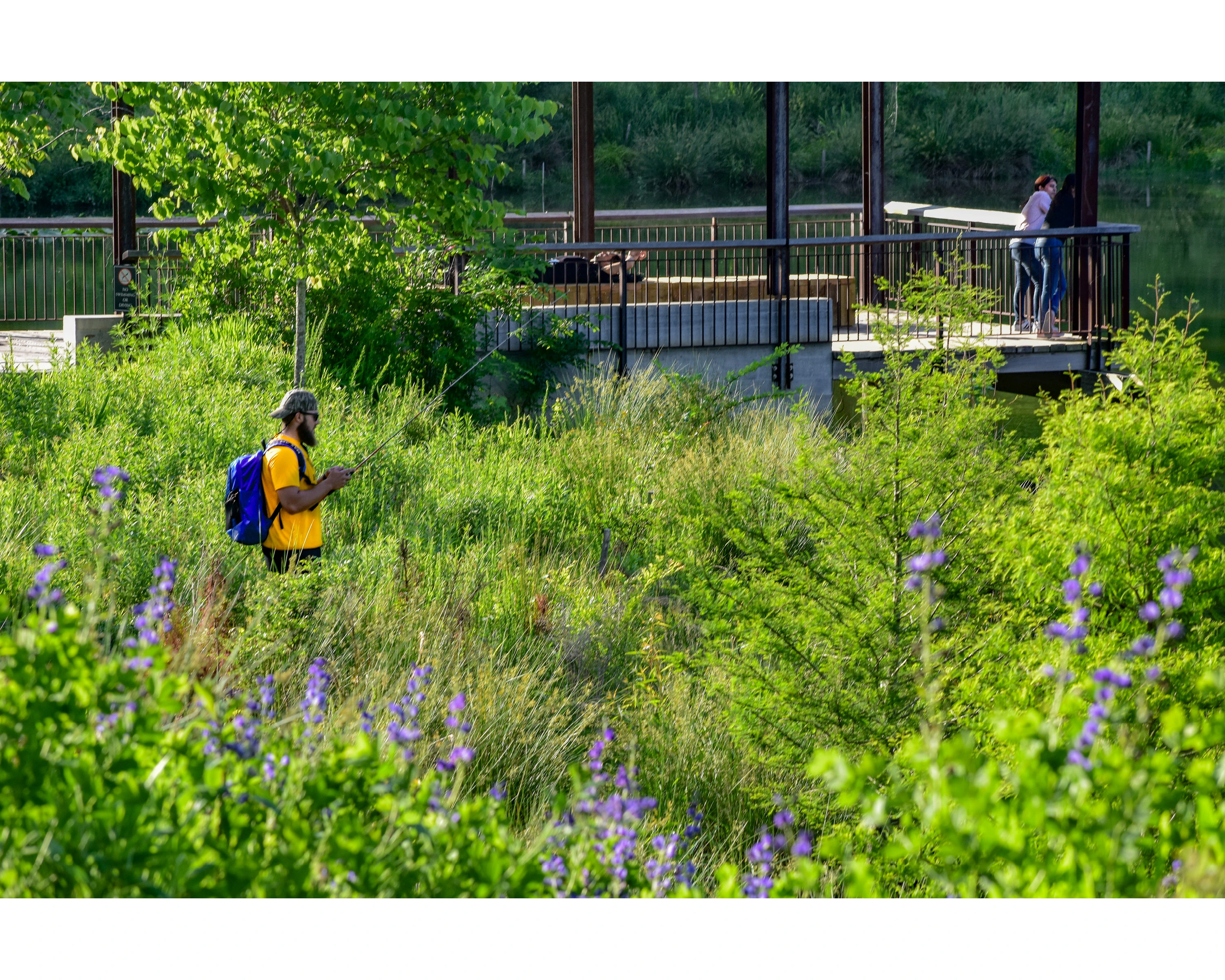 The pond now supplies more than 100 million gallons of non-potable water per year, supporting the chilled water plant, the university’s largest water user, to cool the campus. Capturing stormwater runoff from 265 acres containing the densest and most urban portion of campus, the pond effectively cleans this contaminated stormwater before slowly releasing it downstream into one of America’s most endangered rivers. The design team created a lush, vegetated edge with diverse trees and shrubs, and worked closely with faculty from Duke’s Nicholas School of Environment to develop a palette of native plantings that supports the school’s focus and helps to create an outdoor classroom for undergraduate students and graduate researchers. Over 40 herbaceous native plant species (emergent, wetland, and upland) respond to fluctuations in the water level depending on rainfall and campus demand. These plants are able to tolerate both hot, dry summers and soaking wet conditions. With the creation of new wildlife habitat, the site has become a model for biodiversity and supports numerous species of birds, insects, fish, and mammals.