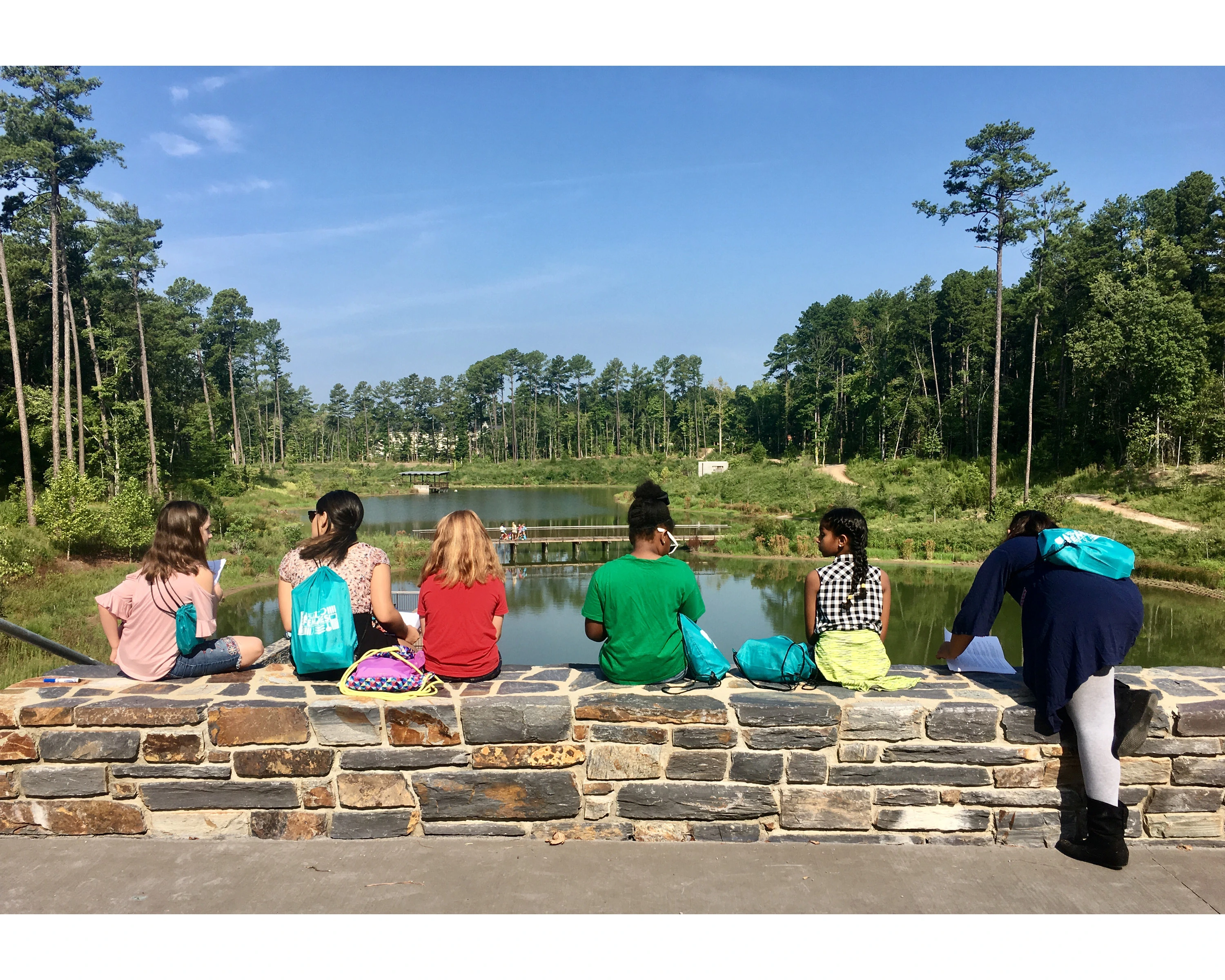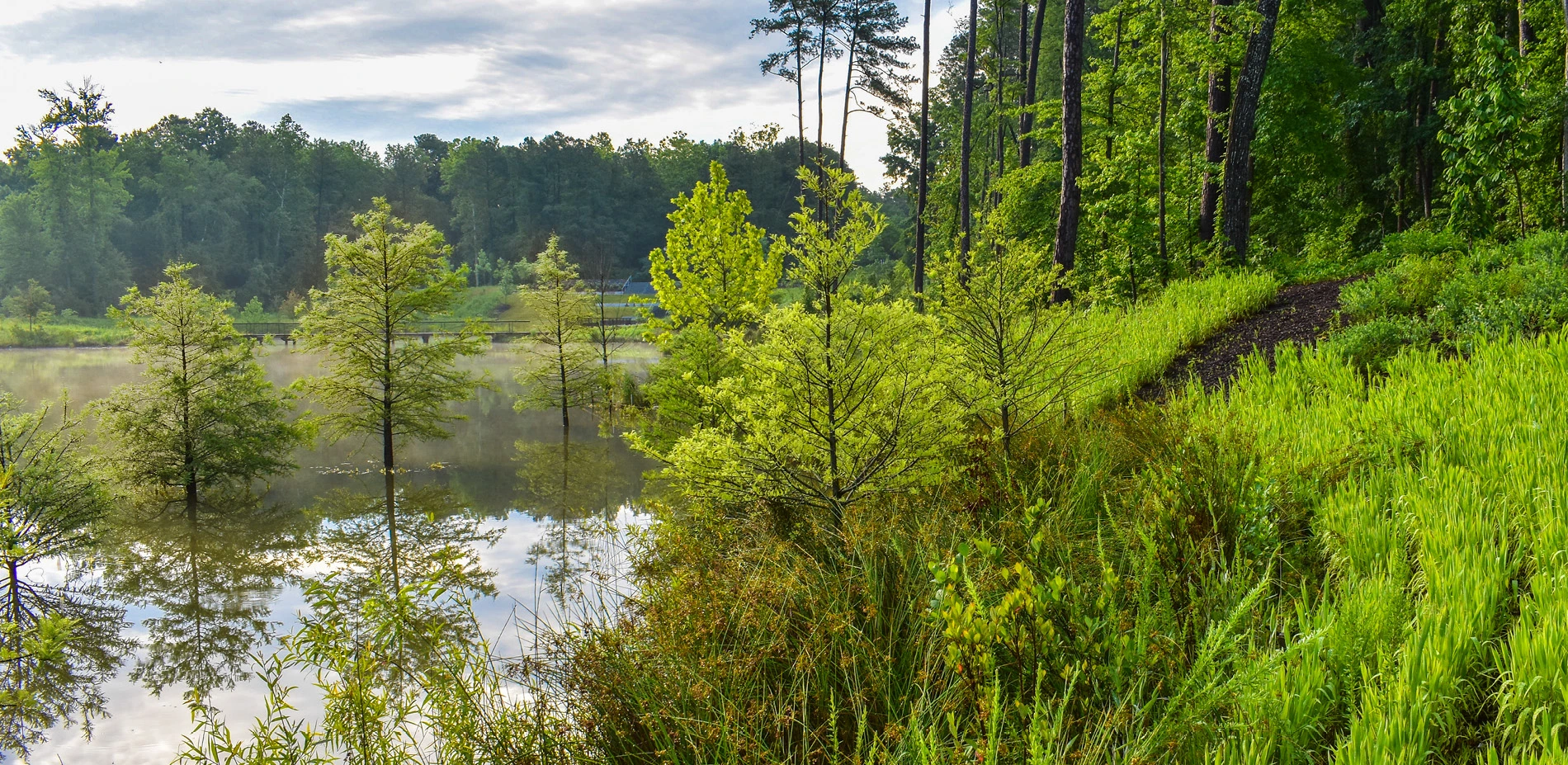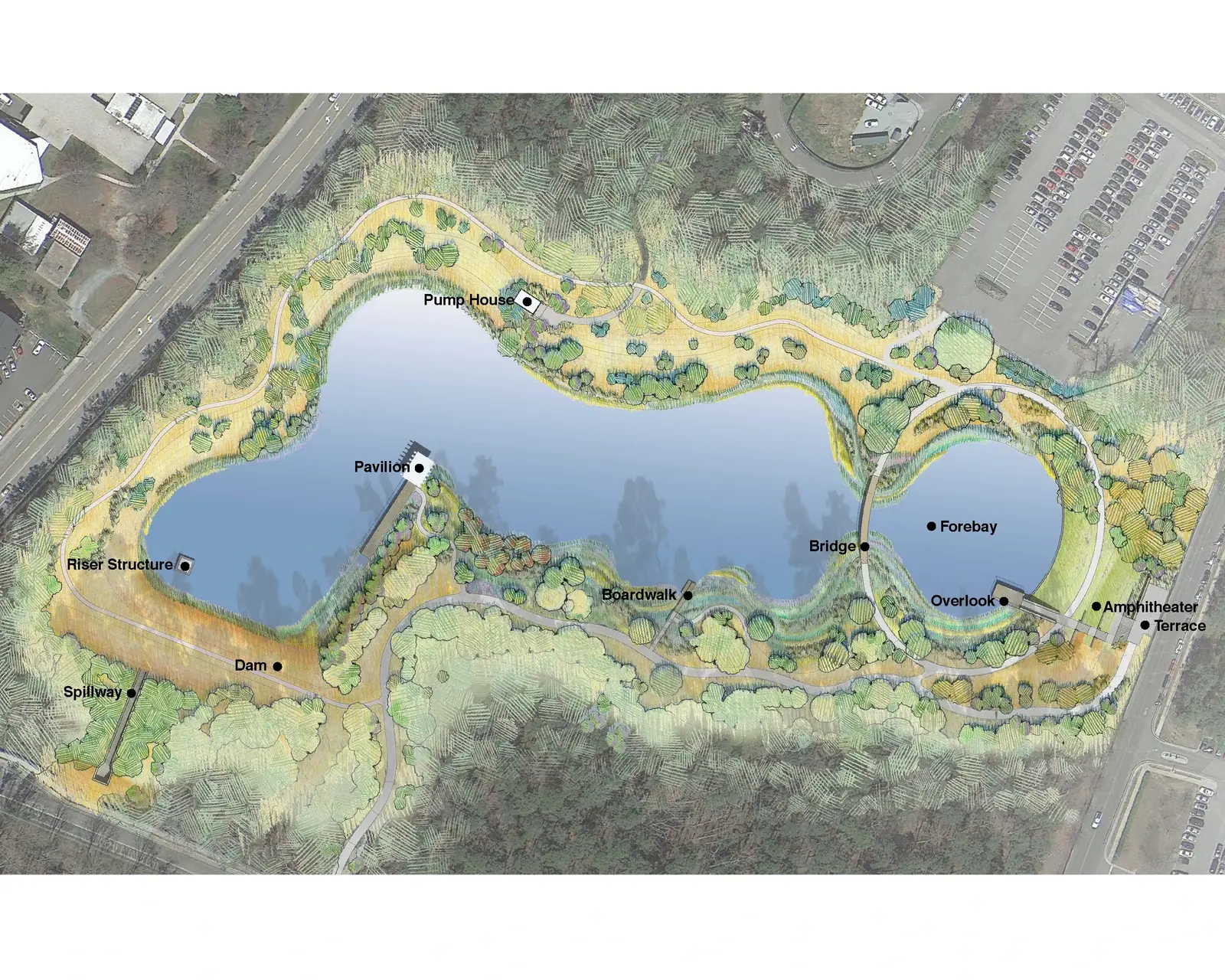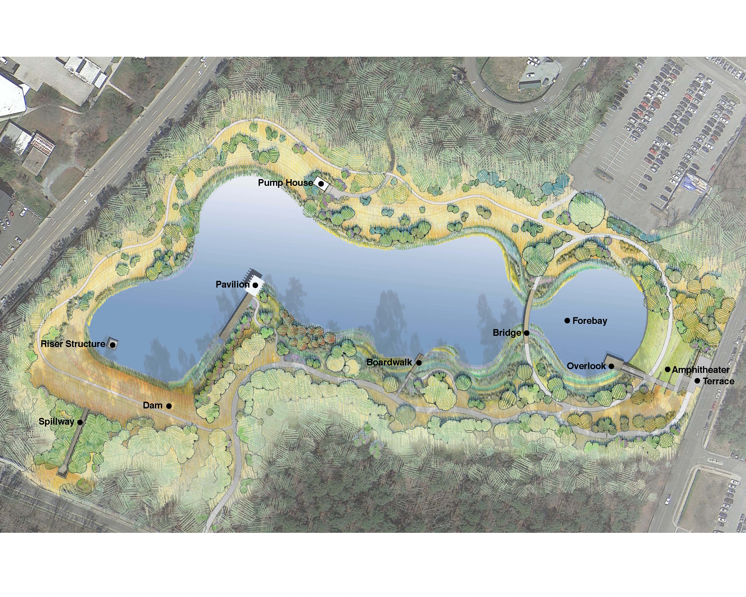 The design process prioritized collaboration. It was paramount that resultant designs embodied the values of the institution and the student body to its full capacity. Following a process involving students, faculty, and cross-disciplinary professionals, the new landscape is now deeply integrated into the daily rituals and activities of campus life. The balance of designed formal and informal elements allows the pond to mediate both its natural and cultural contexts. The northern edge of the pond is designed as a successional woodland negotiating the forested perimeter, while the south edge creates a series of wetland shelves providing multiple access points, views, and experiences - a pavilion and boardwalk structure and navigate the water’s edge; elevation markers located on the pavilion pilings provide visitors the opportunity to note the fluctuation of water during massive rain events or dry periods. Bald cypress are featured prominently as stabilizers of wetland shelves, and their cypress knees create visual interest as they mature. Access to all features in the pond landscape is comfortable and universally accessible, and the path system provides a beautiful recreation spot for the whole community.