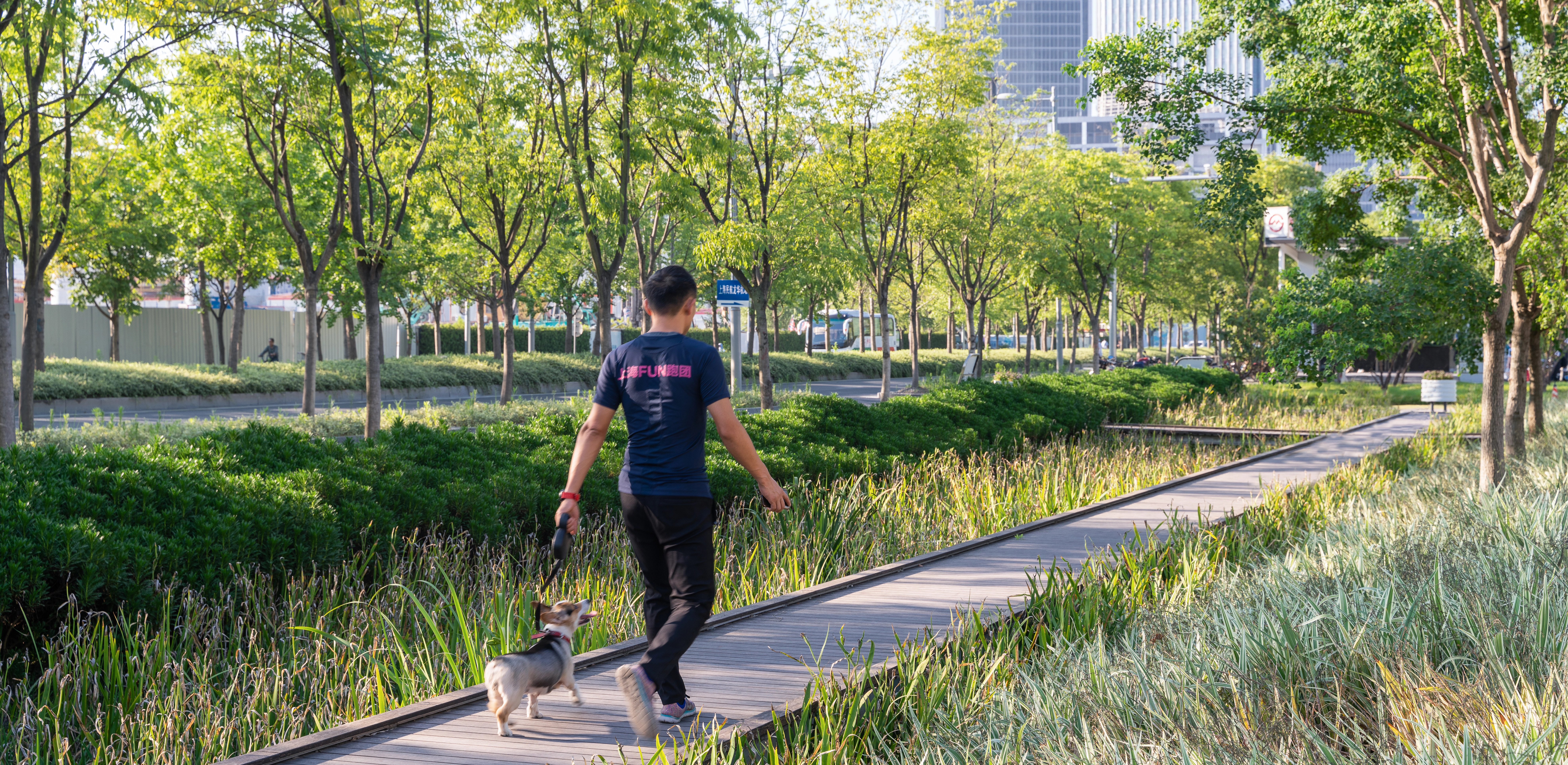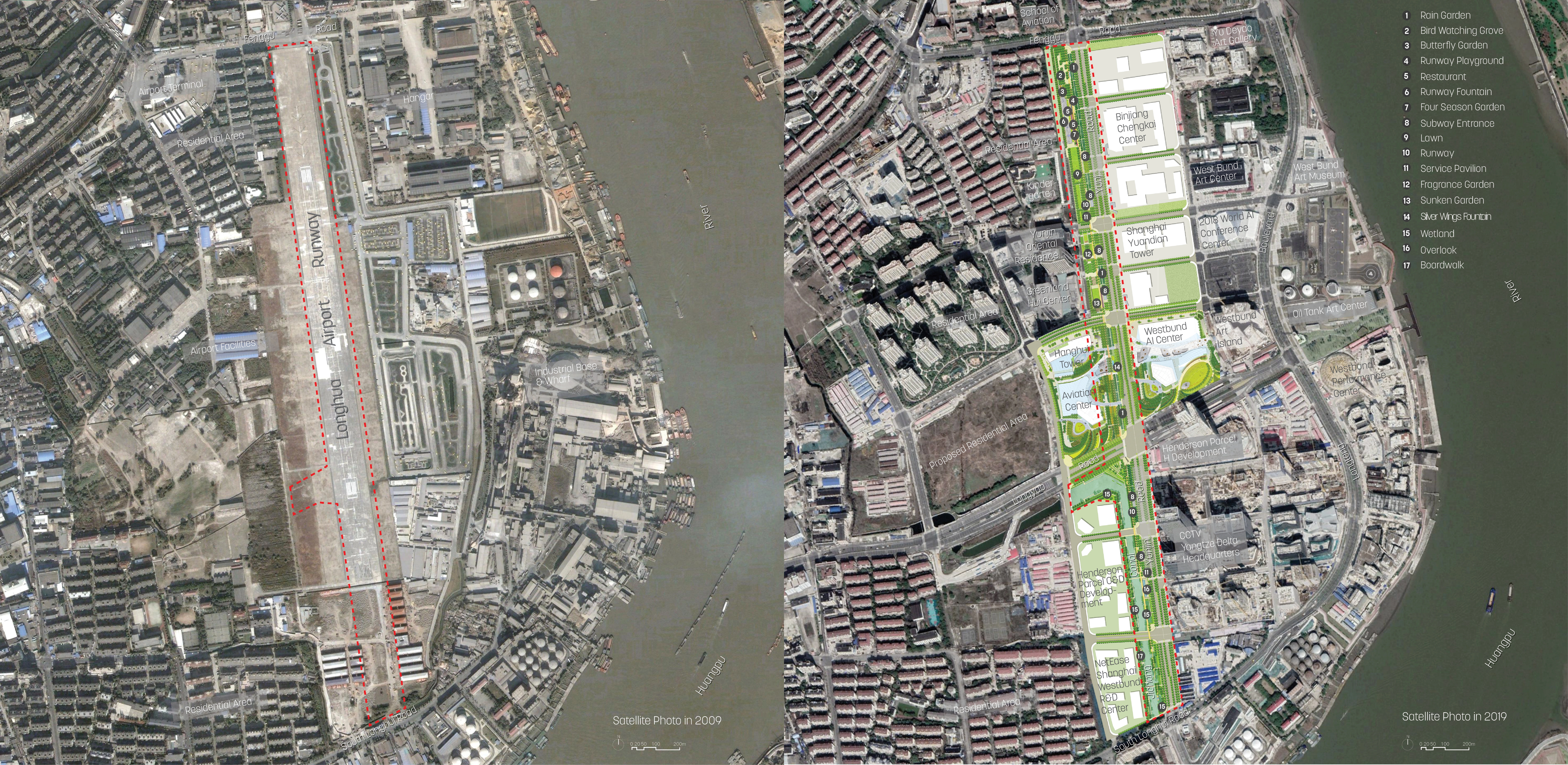 With the 21st century repositioning of the Xuhui Riverfront area as a contemporary mixed-use district, the historic runway is embracing its new life. Master planned as a side-by-side public street and linear park, the park provides a valuable open space corridor that serves the district’s high-density developments and offers a much needed recreational space for adjacent neighborhoods.