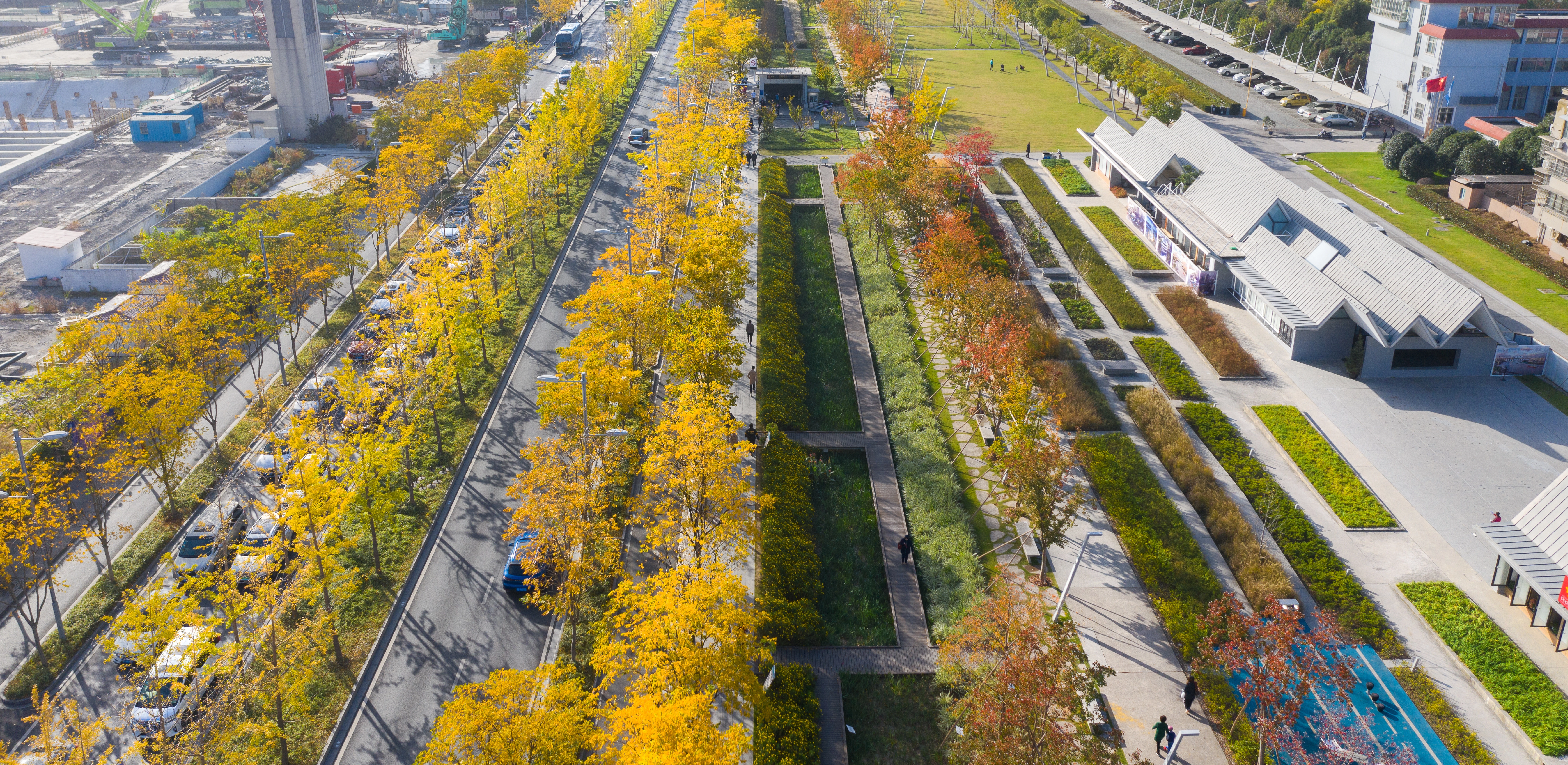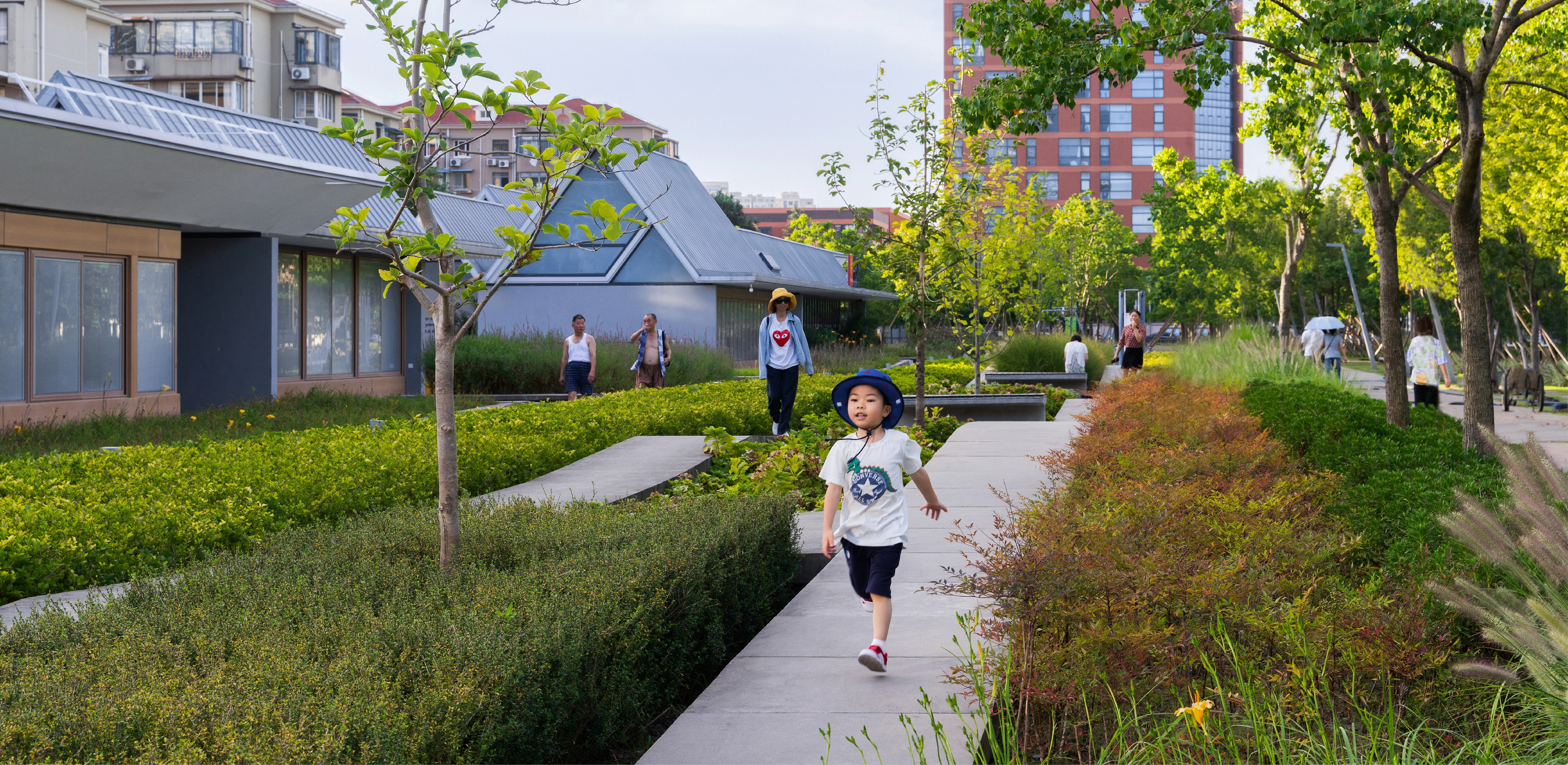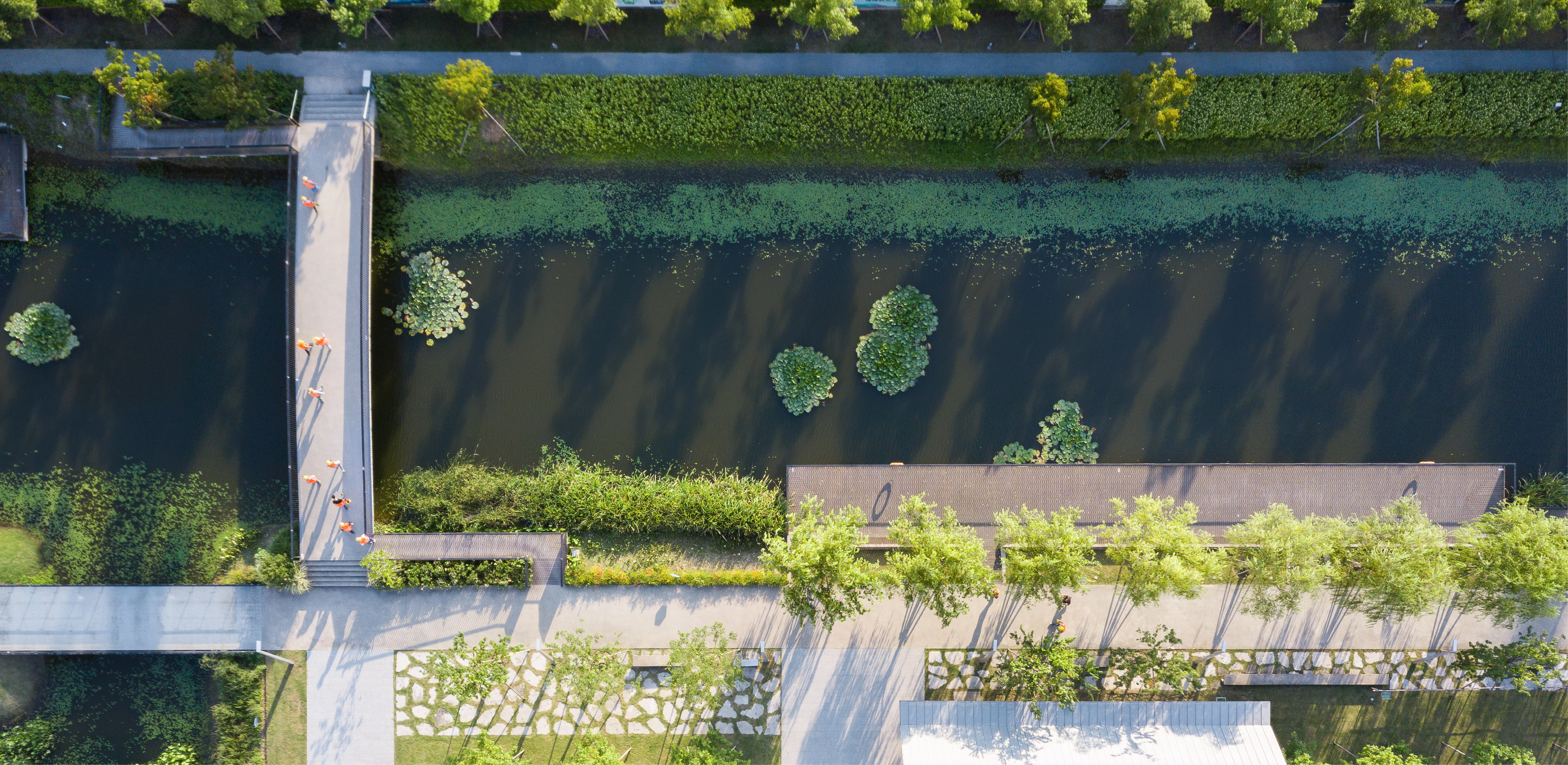 In rapidly developing Shanghai, a former airport runway becomes a linear park between high-rises, redistributed through careful interventions as runways not for planes but for trains, automobiles, bicycles, and people—done at scale with both intimate and expansive spaces. A linear waterway introduces marine wildlife into the park, also providing rainwater relief and flooding mitigation. Allées of ginkgos and trident maples reinforce the site’s linearity, which serves as connective tissue between residents of this growing neighborhood and the rest of the city.