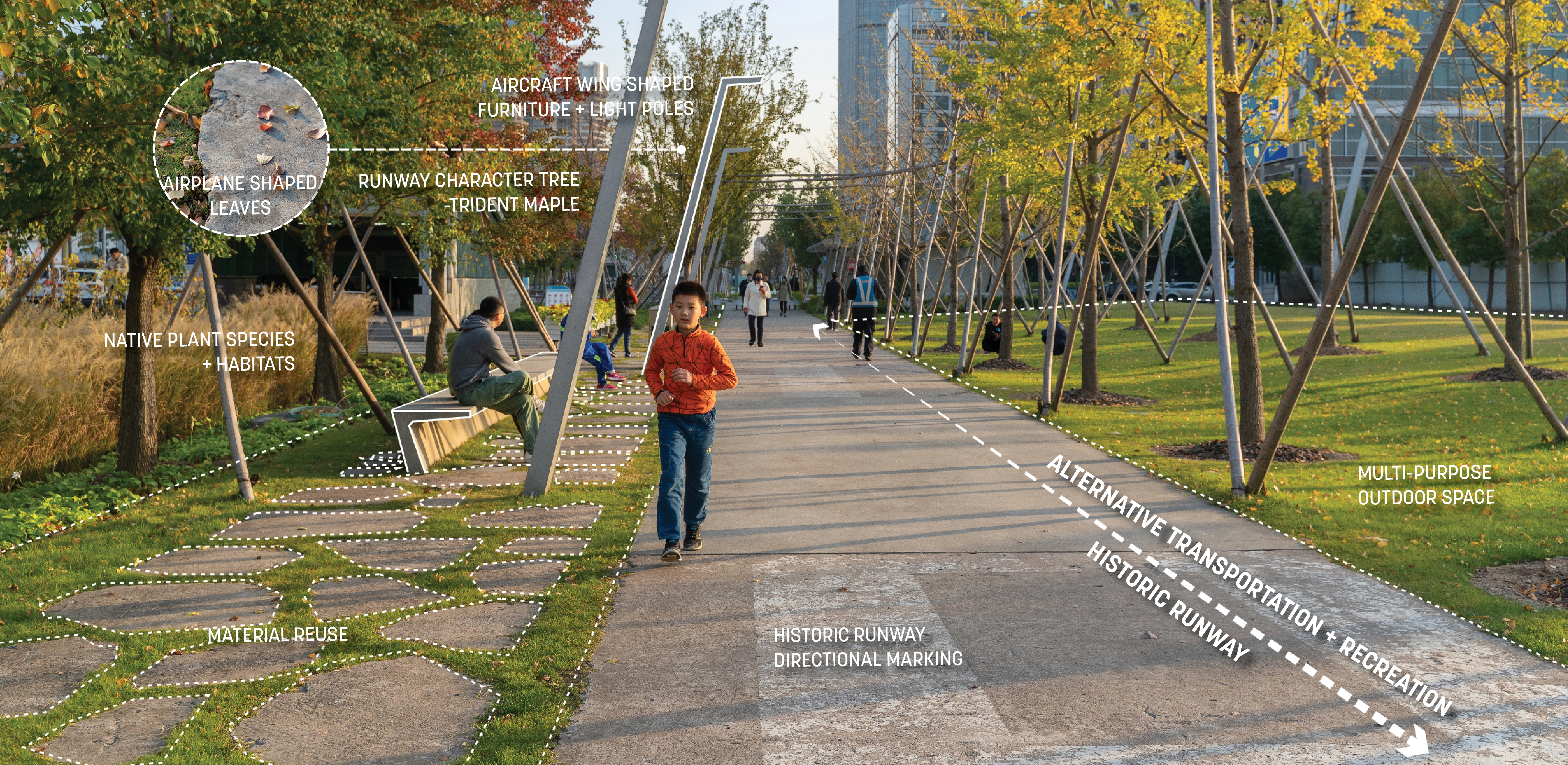 Portions of the runway’s original concrete were integrated in the park wherever feasible, prolonging the site’s memory. While large concrete panels are preserved along the main path, smaller sections of concrete from the demolished runway are reused at resting areas beneath groves of trees. The preservation and reuse of the runway concrete on site has not only saved construction budget, but also reduced greenhouse gas emissions from the manufacturing of new concrete. Concrete was also selected as a primary material for new construction throughout the park, to connect with the site’s past, while site furnishings are designed to evoke an aviation-inspired identity. The aerodynamic and industrial nature of the site is referenced in the light poles that recall the form of airplane wings, as well as the in-ground lights which outline the former runway’s concrete panels, mimicking runway lights. All site lighting is LED sourced, reducing annual electricity use by 167,000 kilowatts compared to metal-halide lighting.