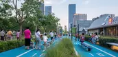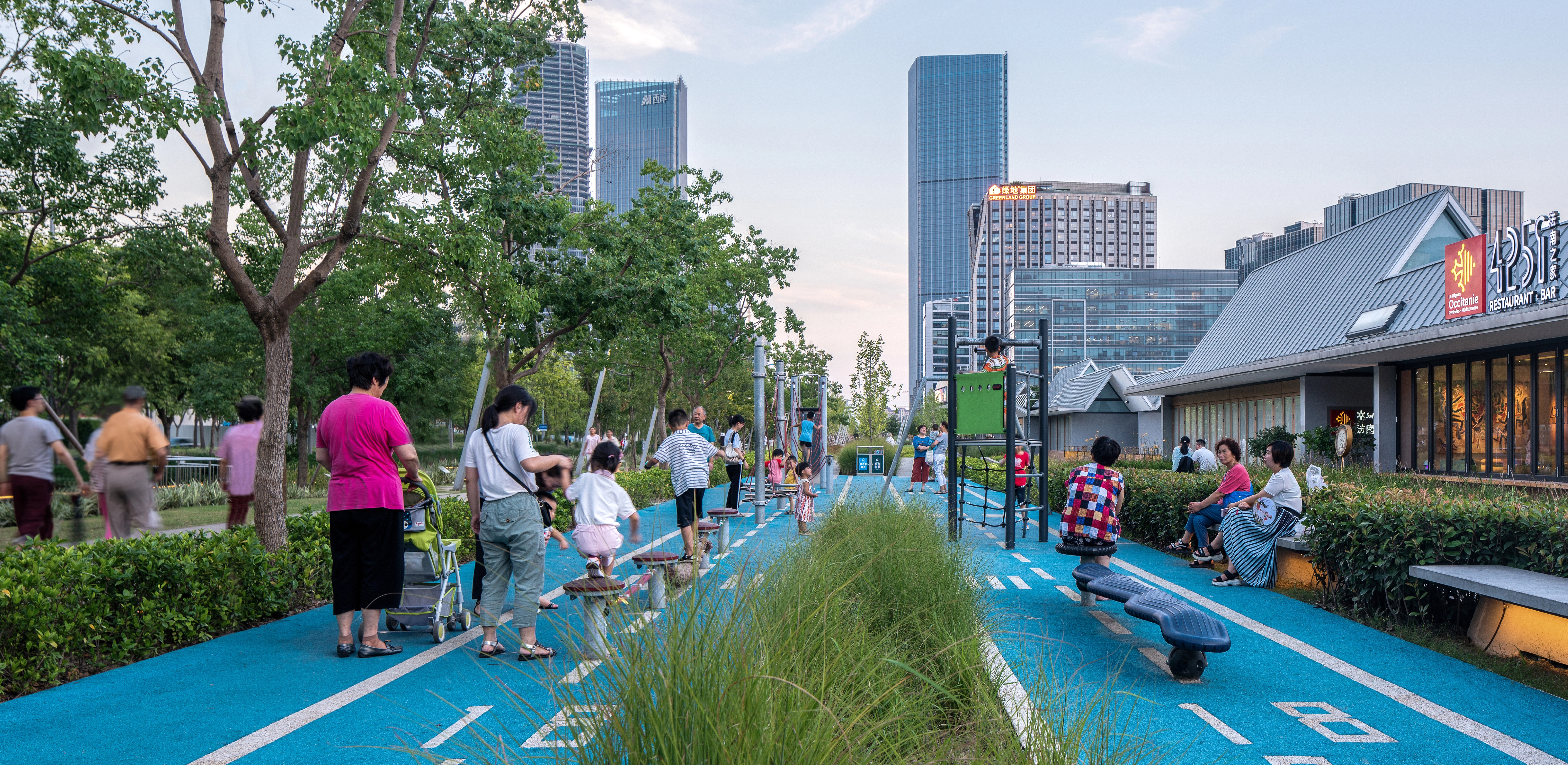 Xuhui Runway Park was built as a catalyst for the urban regeneration of Shanghai’s Xuhui Riverfront District. By establishing a state-of-the-art public realm at the heart of this former industrial district, the park has set a new model for innovative urban revitalization. With a design that mimics the motion of a runway, diverse series of linear spaces for vehicles, bicycles, and pedestrians organize the park and street into one interconnected sequence. This “runway of modern life,” offers recreational space for nearby office workers, students, and residents, and provides respite from the surrounding high-density redevelopment.