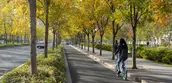The layout of Yunjin Road contributes to the urban scale of the district by limiting the number of vehicular travel lanes and promoting public transit over the use of personal cars. Designated bike lanes are integrated into the street section, facilitating the “last one kilometer” commute between transit and various destinations. Additionally, six rows of deciduous trees are planted along the sidewalks, bicycle lanes, and road medians, creating a comfortable microclimate, seasonal color, and a pedestrian-scaled boulevard.