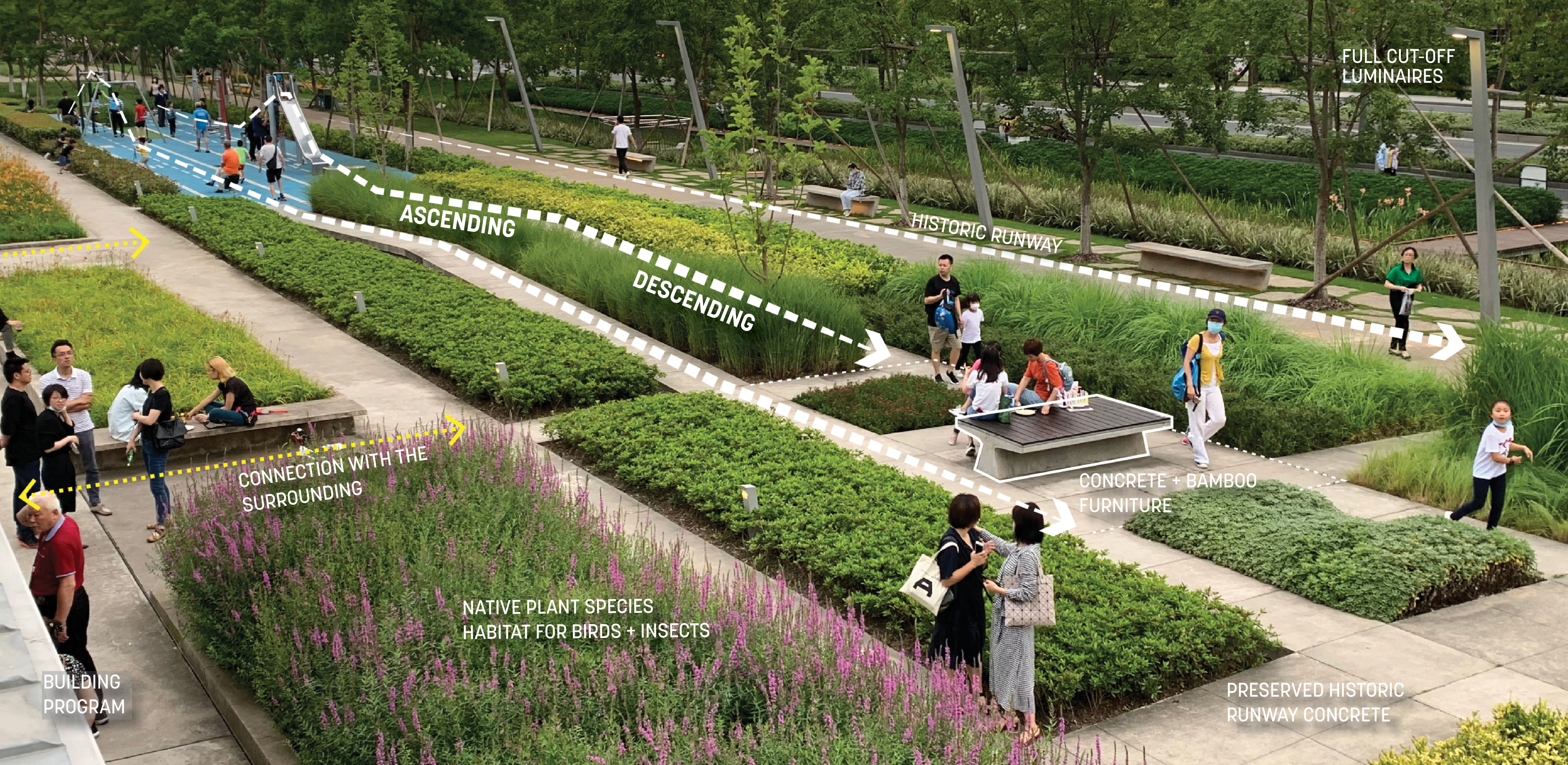 The project’s design promotes public transit, bicycle use, accessibility, community programming, as well as stormwater mitigation, habitat creation, material preservation and reuses. These strong sustainable initiatives have led to the park’s recognition as the first SITES Gold certified landscape in mainland China. The Xuhui Runway Park project transcends time and space, blending the site’s celebrated past with the contemporary urban center while setting a new standard for the reclamation of public space in Shanghai. -