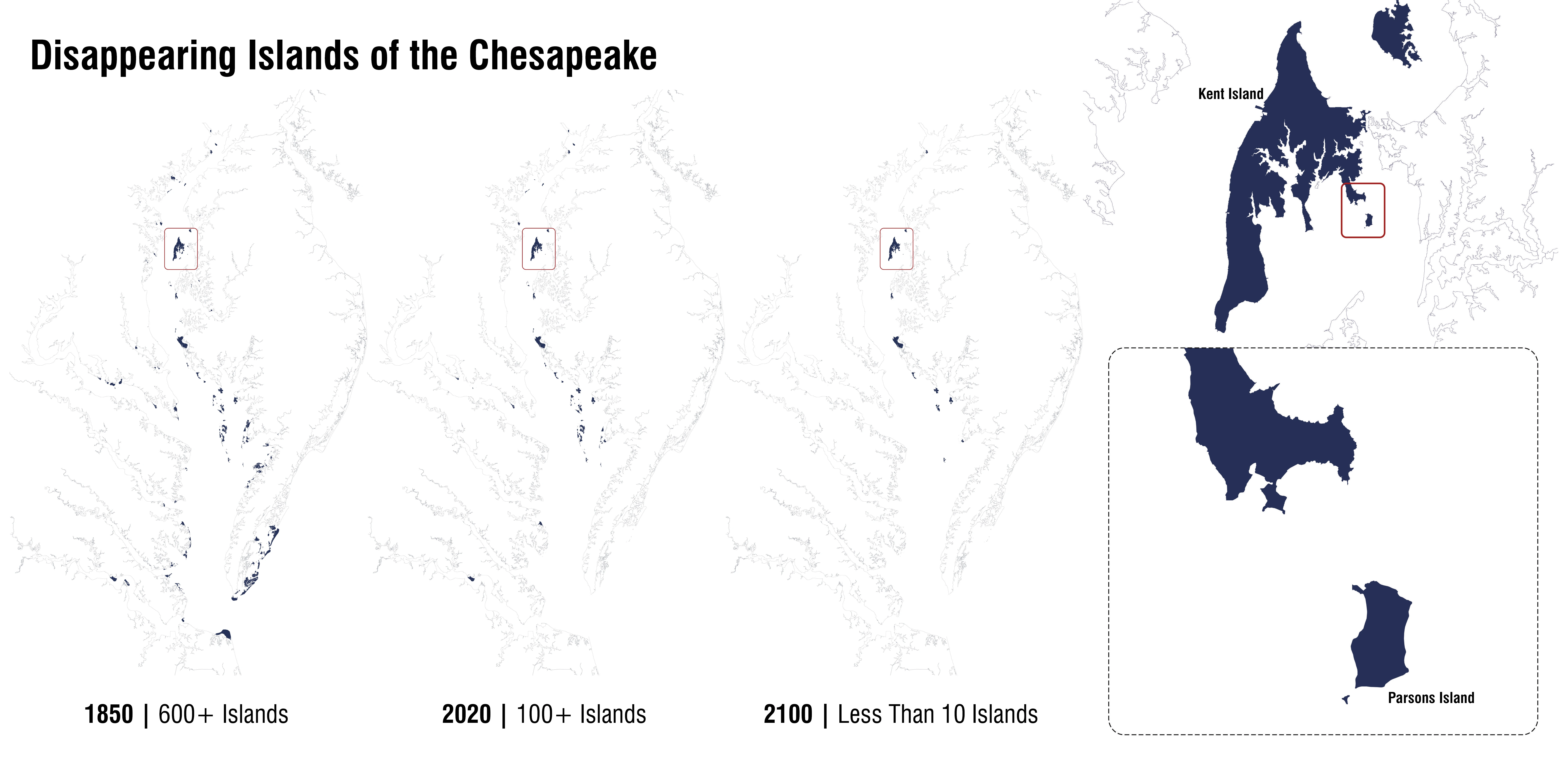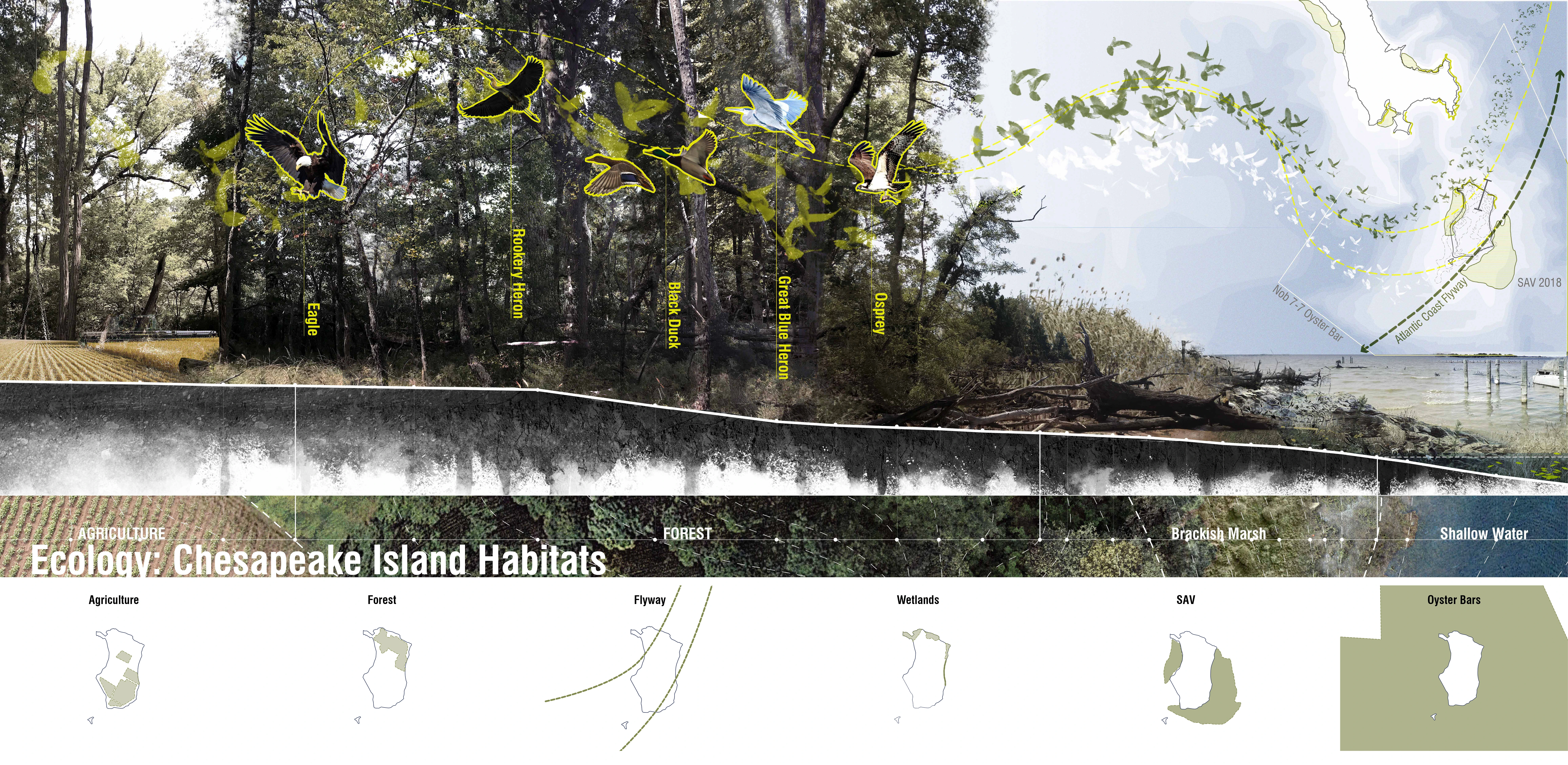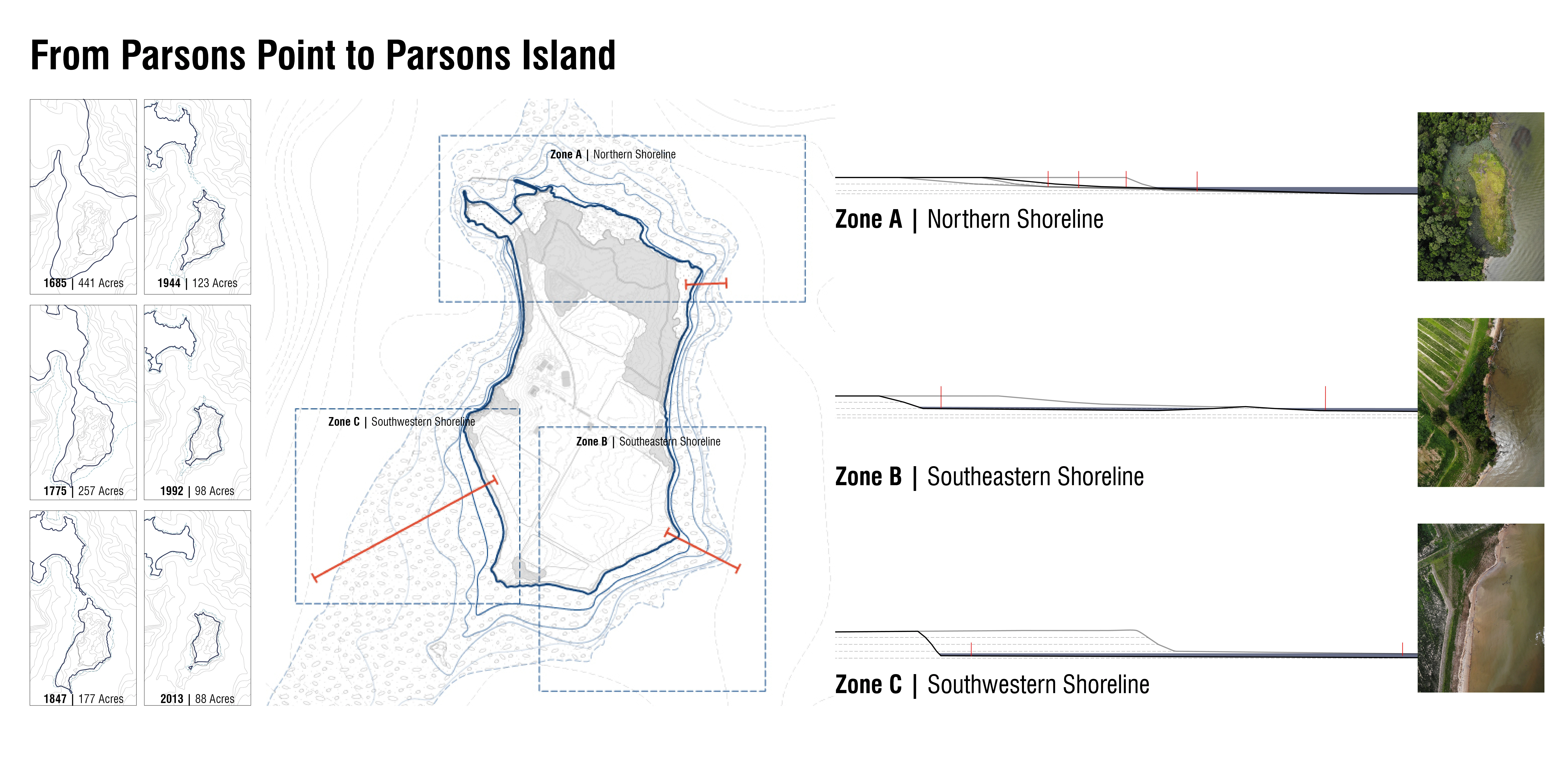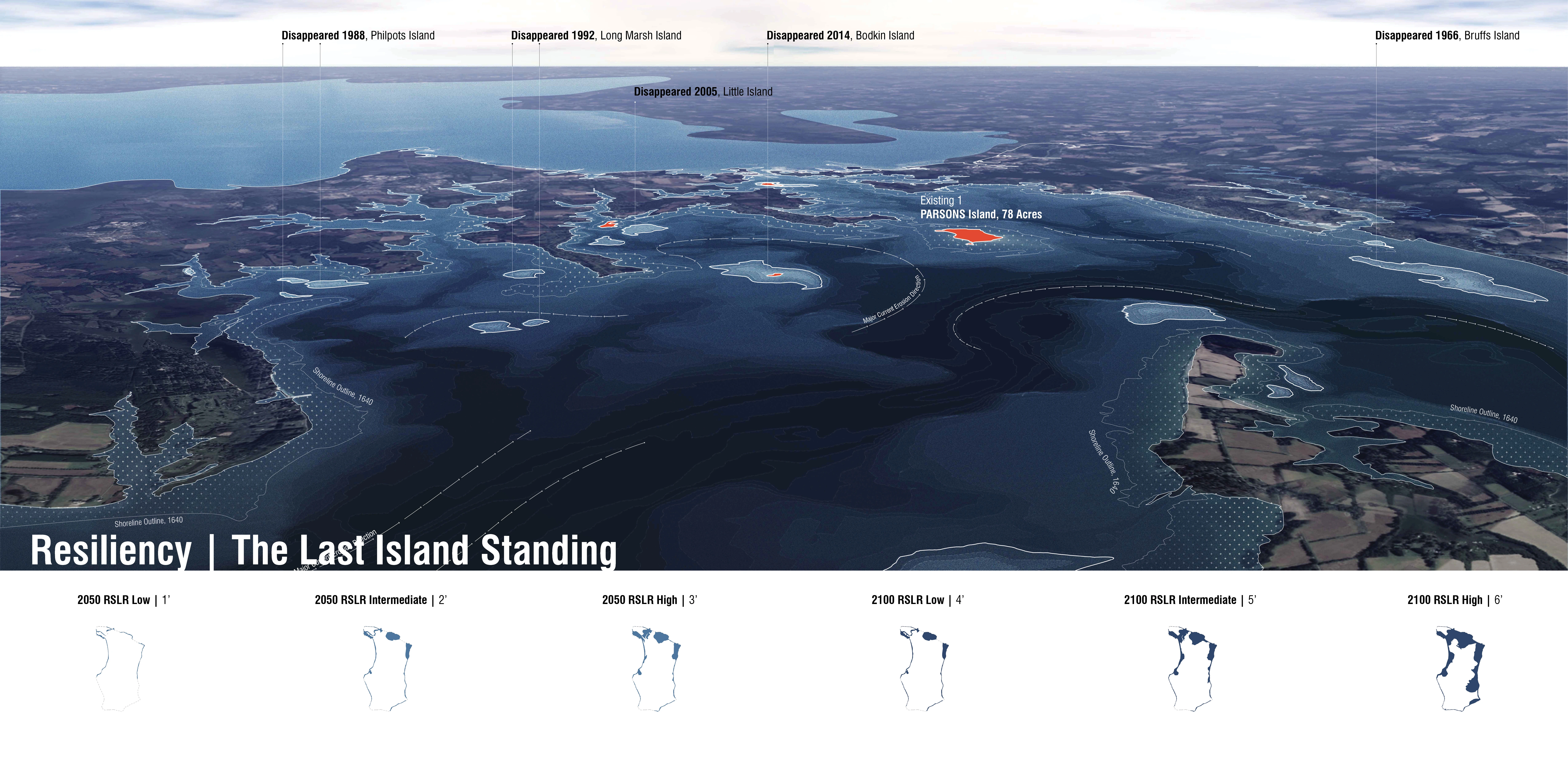Hundreds of islands have vanished beneath the waters of the Chesapeake Bay. Since 1850, this includes approximately 10,500 acres of island habitat as well as an unknown number of invaluable cultural and archaeological artifacts, some dating back 20,000 years. Land subsidence, rising sea level, and wave-induced erosion, both natural and anthropogenic all contribute to and compound this ongoing and accelerating landscape saga. The Parsons Island Conservation and Regeneration Plan proposes to collocate opportunities for cultural resource conservation, habitat regeneration, and resiliency enhancements on this unique Chesapeake Bay island as both a means and method to catalyze collective action and stimulate impactful stewardship. Considered within the context of large-scale, federally funded island restoration projects in the Chesapeake Bay, this cooperative and adaptive undertaking represents a new approach in addressing the loss of valuable islands in the nation’s largest estuary.