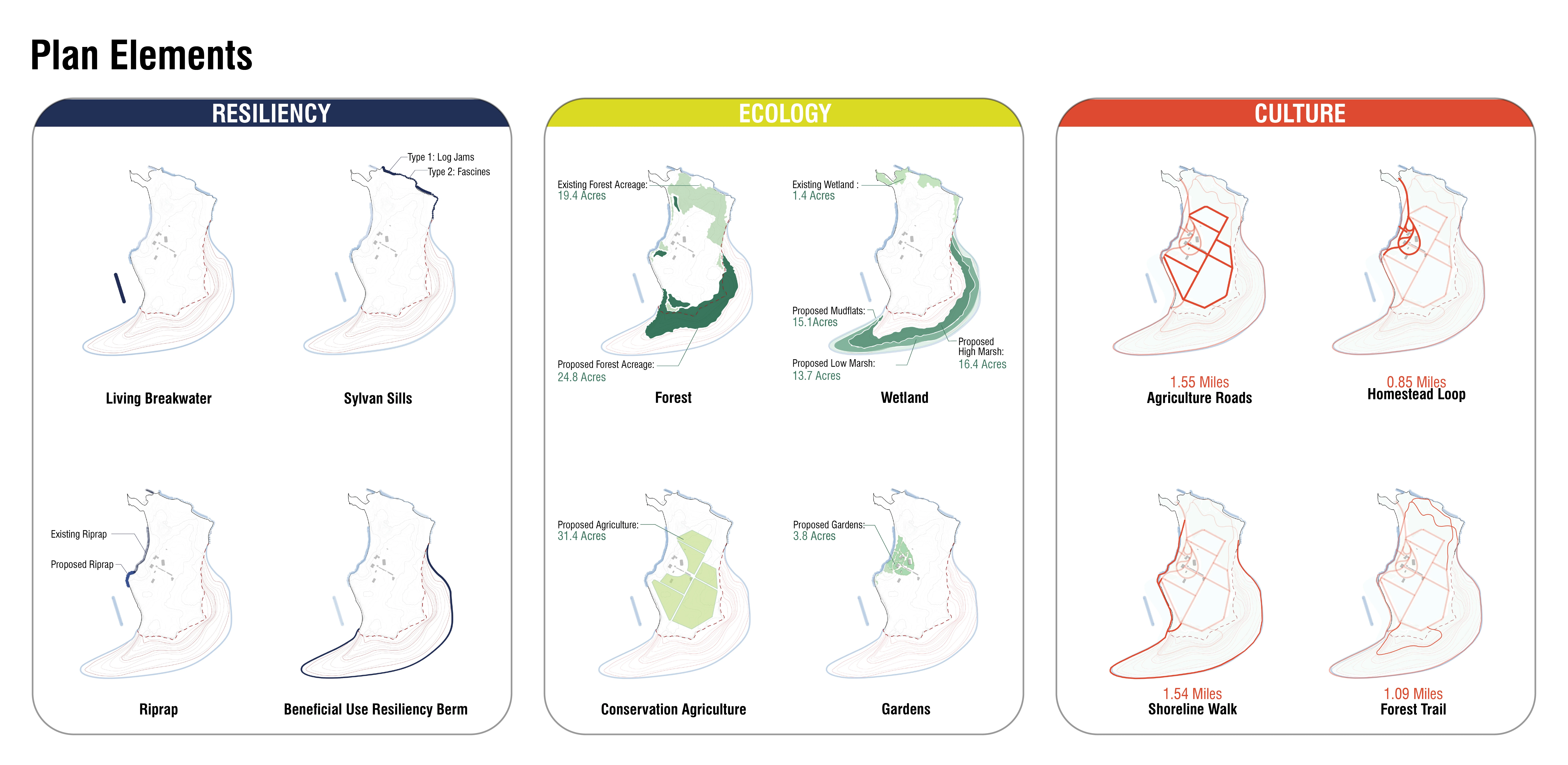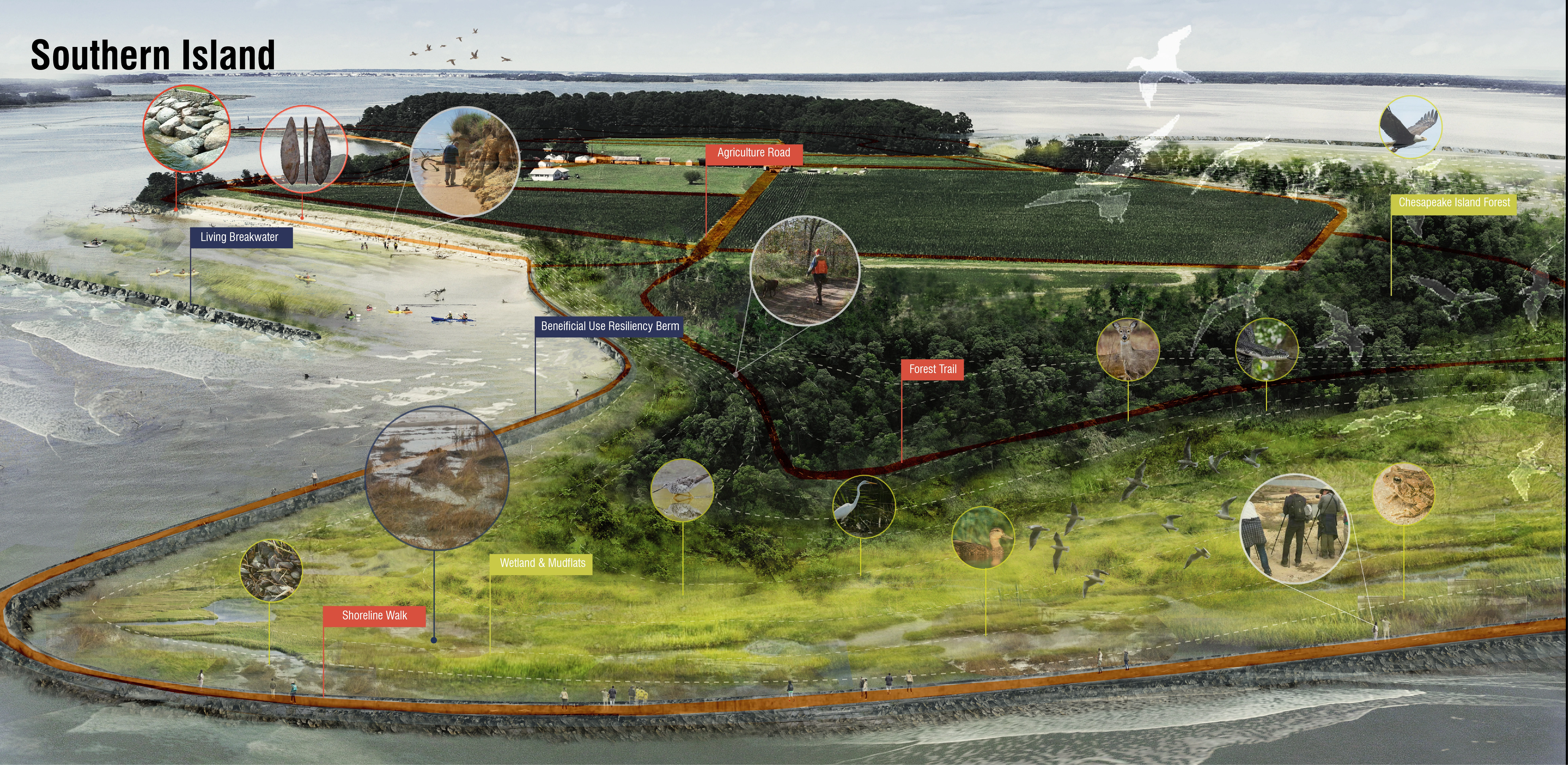 These integrated stick, stone, and sediment strategies will create a series of richly textured and high performing landscapes that reveal and enhance the islands cultural, ecological, and resiliency assets. A network of connected trails and interpretive elements including shoreline paths, forest walks, agricultural roads, and a homestead will weave together these quintessentially Chesapeake experiences creating a one-of-a-kind public landscape that sets a new precedent for conservation and regeneration in the region.