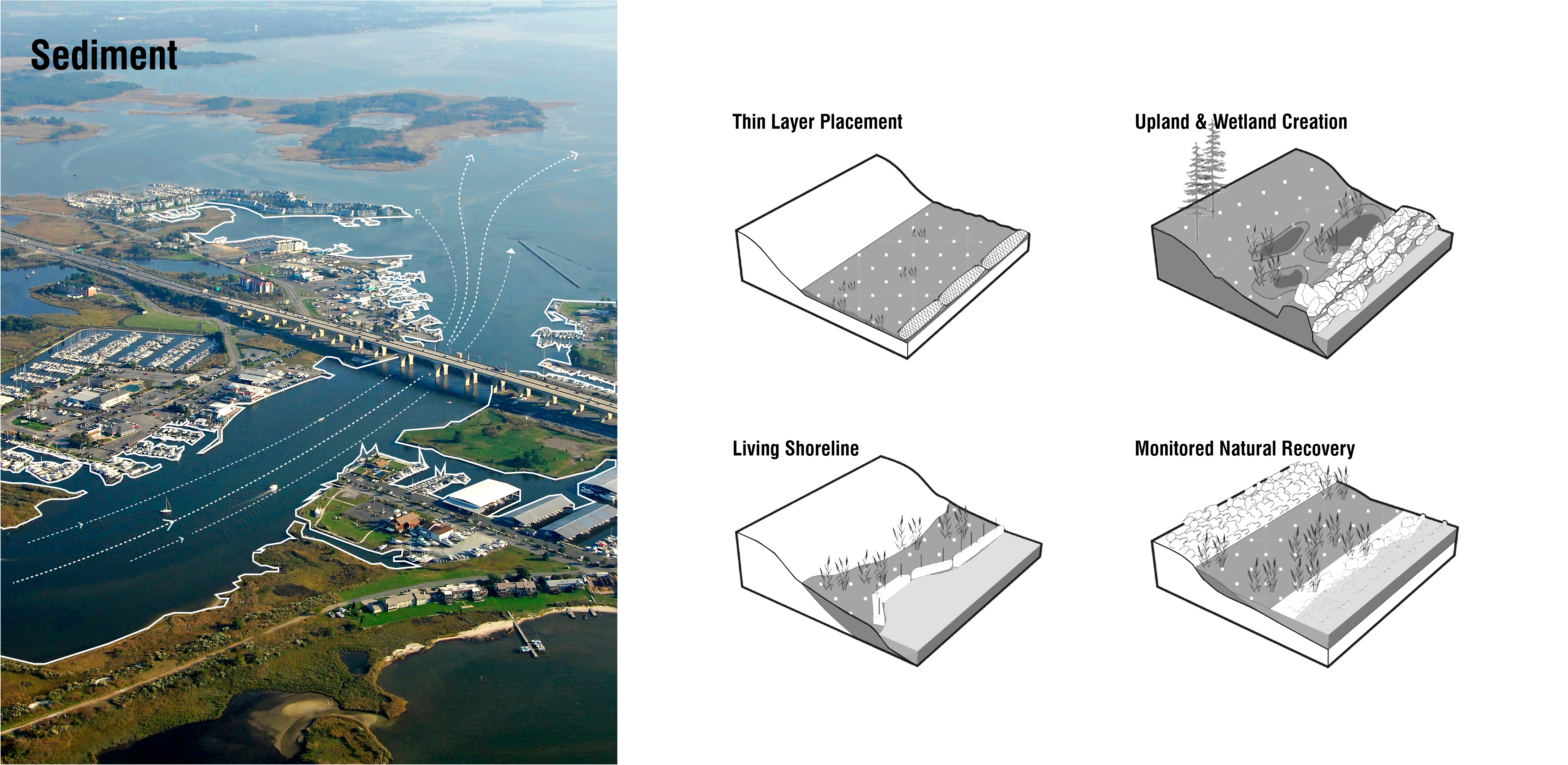 The Parsons Island Conservation and Regeneration Plan thus prioritizes the use and simple reconfiguration of existing local materials to achieve desirable outcomes that are contextually-relevant, cost effective, modular, and scalable. This approach focuses on three primary material types found on or adjacent to Parsons Island – sticks, stones, and sediments. Fallen trees including trunks, roots wads, and branches that have succumbed to wind and wave driven erosion will be relocated and reconfigured as ‘sylvan sills’ serving as wave attenuating and sediment catching features that also provide new aquatic habitat in the nearshore of the northern portion of the island adjacent to the existing stand of forest habitat and wetlands where wave energy and erosive forces are at their lowest. This stick strategy includes two types of ‘sylvan sills’ – log jams for the more highly eroded stretches of forested shoreline and fascines for the interface between wetlands and water. Along the southwestern shoreline where high intensity waves and erosion have exposed the islands pre-native artifacts for discovery, a stone strategy includes riprap, both repurposed and introduced, that will provide not only coastal protection, but also opportunities for accessibility and habitat enhancements via stone stairs and textured planting pockets. Riprap and engineered ecoblocks will also be combined to create a living breakwater in the offshore environment that aims to protect the island from continued erosion while preserving the visibility of its cultural resources and creating opportunities for public education and interpretation. Parsons’ sediment strategy will leverage dredged material from the nearby Kent Narrows waterway, which must be excavated every three years to maintain navigable depths at the expense of state taxpayers because it is not a high-volume shipping channel eligible for large federal funding. Repurposing this sediment to regenerate a portion of the island’s original footprint including new mudflats, SAV beds, tidal marshes, and island forest will nearly double the total acreage of habitat at Parsons from 78 acres to 145 acres, provide enhanced coastal resilience for land leeward of the island in Eastern Bay, and offer a cost-effective way to manage local sediment balances in the larger basin.