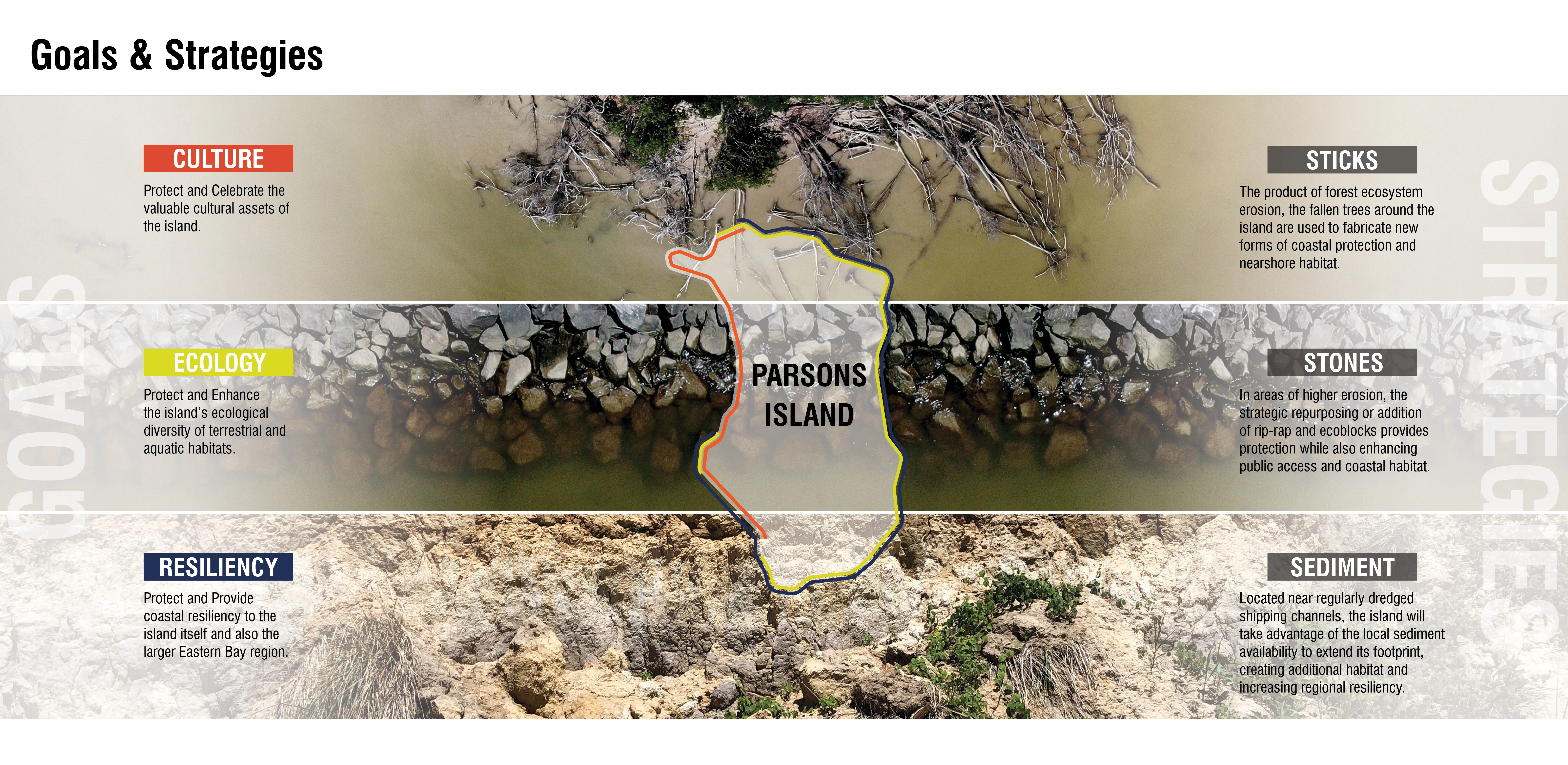 Parsons Island provides a unique opportunity to demonstrate the value of a multi-functional collection of landscape interventions designed to work together to achieve wide ranging public benefits. This strategy of collocating opportunities for enhancements also illuminates and leverages the thickly tethered network of cultural and ecological relationships present within the coastal environments of the Chesapeake – relationships that are invariably influenced by politics and economics. While considered separate subject matters and regulated by a myriad of state and federal agencies, the cultural, ecological and resiliency value of Parsons Island are all linked to one another. These conceptual and physical linkages are the foundation of the Parsons Island Conservation and Regeneration Plan and provide the nexus for development of strategic partnerships, planning frameworks, and site specific design strategies that aim to positively affect all three subjects by positioning each proposed modification within an interconnected system of incremental investments.