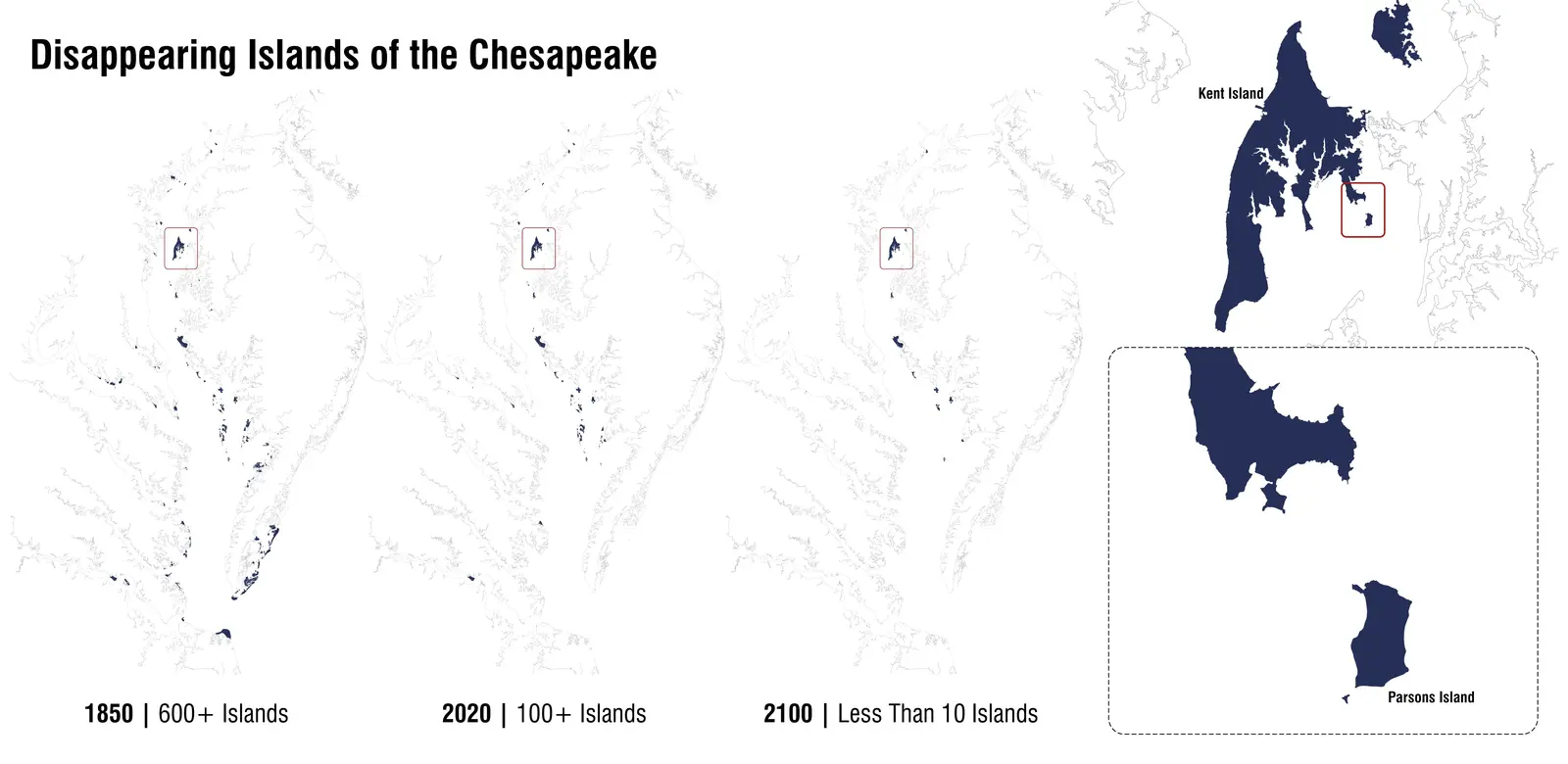 The challenges facing Parsons Island are considerable and compound, but not unique. In the Chesapeake Bay, rising sea levels and land subsidence indicate a relative sea level rise of between 4.8mm – 6.3mm annually; close to three times the global average of 1.7mm per year. The rising waters and subsidence of land in the Bay, combined with wind and boat-driven waves create a system of forces that have effectively erased hundreds of islands from existence. The dramatic reduction of Parsons from a 447-acre point to a 78-acre island is a sobering story shared by many, now lost, islands within the Bay. Further compounding these environmental challenges are the economic and political forces that align to allocate and appropriate billions of dollars of federal and state funding to mega projects that target island restoration efforts on the magnitude of 1,000+ acres like Hart-Miller Island, Poplar Island, and the Mid-Bay Islands projects, which leaves scant resources for more modest island restoration projects like Parsons. The Parsons Island Conservation and Regeneration Plan responds directly to these compound environmental, economic, and political challenges by collocating opportunities for cultural resources conservation, ecological uplift, and climate adaptation and resiliency.