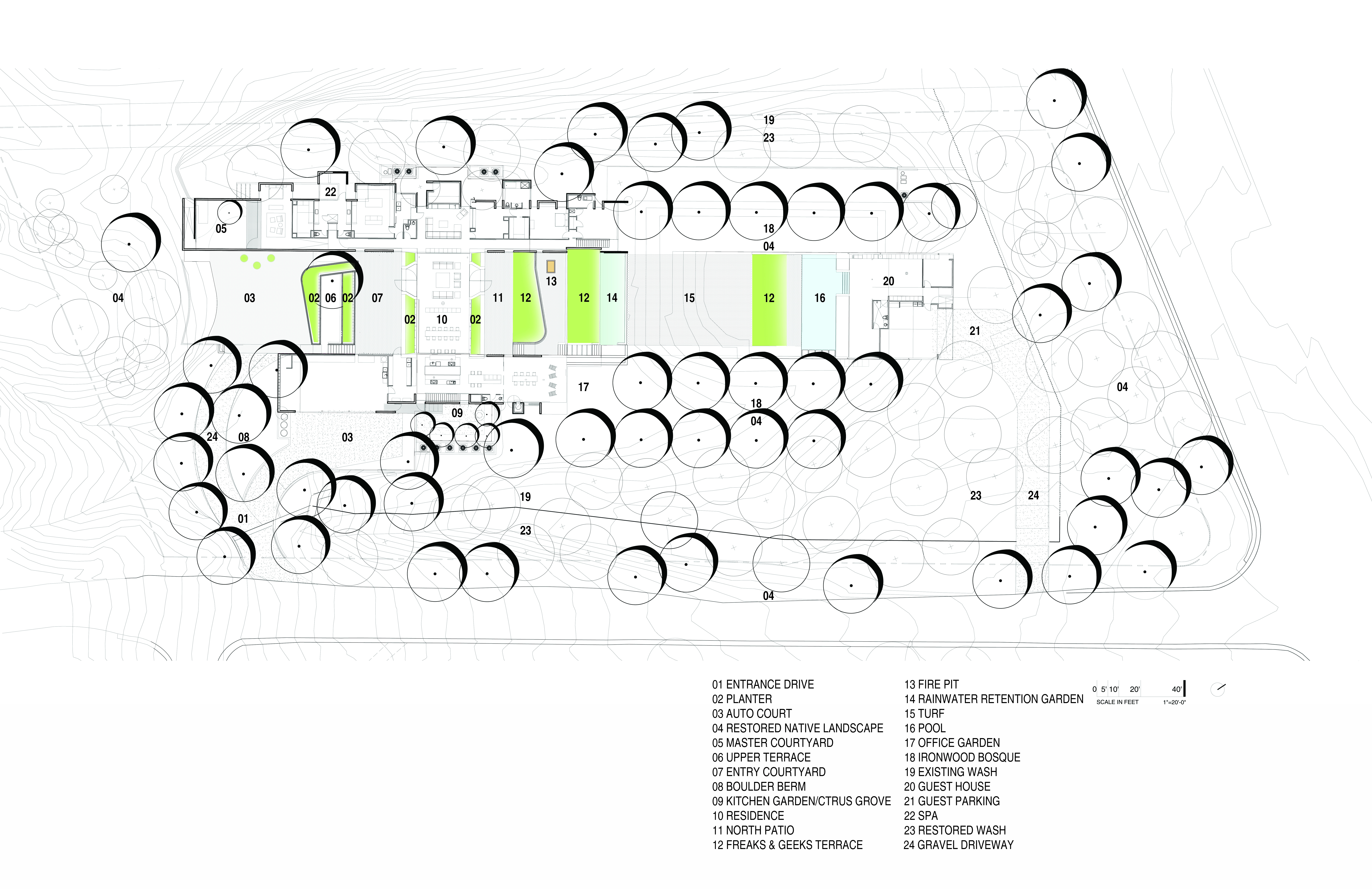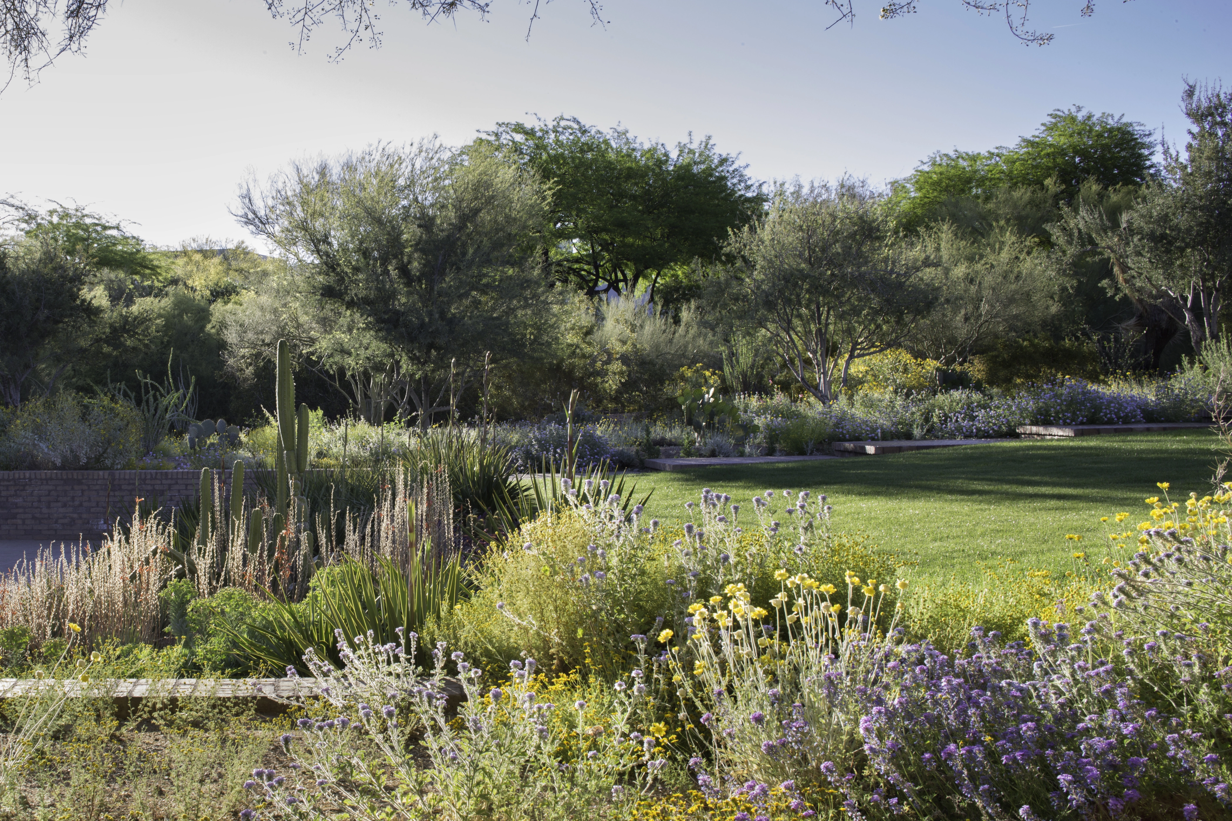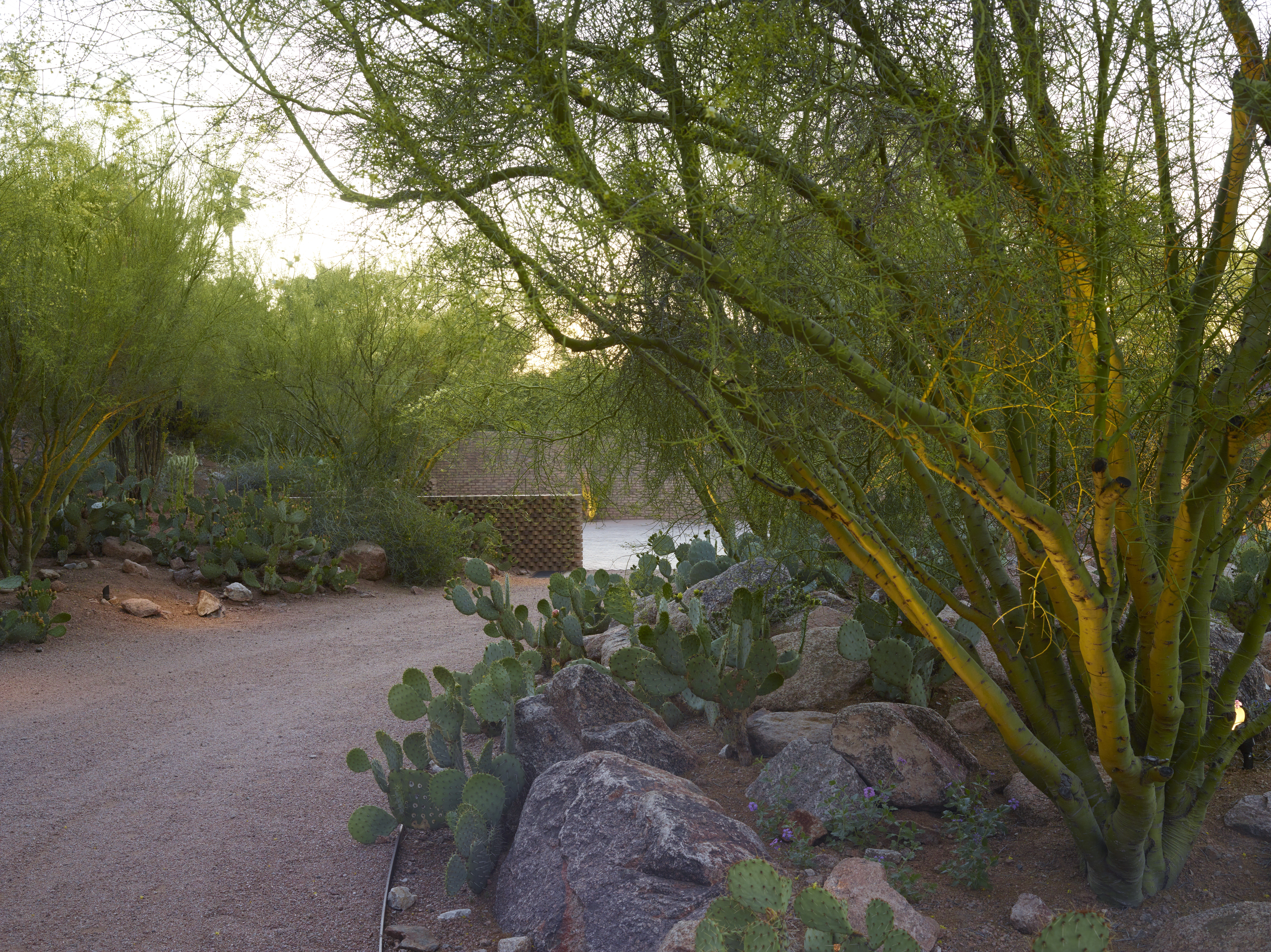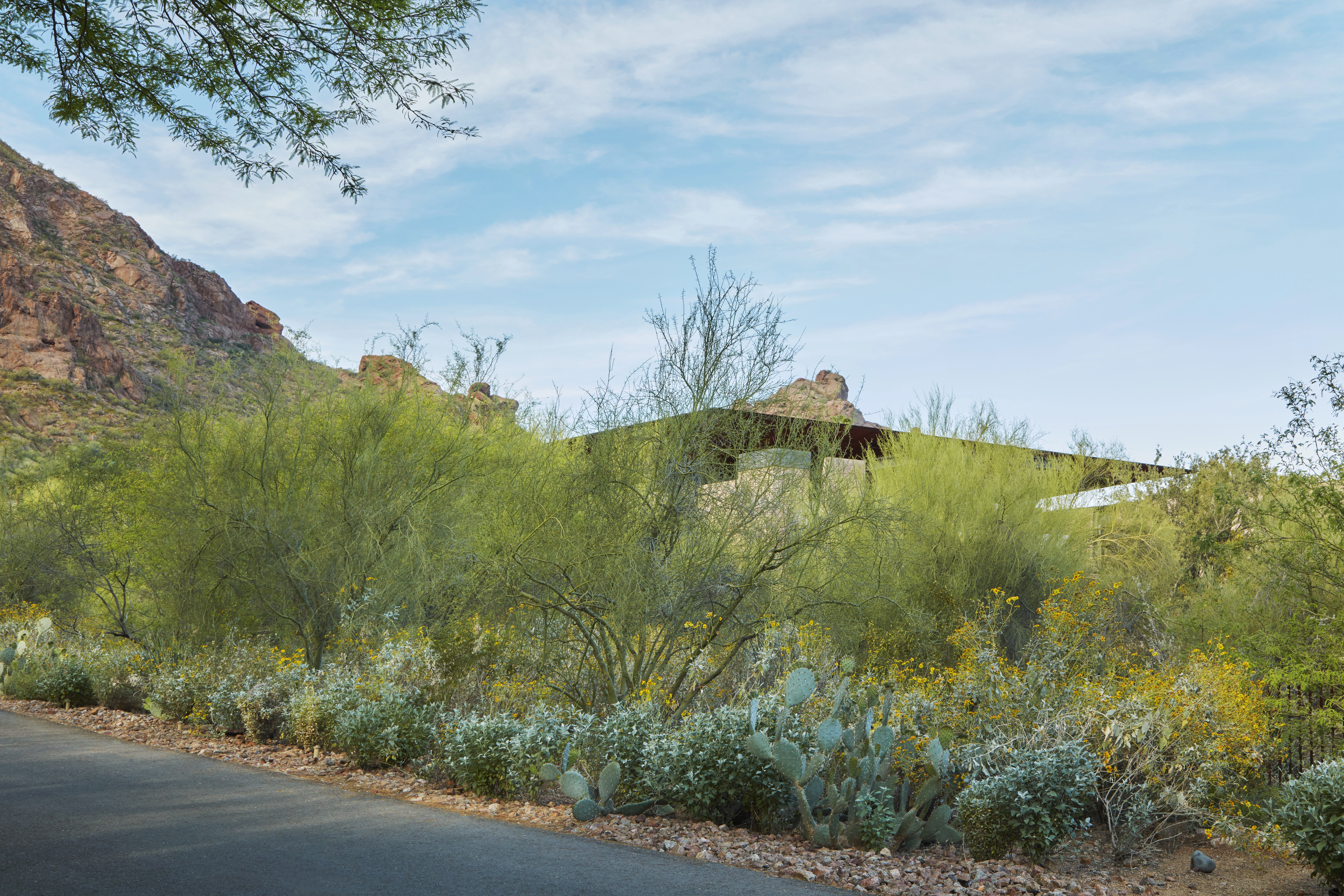 Ghost Wash located on a two and half acre site at the top of the bajada / alluvial fan of Camelback Mountain; the majestic mountain is a prominent landmark linking the Arizona cities of Phoenix, Paradise Valley and Scottsdale. The site with a cross slope of 37’ in the south-north direction is situated between two desert washes carrying stormwater through the site to the valley below. The collaborative effort between the design team and client transformed the property into a legacy residence, deep appreciation for desert plant life, advocacy for desert conservation and sustainability. Removing a 20’ tall Oleander hedge around the perimeter of the site opened up views to the adjacent mountains, a water intensive 1970s plant palette and 6,000 square feet of turf were removed, reconnecting the site to its surroundings with cacti, wildflowers and grasses native to Camelback Mountain. Because the client desired a mature landscape from day one, the revegetation process began four years prior to home completion. This native landscape has become a model for the Town of Paradise Valley.