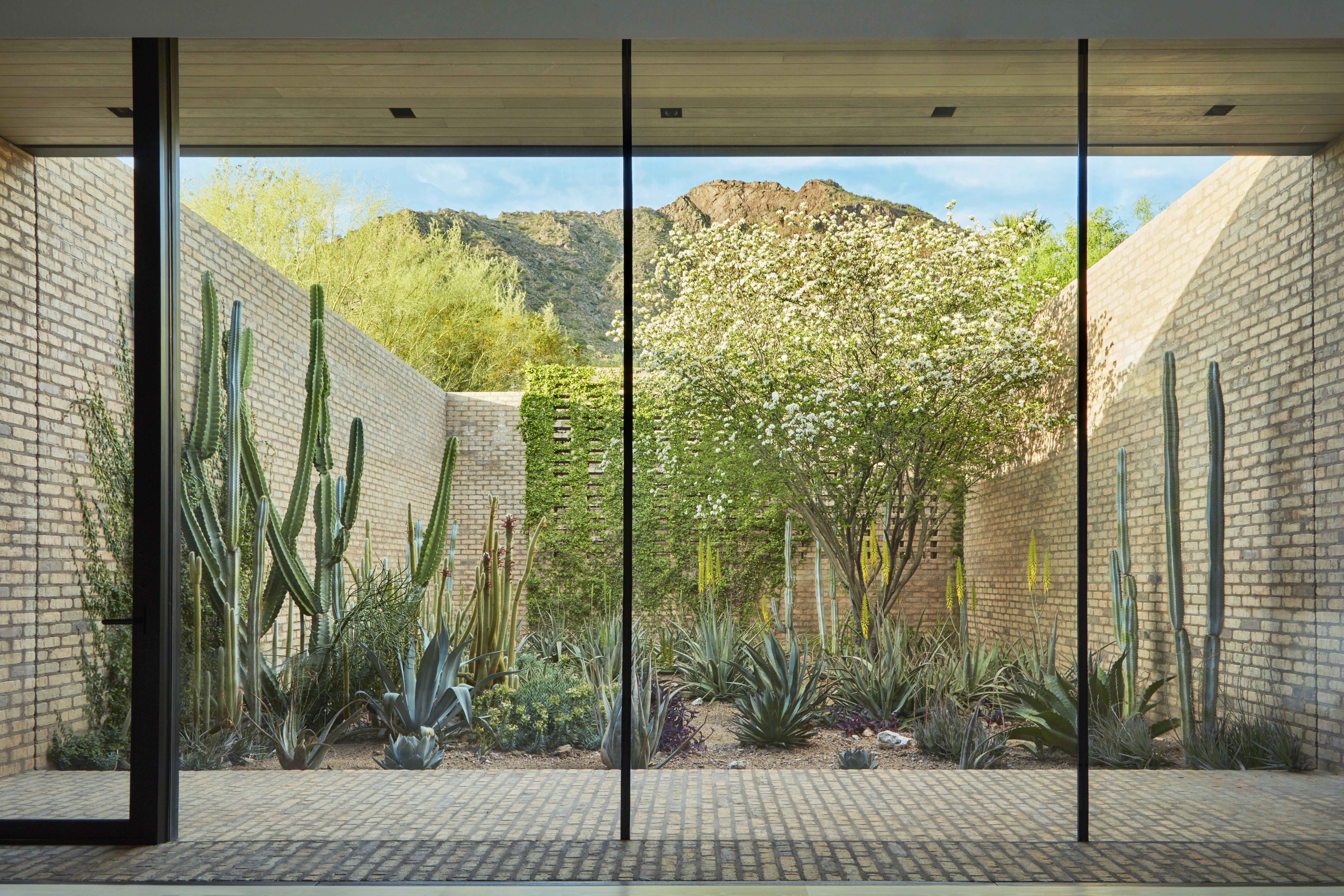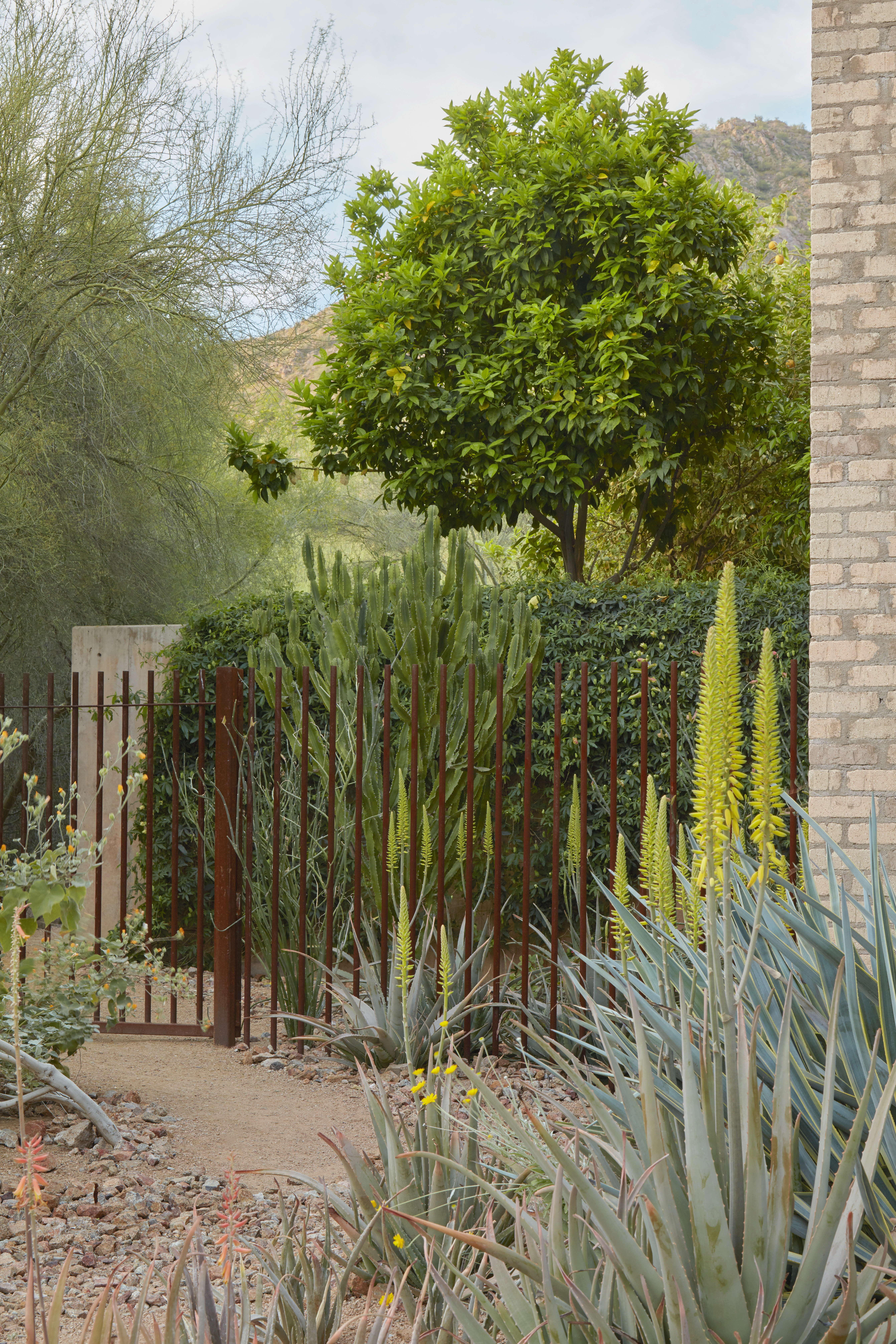Floor to ceiling glass windows generously bring the garden views into the house and make indistinct the line between indoor and outdoor. A majority of specimens can thrive on rainwater alone after establishment, require no fertilizer, little to no pruning, and conversely provide a rich and lively habitat for a multitude of wildlife. The small citrus grove, one of Arizona’s five ‘Cs’ (Cotton, Citrus, Copper, Cattle, Climate) boasts different cultivars of citrus trees, each providing sensory enjoyment when in bloom; their bountiful fruit is donated to local homeless shelters.