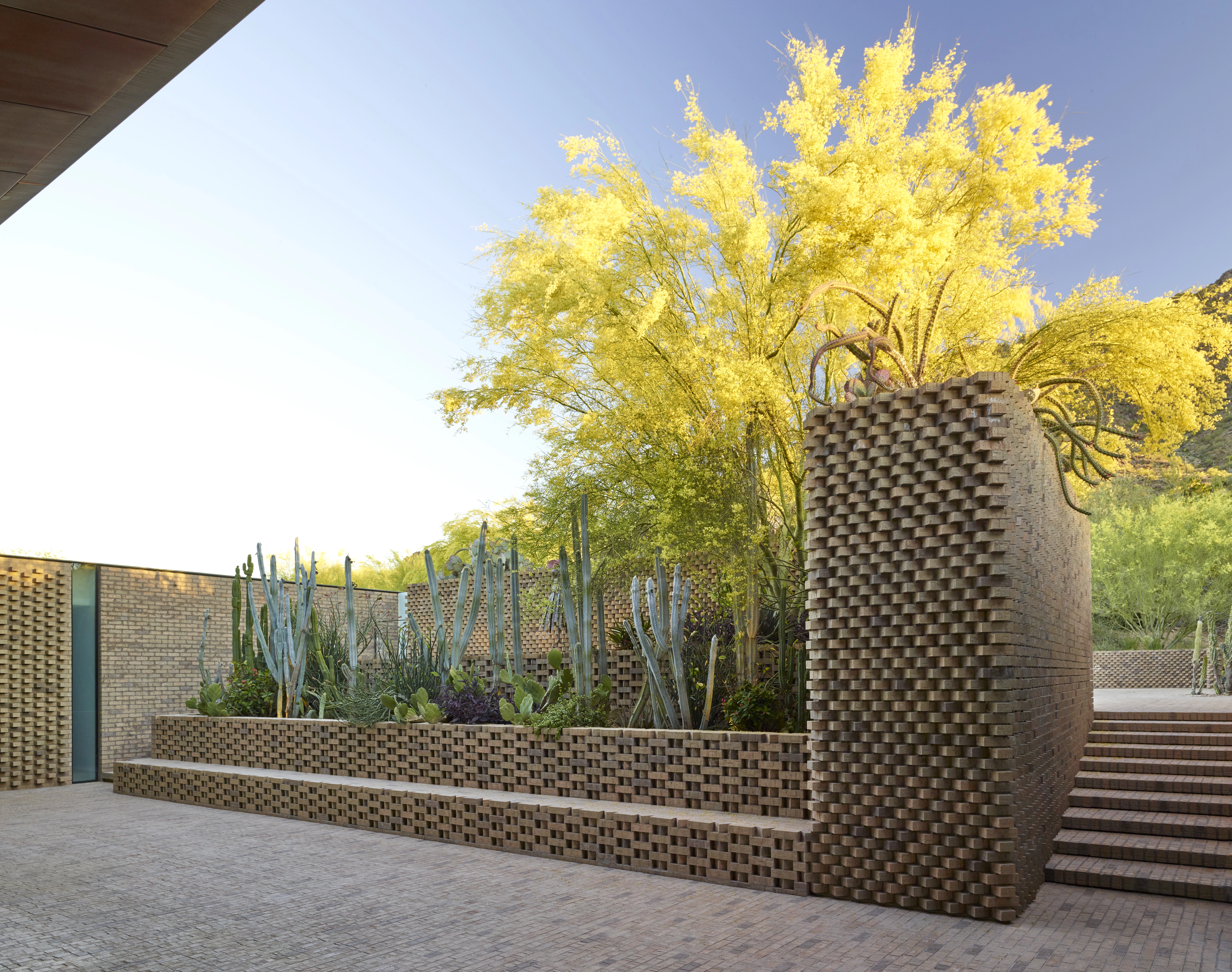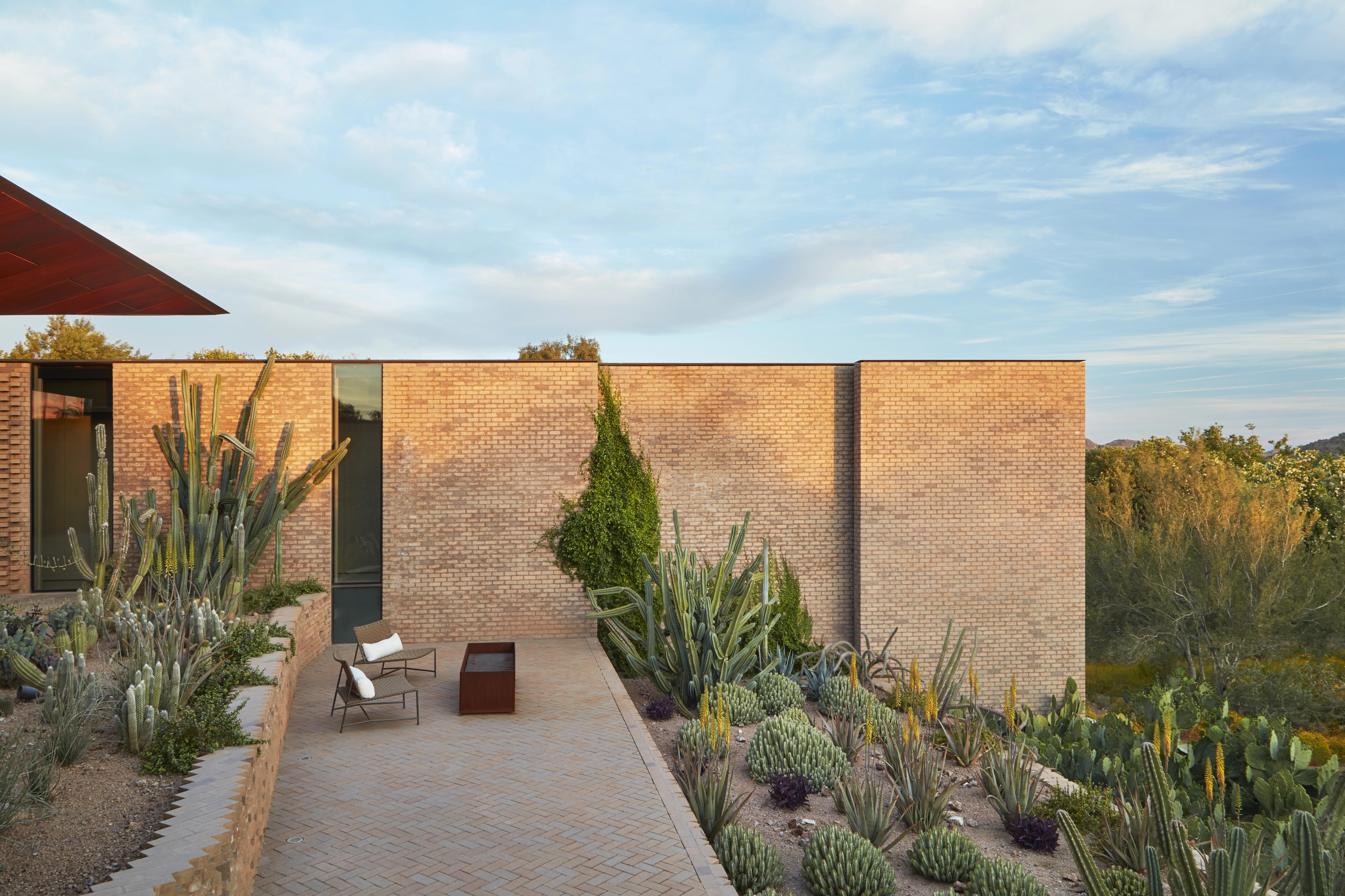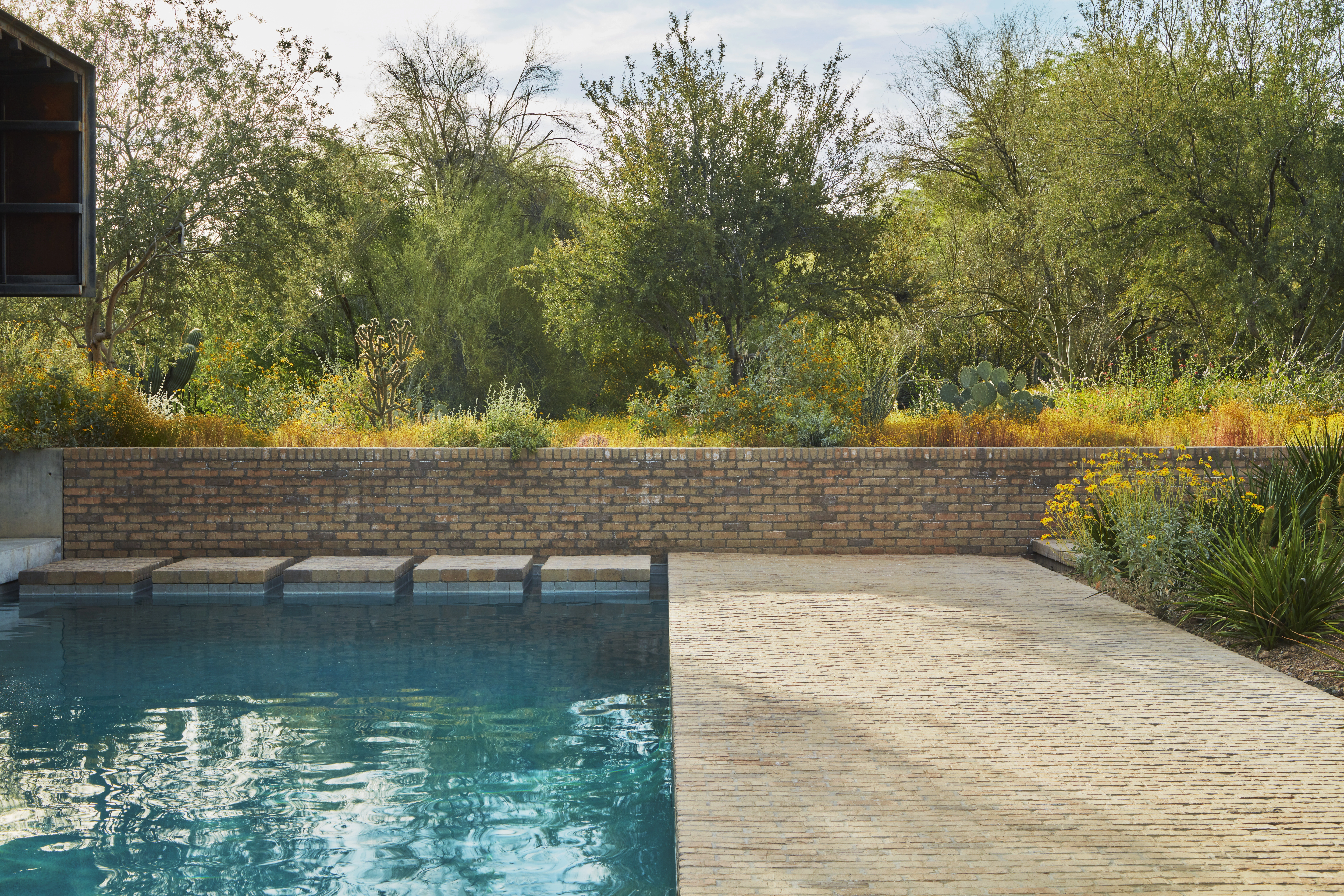 The Sonoran Desert is the wettest desert on Earth. It is characterized by this due to the large amount of rains it receives during the monsoons and winter months. The desert receives under eight (8) inches of rain annually. Due to the lack of water in Arizona it is important to capture all rainwater as a source of supplemental irrigation. The center core (Ghost Wash), flanked by two tumbled brick building bars of the residence, is an infrastructure amenity, utilizing all the storm water captured by the massive floating roof. Cascading terraces of alternating patio and garden planters create the ‘Ghost Wash’, the third wash running through the site. The last terrace is a steel vessel/cistern holding all the roof water and storing the runoff. Passively releasing the rainwater through small openings in the face of the vessel irrigating the small warm-season grass area and surrounding native landscape. The client initially did not desire grass and felt it was irresponsible in the desert, though they had a young child and wanted her to be active outside during the hotter months, which was a relief during the pandemic. The grass area is watered with an underground watering system and seasonal supplemental water from the monsoon storms. This small turf area plays an important role in the desert landscape, reducing water runoff and carbon dioxide emissions, as well as mitigate the heat.